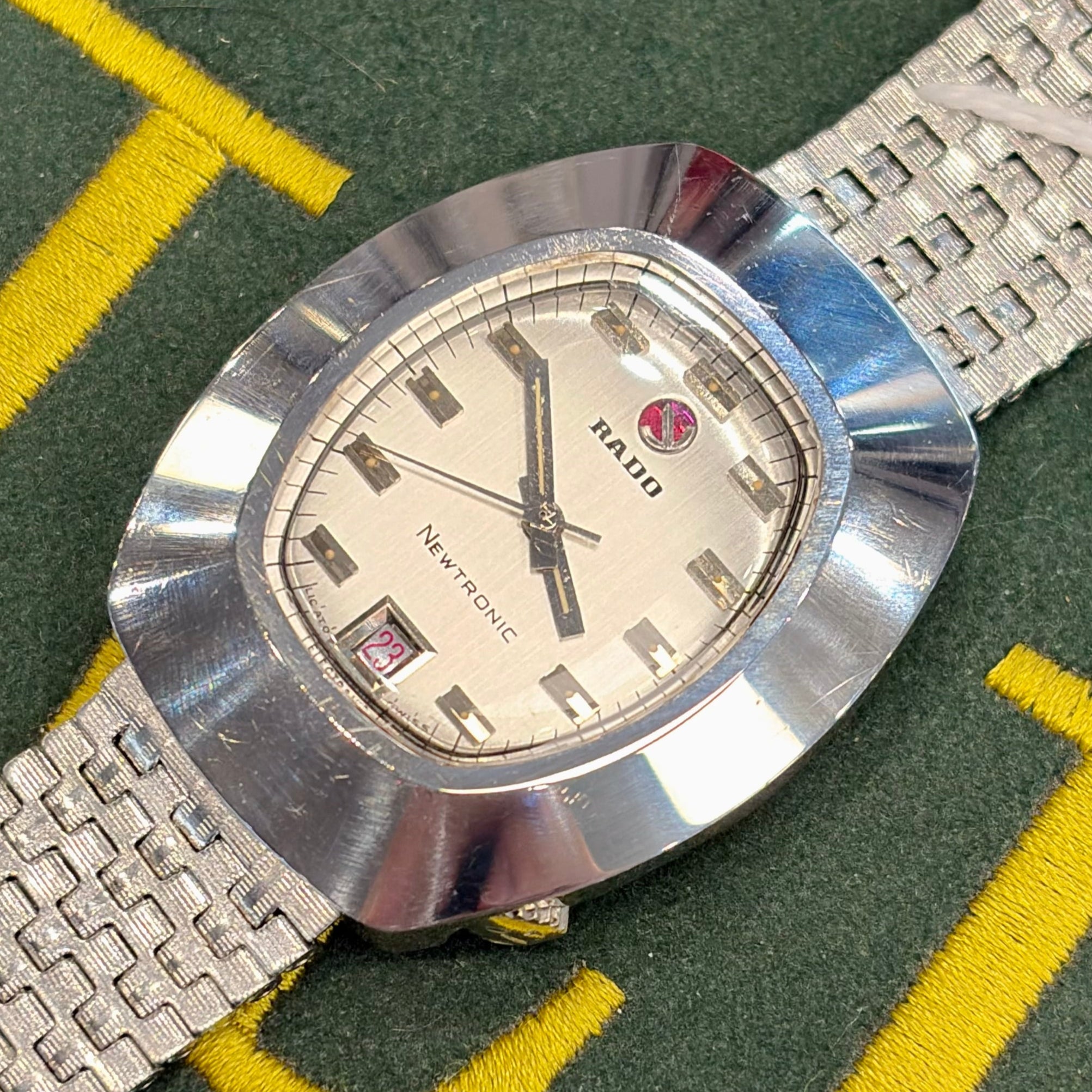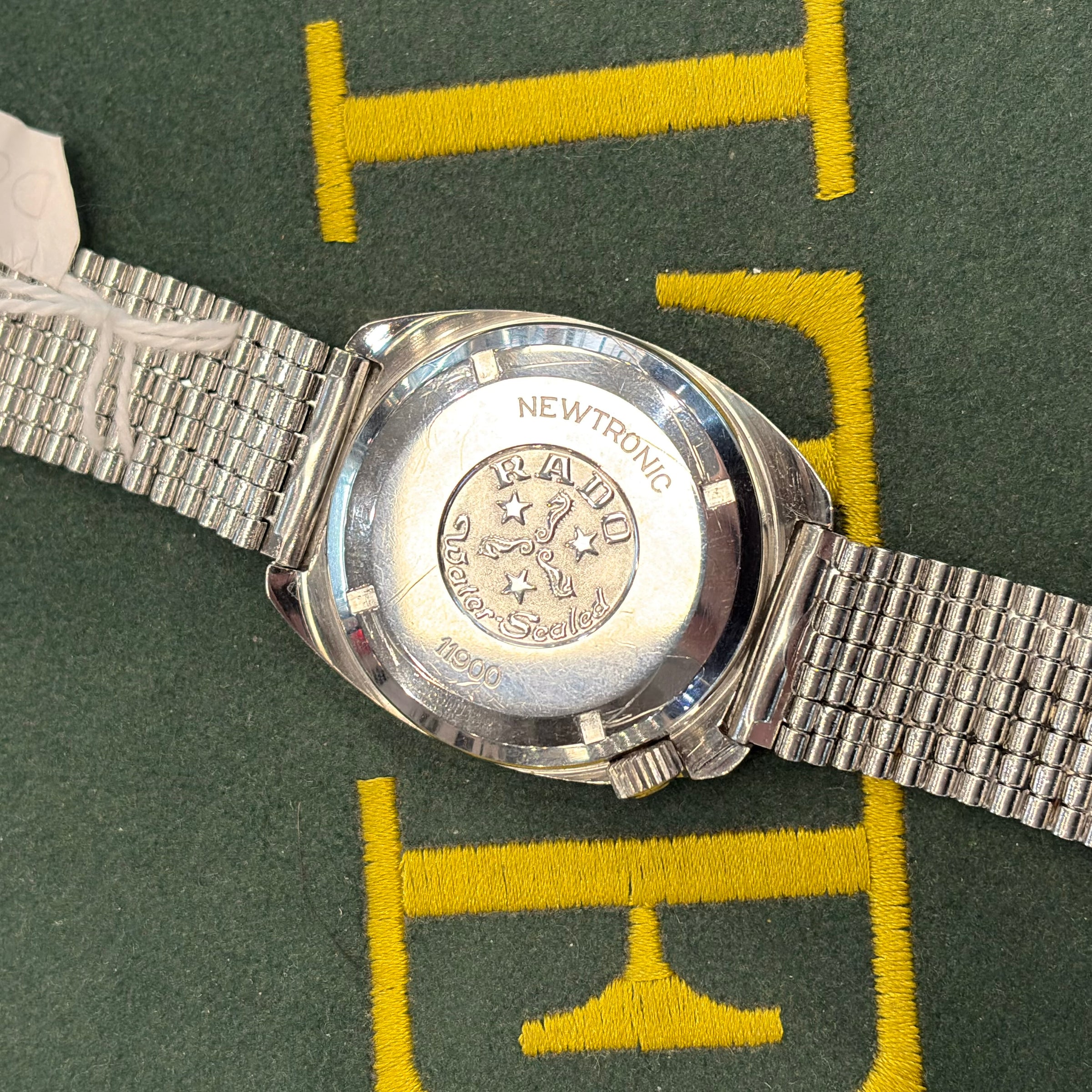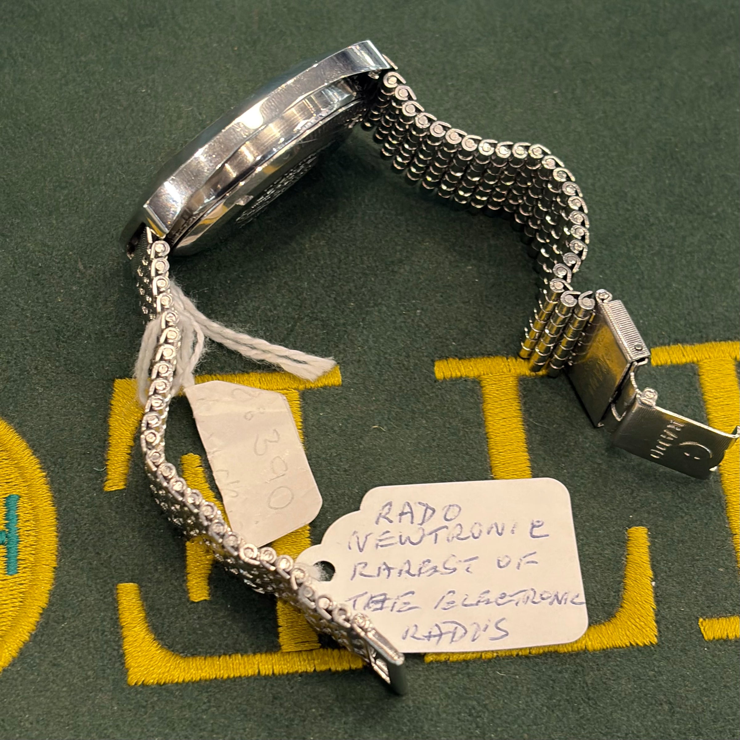 This rare Rado Newtronic is a vintage timepiece from the 1970s, notable for its electromechanical movement—a precursor to modern quartz technology. This model features a distinctive design, often with a stainless steel case and integrated bracelet. The dial typically showcases the Rado logo and the "Newtronic" designation, reflecting its innovative mechanism.