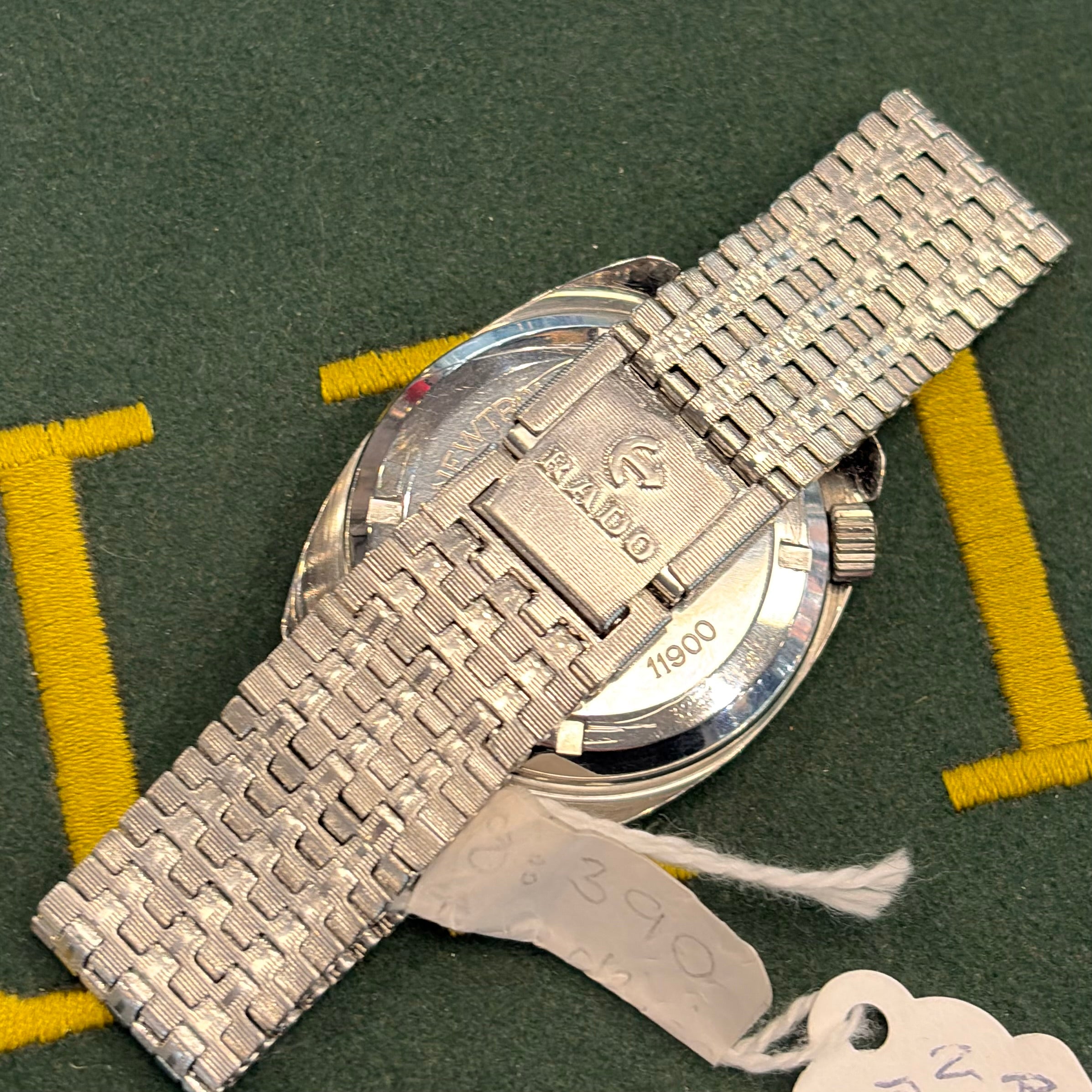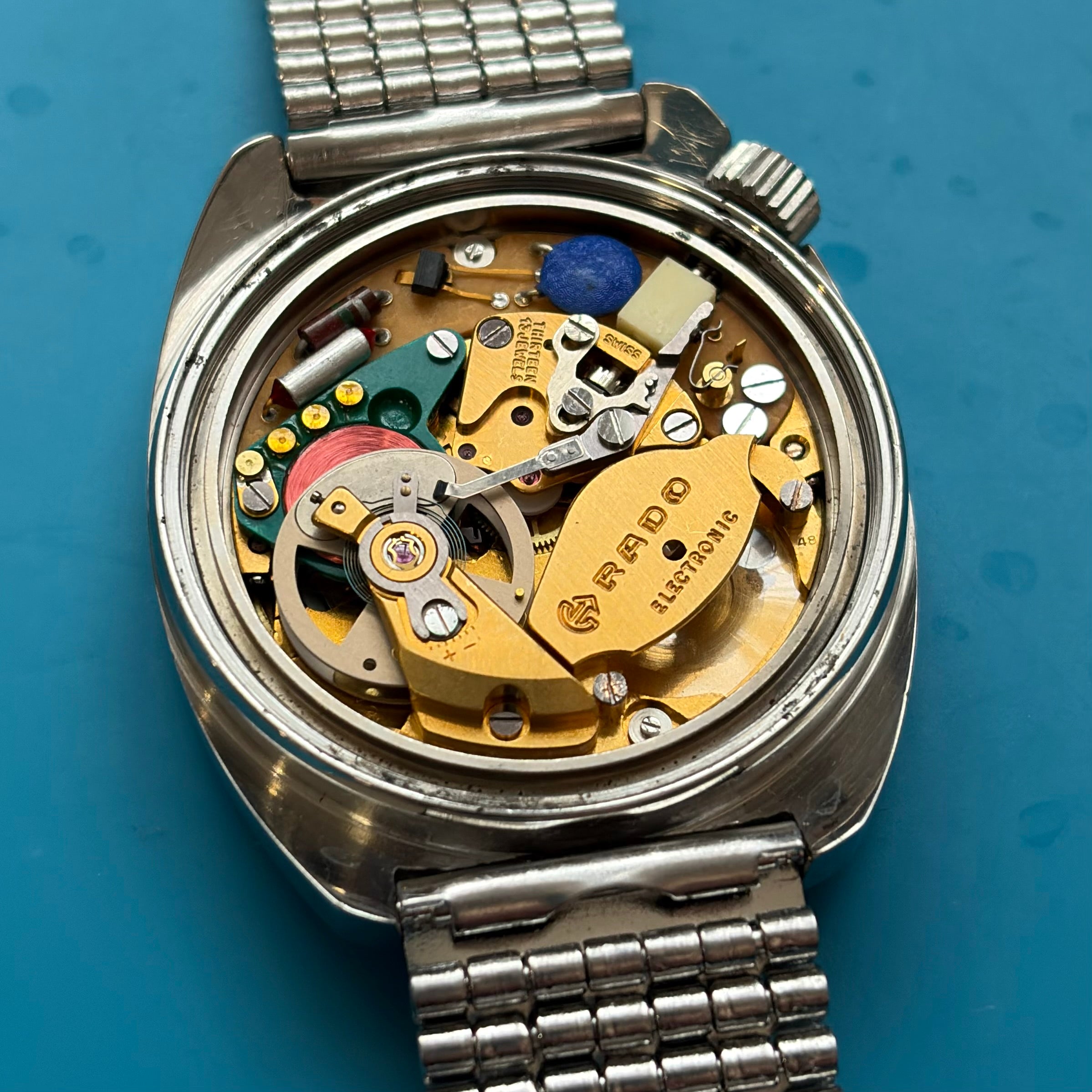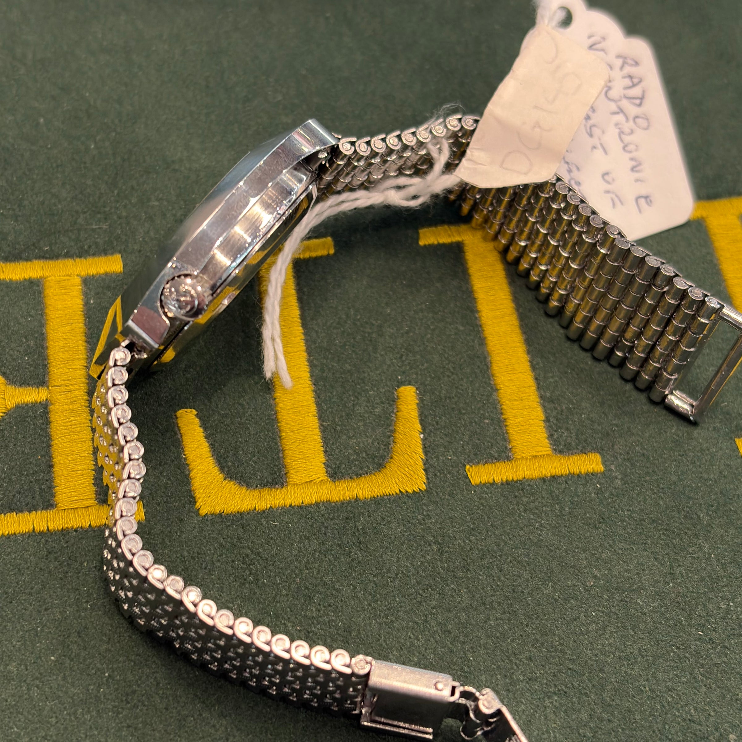 This rare Rado Newtronic is a vintage timepiece from the 1970s, notable for its electromechanical movement—a precursor to modern quartz technology. This model features a distinctive design, often with a stainless steel case and integrated bracelet. The dial typically showcases the Rado logo and the "Newtronic" designation, reflecting its innovative mechanism.