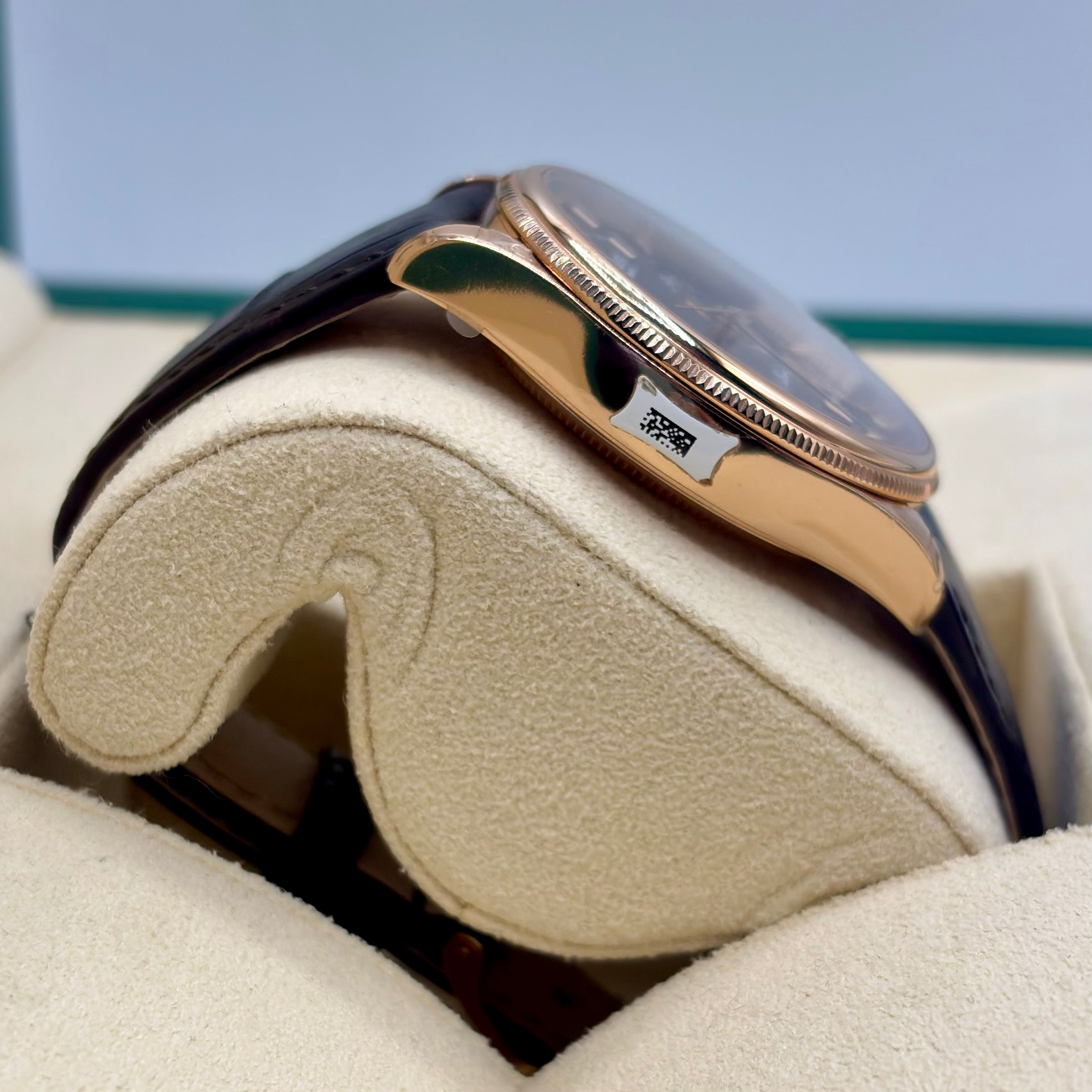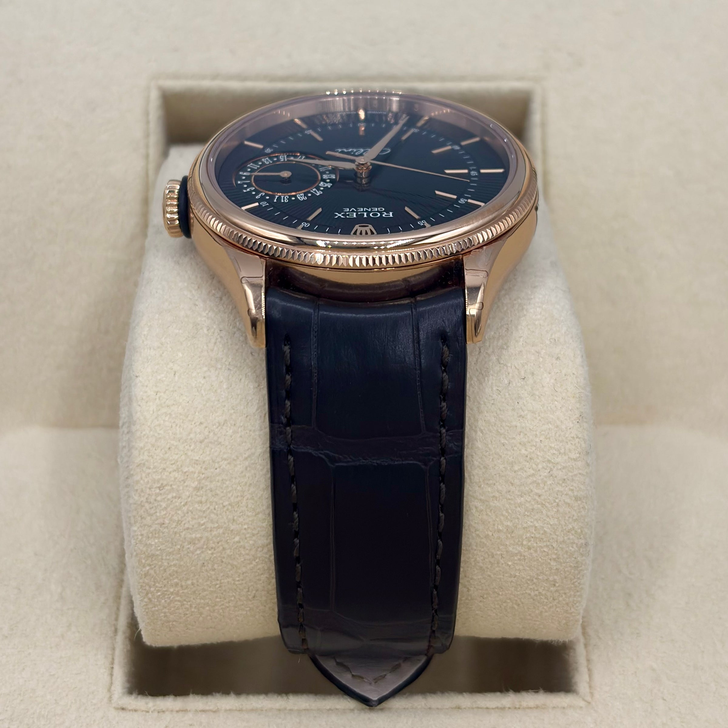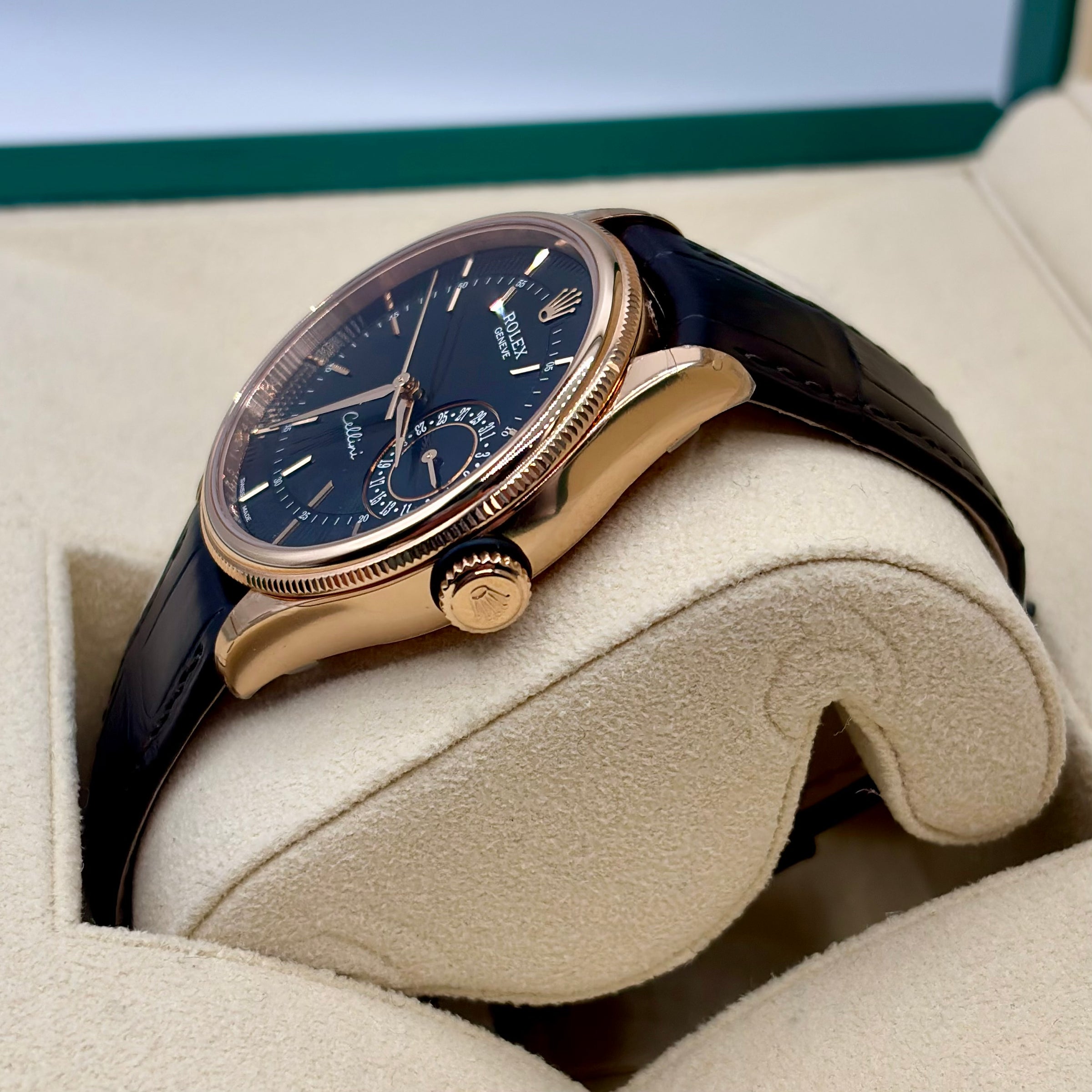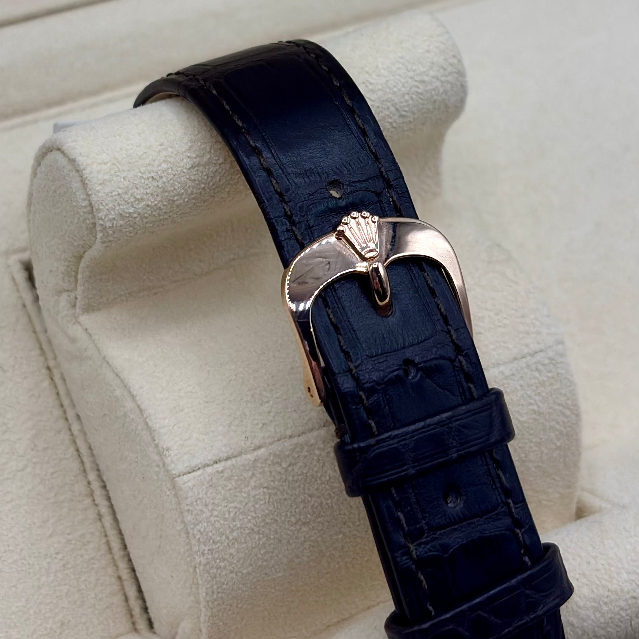 This Rolex Cellini Date is crafted in Rolex's proprietary 18k 'Everose' rose gold, featuring a 39mm case with an elegant fluted bezel. The rich black dial with intricate finishing contrasts beautifully with the rose gold. Rolex’s highly accurate automatic calibre 3165 movement and 50 meters of water-resistance provides uncommon durability for a dress watch. The watch is paired with a high-quality Rolex alligator leather strap, secured by a matching solid rose gold buckle.