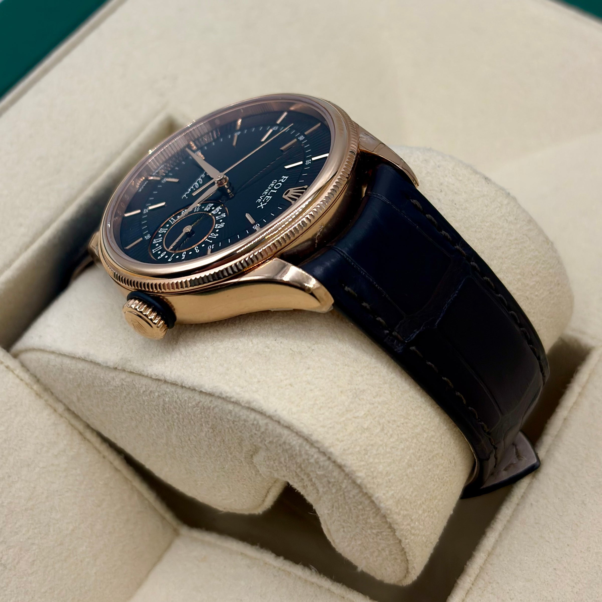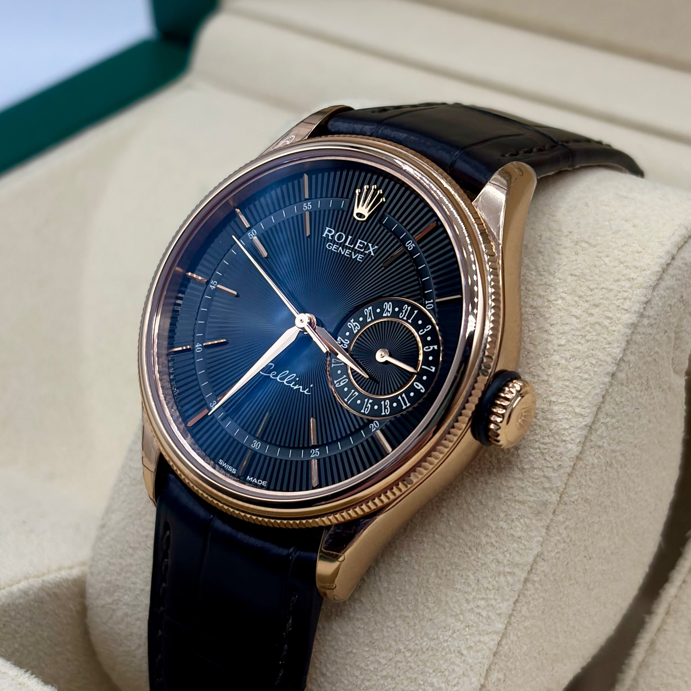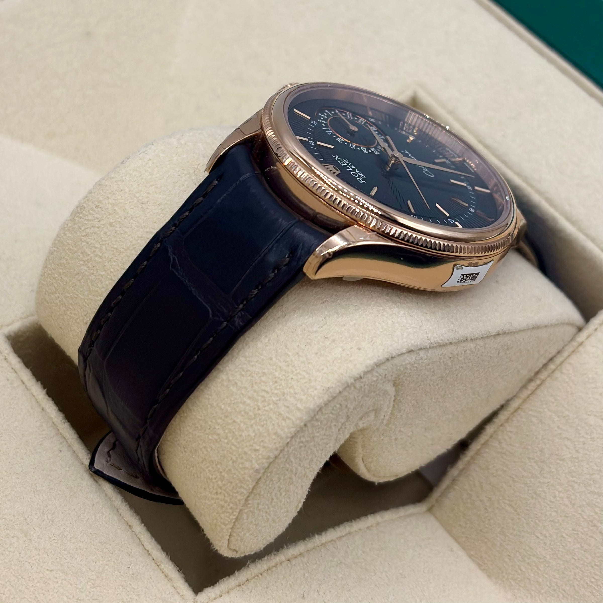 This Rolex Cellini Date is crafted in Rolex's proprietary 18k 'Everose' rose gold, featuring a 39mm case with an elegant fluted bezel. The rich black dial with intricate finishing contrasts beautifully with the rose gold. Rolex’s highly accurate automatic calibre 3165 movement and 50 meters of water-resistance provides uncommon durability for a dress watch. The watch is paired with a high-quality Rolex alligator leather strap, secured by a matching solid rose gold buckle.