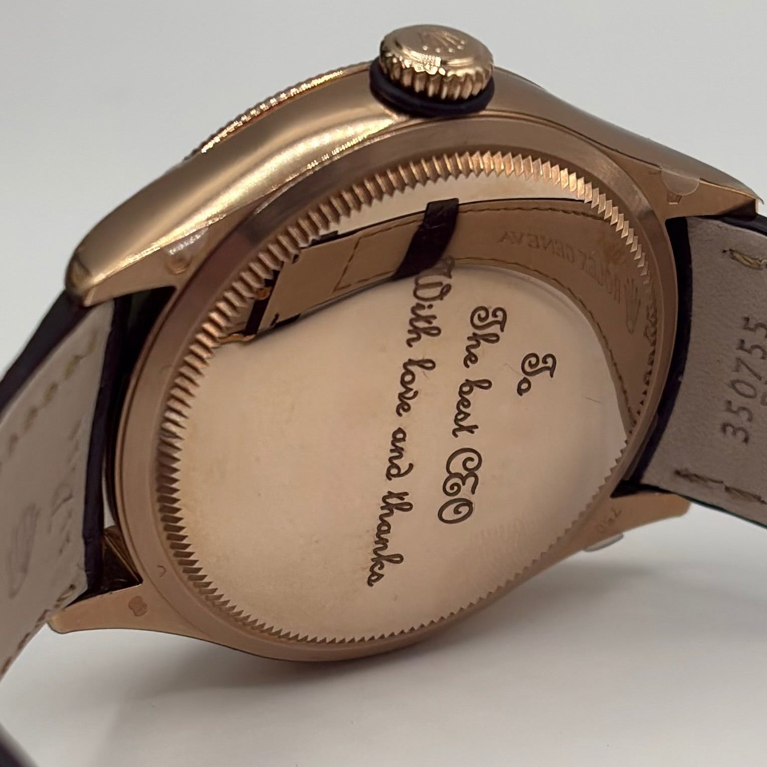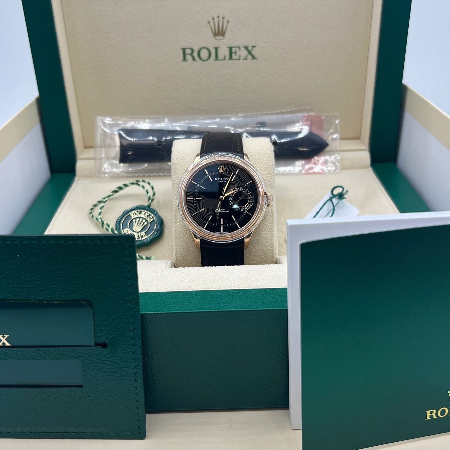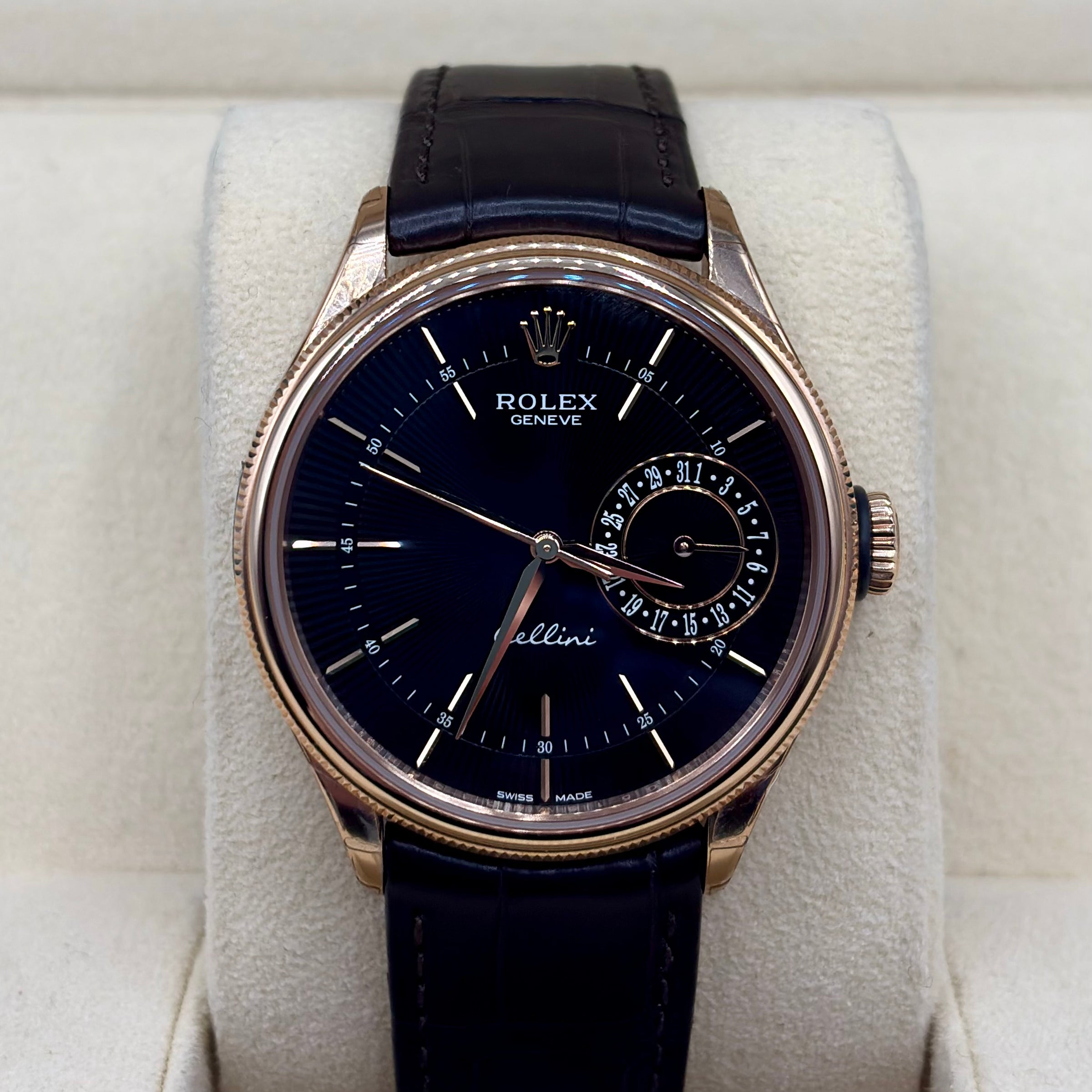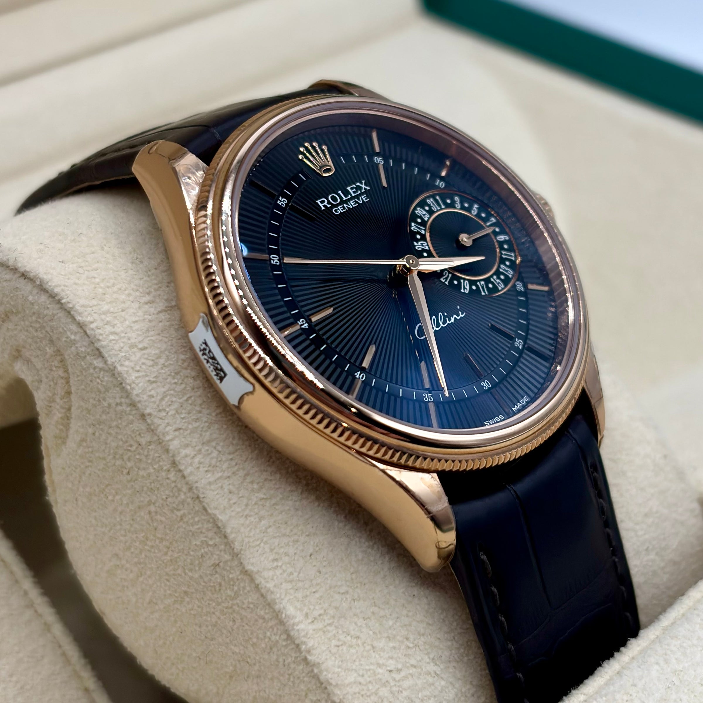 This Rolex Cellini Date is crafted in Rolex's proprietary 18k 'Everose' rose gold, featuring a 39mm case with an elegant fluted bezel. The rich black dial with intricate finishing contrasts beautifully with the rose gold. Rolex’s highly accurate automatic calibre 3165 movement and 50 meters of water-resistance provides uncommon durability for a dress watch. The watch is paired with a high-quality Rolex alligator leather strap, secured by a matching solid rose gold buckle.