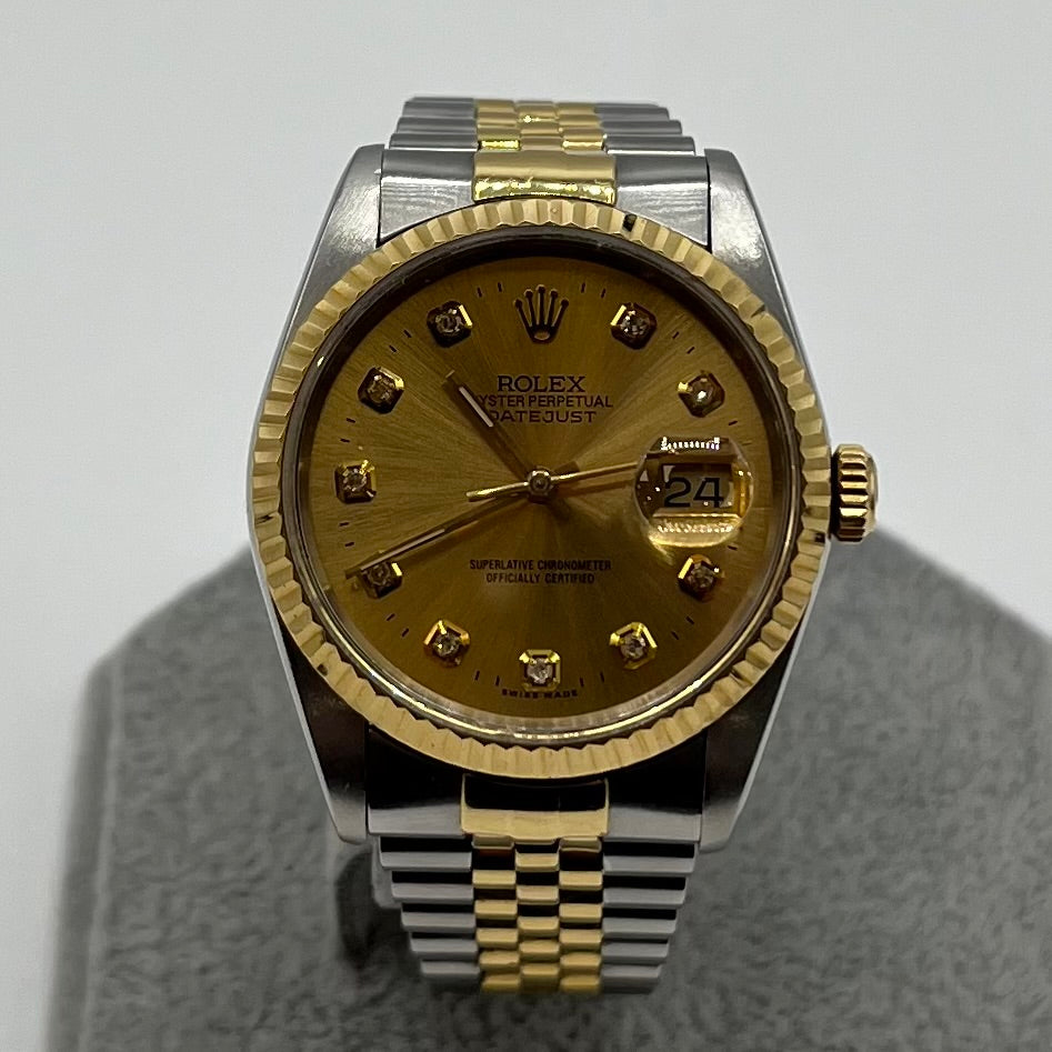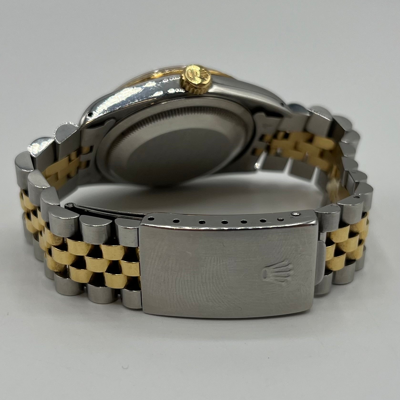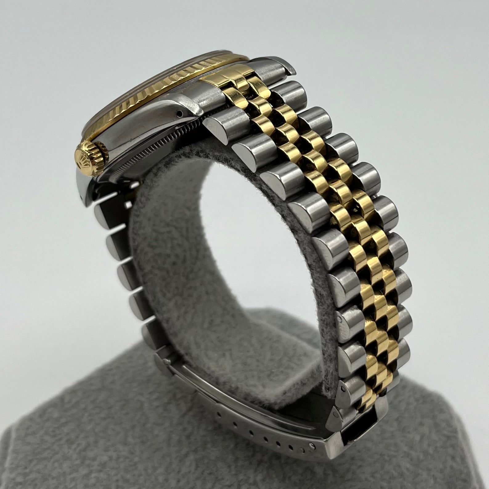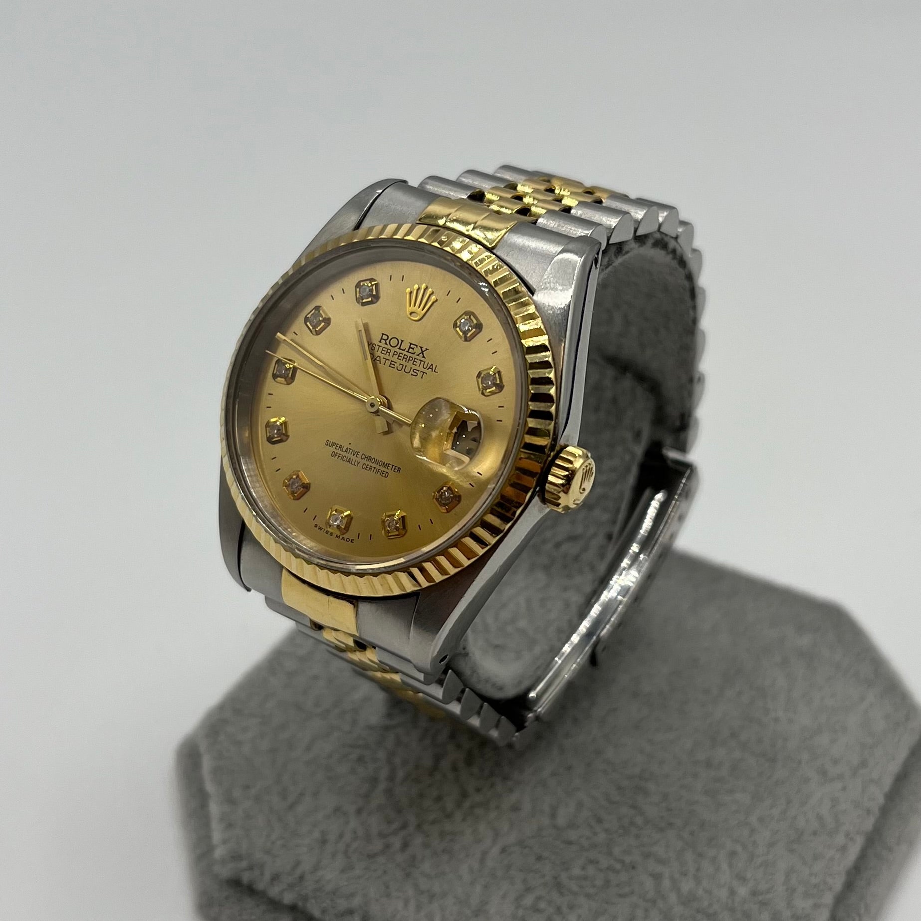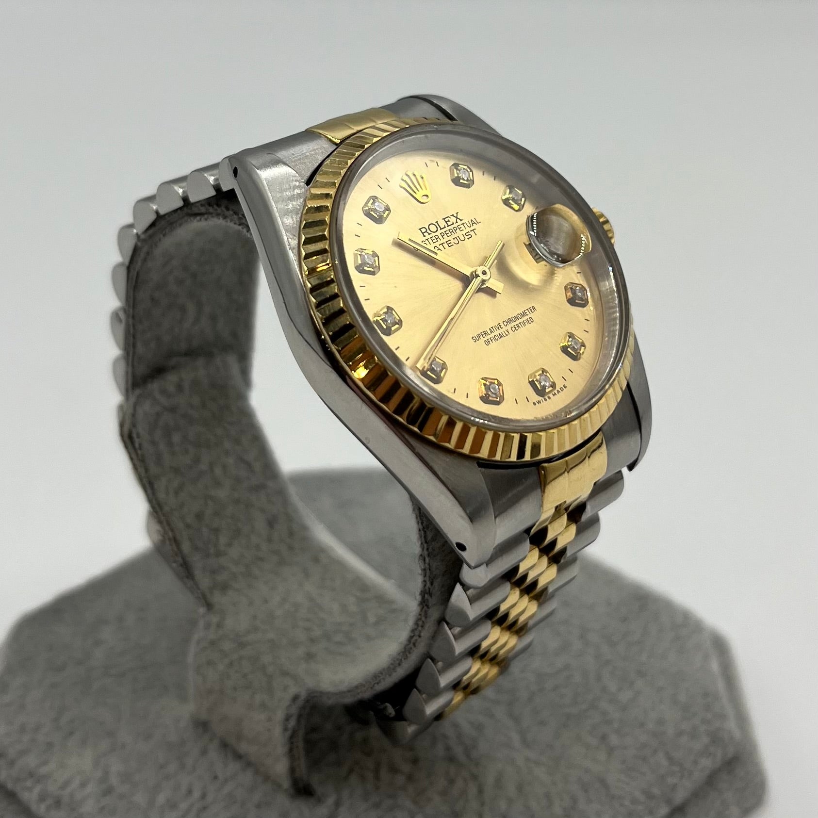 This Rolex Datejust 16233 from 1989 blends luxury and functionality. The 36mm stainless steel case is complemented by an 18k yellow gold fluted bezel. The champagne dial is adorned with factory-set diamond hour markers of the highest quality. Protected by a scratch-resistant sapphire crystal with a cyclops lens over the date aperture at 3 o'clock, the dial ensures optimal readability. Powered by the self-winding Rolex Calibre 3135 movement, it boasts a 48-hour power reserve and COSC-certified precision. The two-tone Jubilee bracelet, combining stainless steel and 18k yellow gold, provides both comfort and sophistication, secured with a highly adjustable folding clasp.