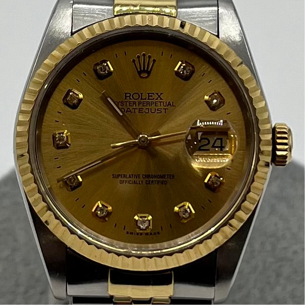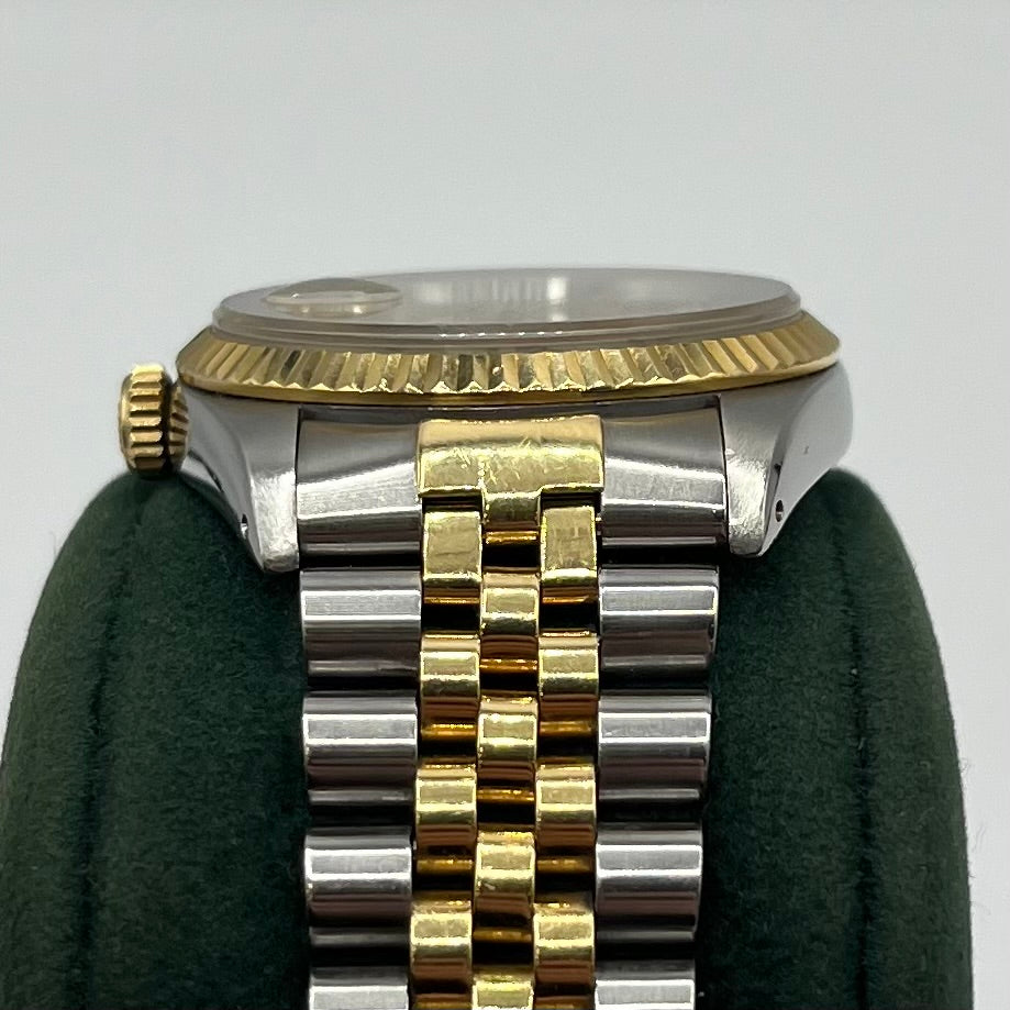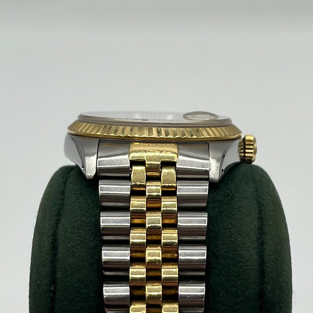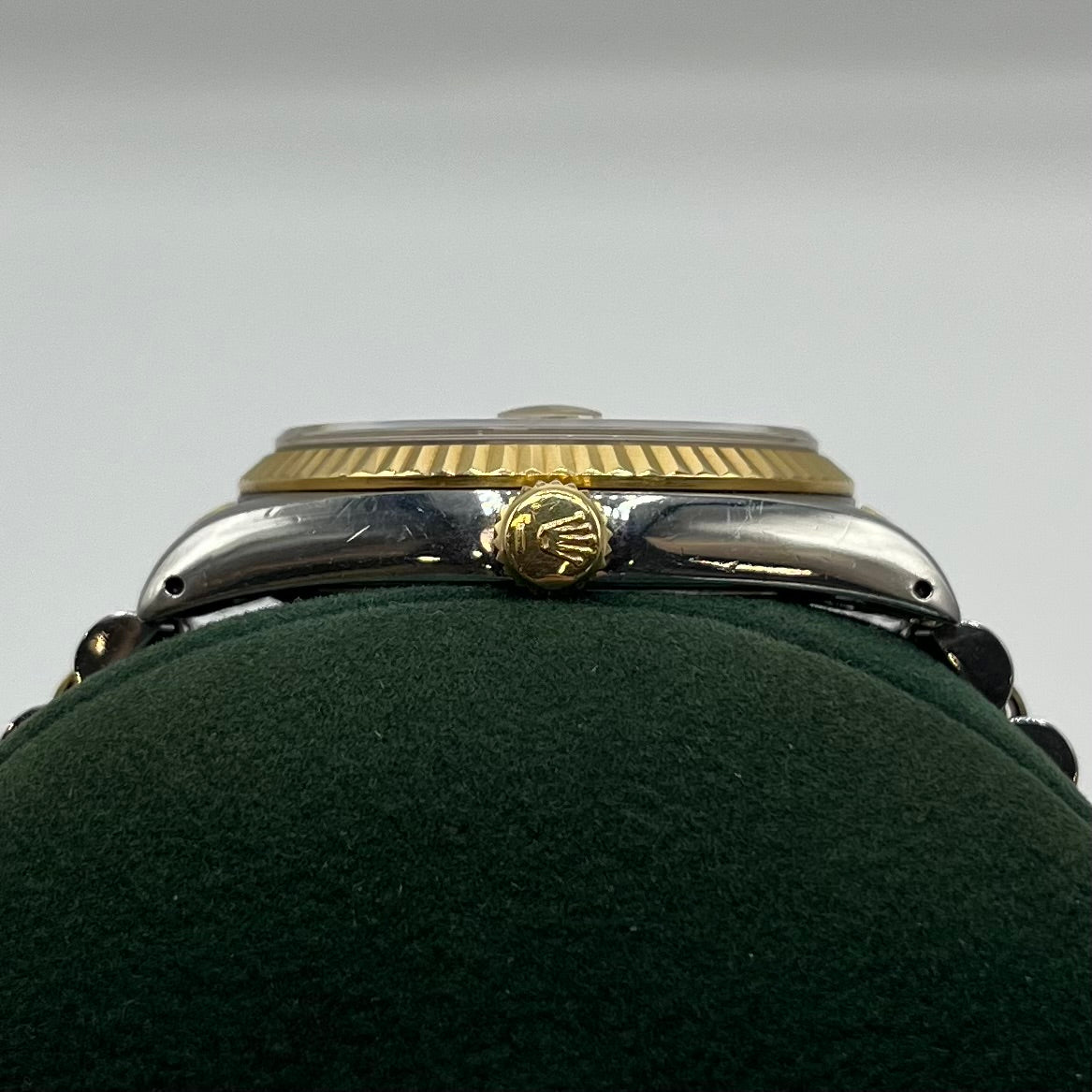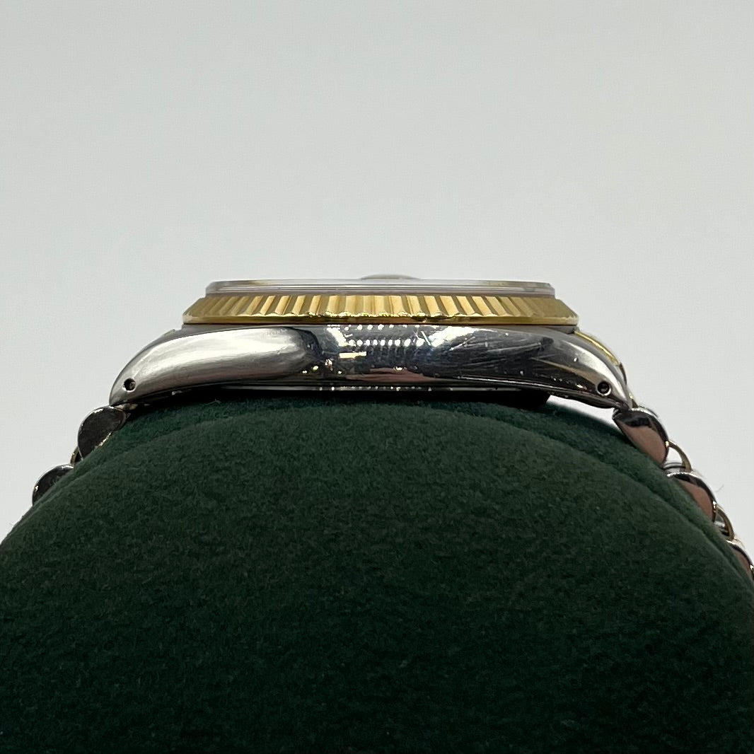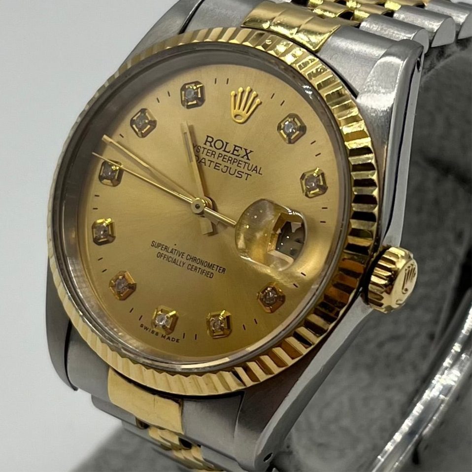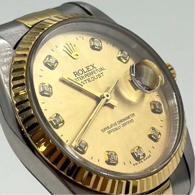 This Rolex Datejust 16233 from 1989 blends luxury and functionality. The 36mm stainless steel case is complemented by an 18k yellow gold fluted bezel. The champagne dial is adorned with factory-set diamond hour markers of the highest quality. Protected by a scratch-resistant sapphire crystal with a cyclops lens over the date aperture at 3 o'clock, the dial ensures optimal readability. Powered by the self-winding Rolex Calibre 3135 movement, it boasts a 48-hour power reserve and COSC-certified precision. The two-tone Jubilee bracelet, combining stainless steel and 18k yellow gold, provides both comfort and sophistication, secured with a highly adjustable folding clasp.