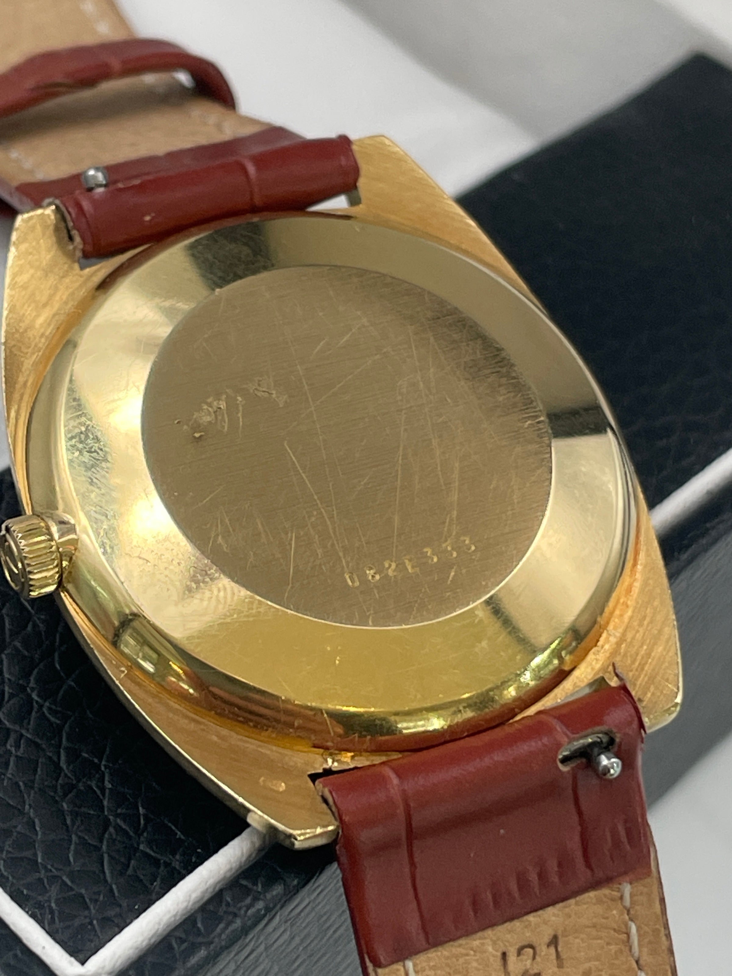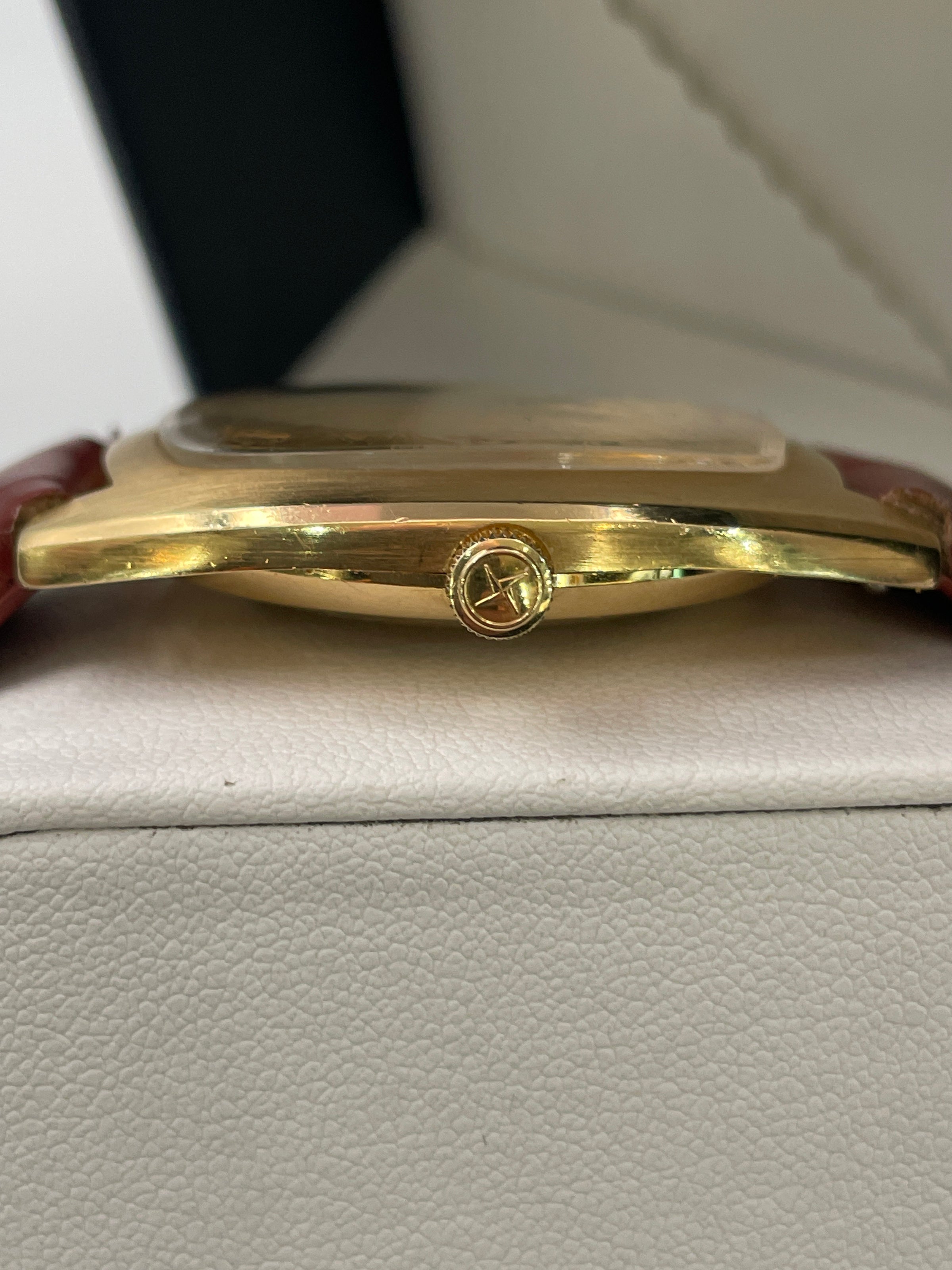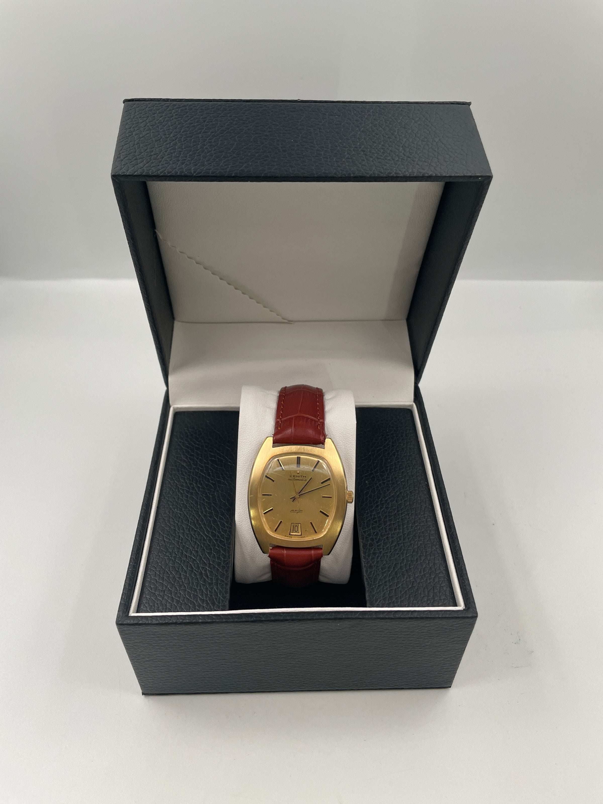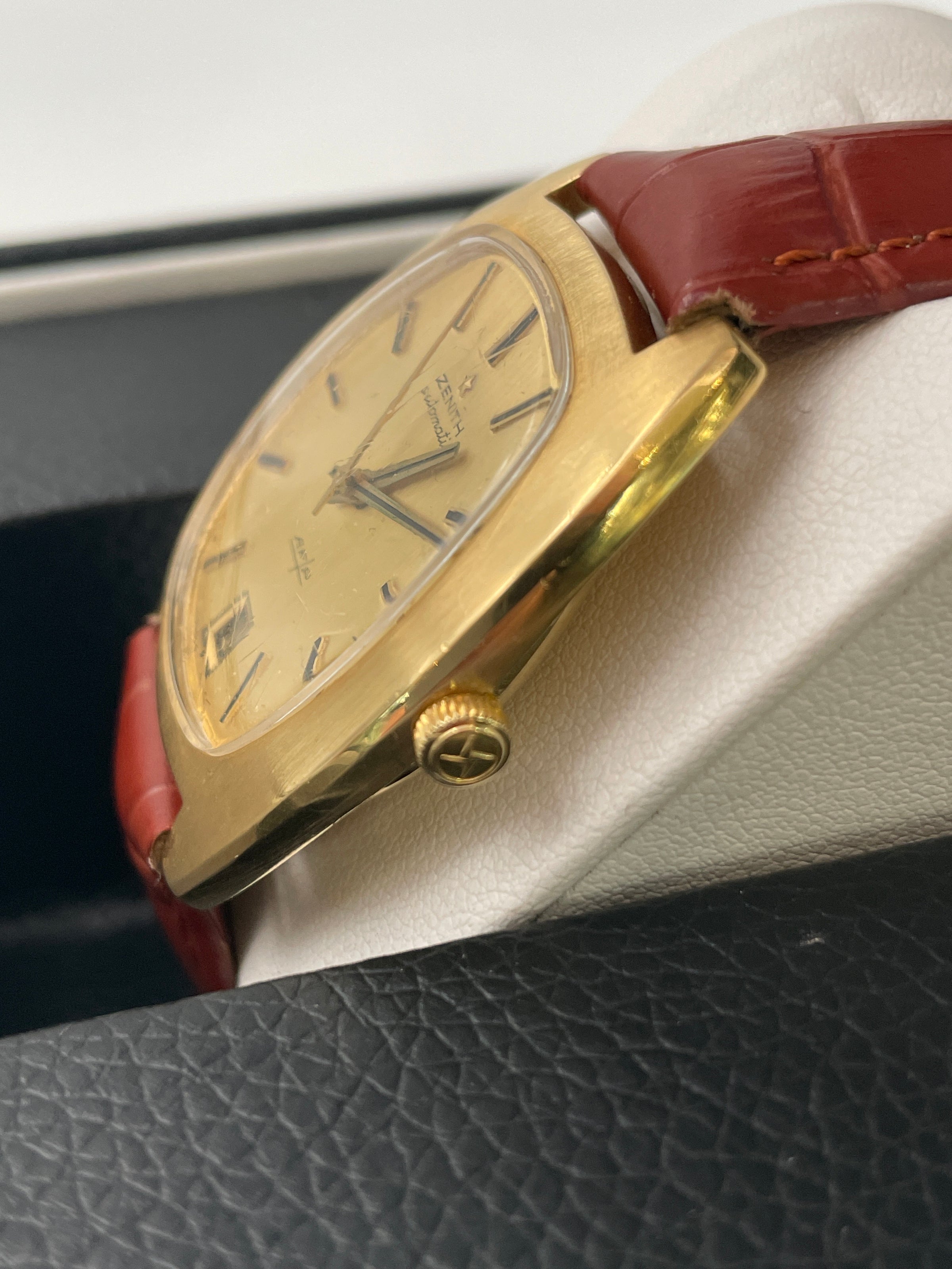 Here is a vintage watch that emanates timeless style with traditional timekeeping mechanics. Featuring an oval / rectangular gold coloured case, this watch has a gold dial as well as golden batons as hour markers. There is a date window set at the six o'clock position and has its hour, minute and second hand set centrally in the watches dial. Approximate dimensions are as follows: Case width: 35mm, Case depth: 8.9mm, Lug to lug: 40.3mm. The watch comes with a Brown leather strap (Not Zenith) with a gold coloured buckle.