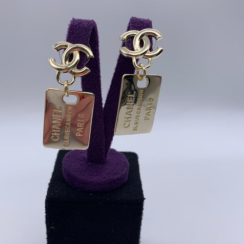 Chanel CC Gold Plated Drop Earrings With Dog Tag