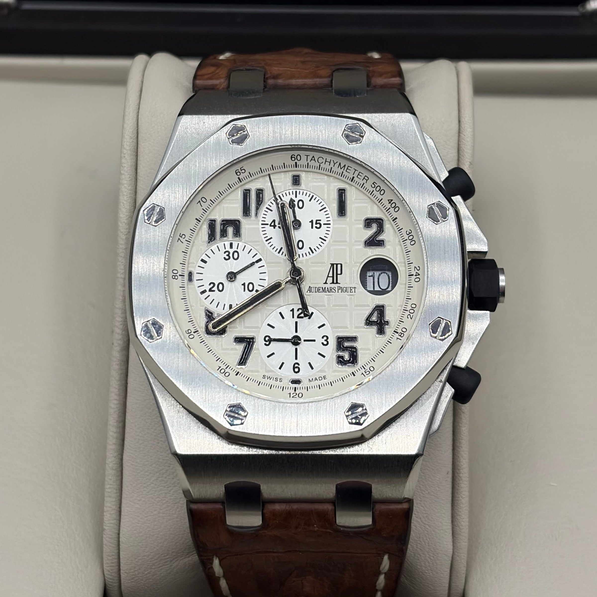 The Audemars Piguet Royal Oak Offshore “Safari is a striking 42 mm chronograph with a robust stainless steel case approximately 14.3 mm thick. It features the signature octagonal bezel secured with eight screws, and a glare-proofed sapphire crystal protecting the dial. The silver “Mega-Tapisserie” (waffle) pattern dial is adorned with large luminous Arabic numerals, flat silver sub-dials, and a date window at 3 o’clock. This model is powered by the automatic calibre AP 3126/3840, which provides a power reserve of around 50-55 hours and includes the functions of hours, minutes, small seconds (at 12 o’clock), date, and chronograph. It is water-resistant to 100 metres. The strap is brown Hornback alligator leather with white stitching, paired with a stainless-steel folding clasp.
