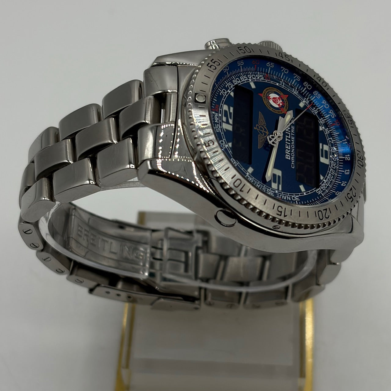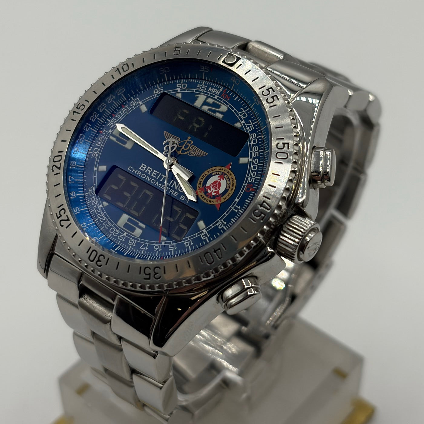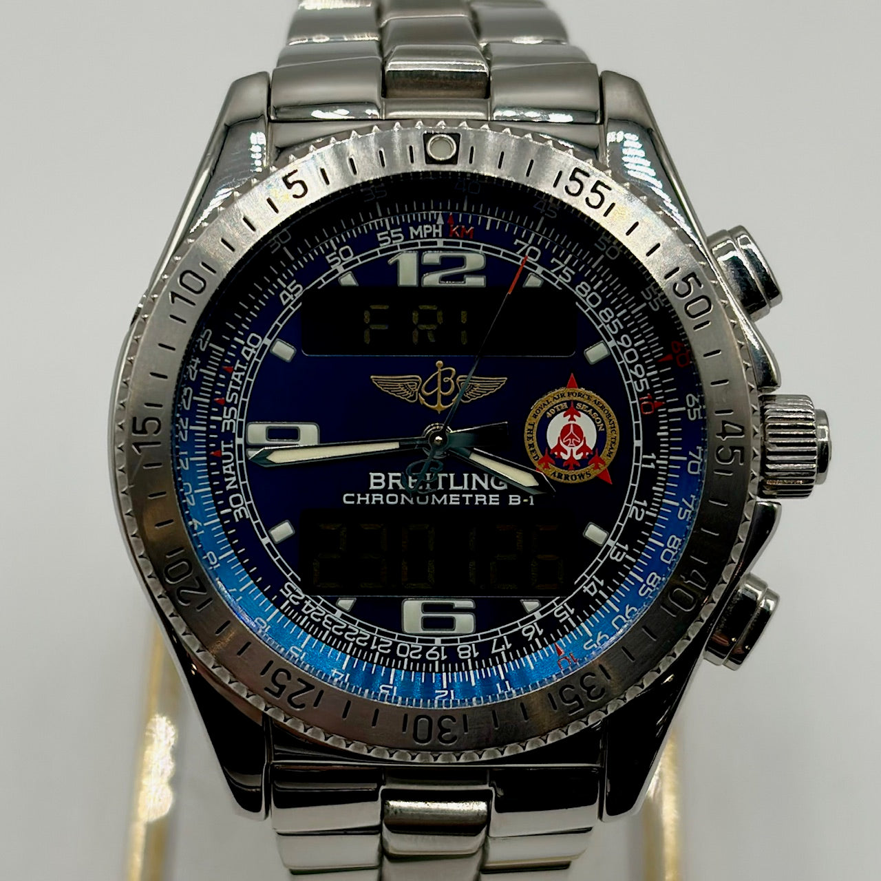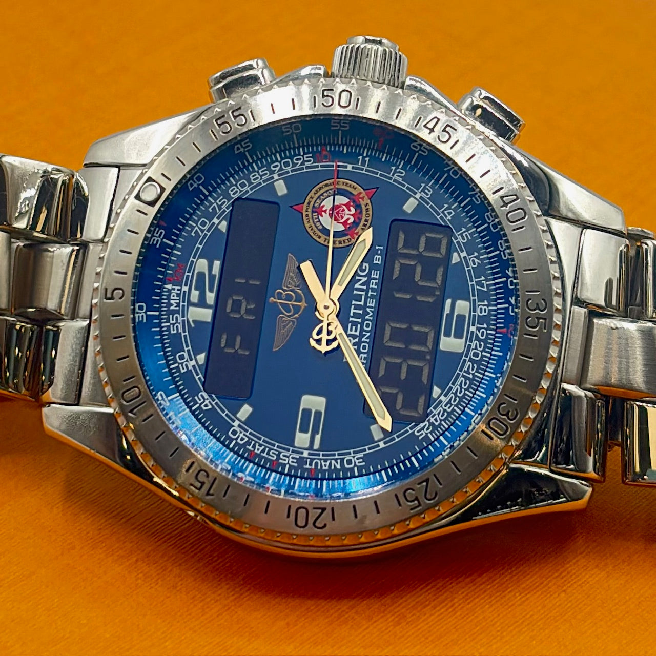 The Breitling B-1 Red Arrows Limited Edition is a highly collectible professional aviation timepiece, created in tribute to the Royal Air Force Red Arrows display team. Crafted from stainless steel, the robust 43mm case is paired with a matching bracelet and designed to withstand demanding conditions. This model features a blue multifunction dial with luminous hands and markers, complemented by digital displays that provide a range of aviation-focused functions including chronograph, alarm, countdown timer, second time zone and perpetual calendar. Powered by a thermo-compensated SuperQuartz movement, the B-1 offers exceptional precision. The Red Arrows insignia and highly limited production run of 100 makes it a standout piece for collectors..