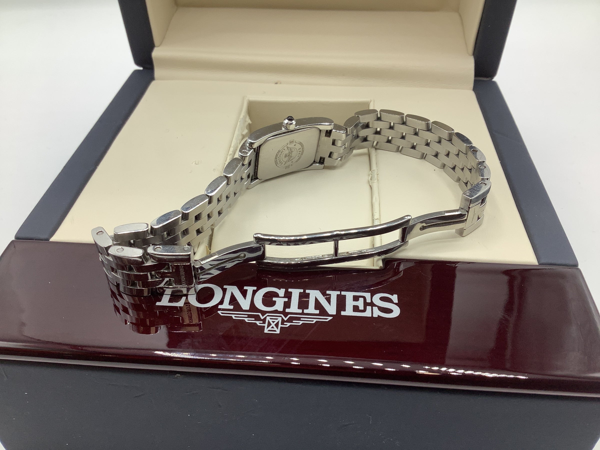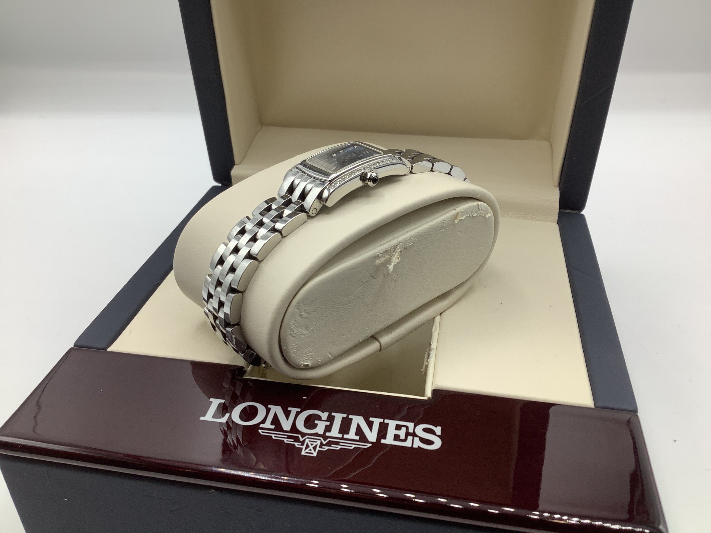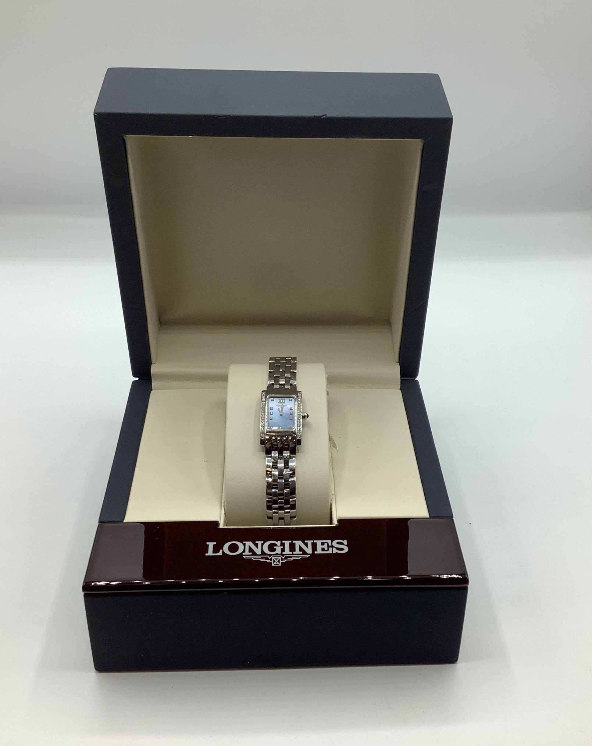 The Longines Dolce Vita L5.158.0 Diamond Set women’s watch is an elegant expression of refined Swiss watchmaking, distinguished by its luxurious detailing. Crafted in polished stainless steel, the rectangular case is enhanced with a diamond-set bezel, adding a subtle yet sophisticated brilliance. The dial features a striking blue mother-of-pearl finish, offering natural iridescence and depth, complemented by delicate hour markers and elegant hands. Powered by a Swiss quartz movement, the watch delivers reliable precision and effortless everyday wear. This watch comes with a polished metal bracelet and is protected by a scratch-resistant sapphire crystal.