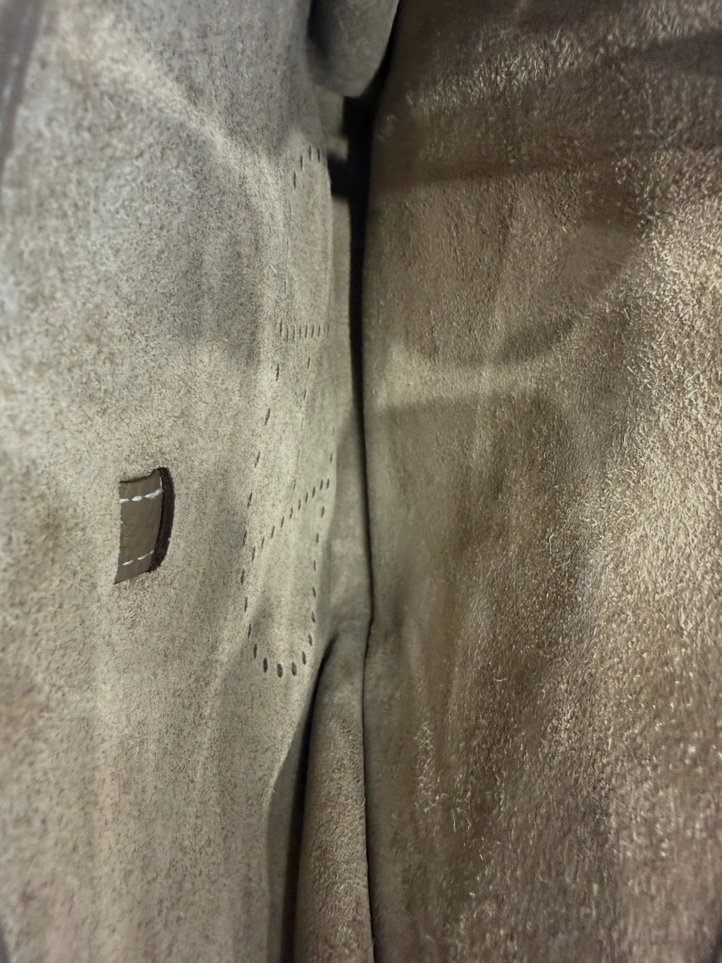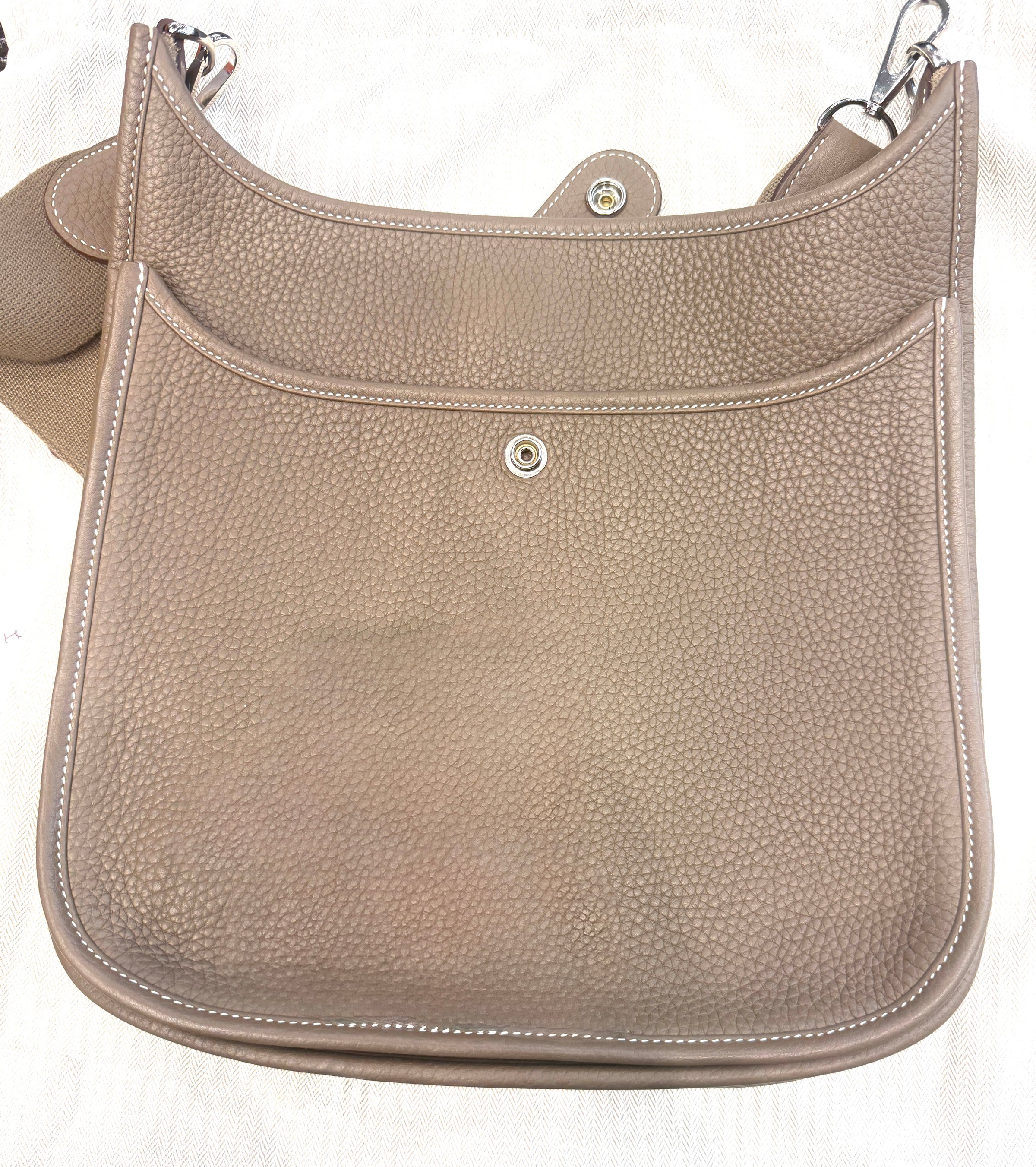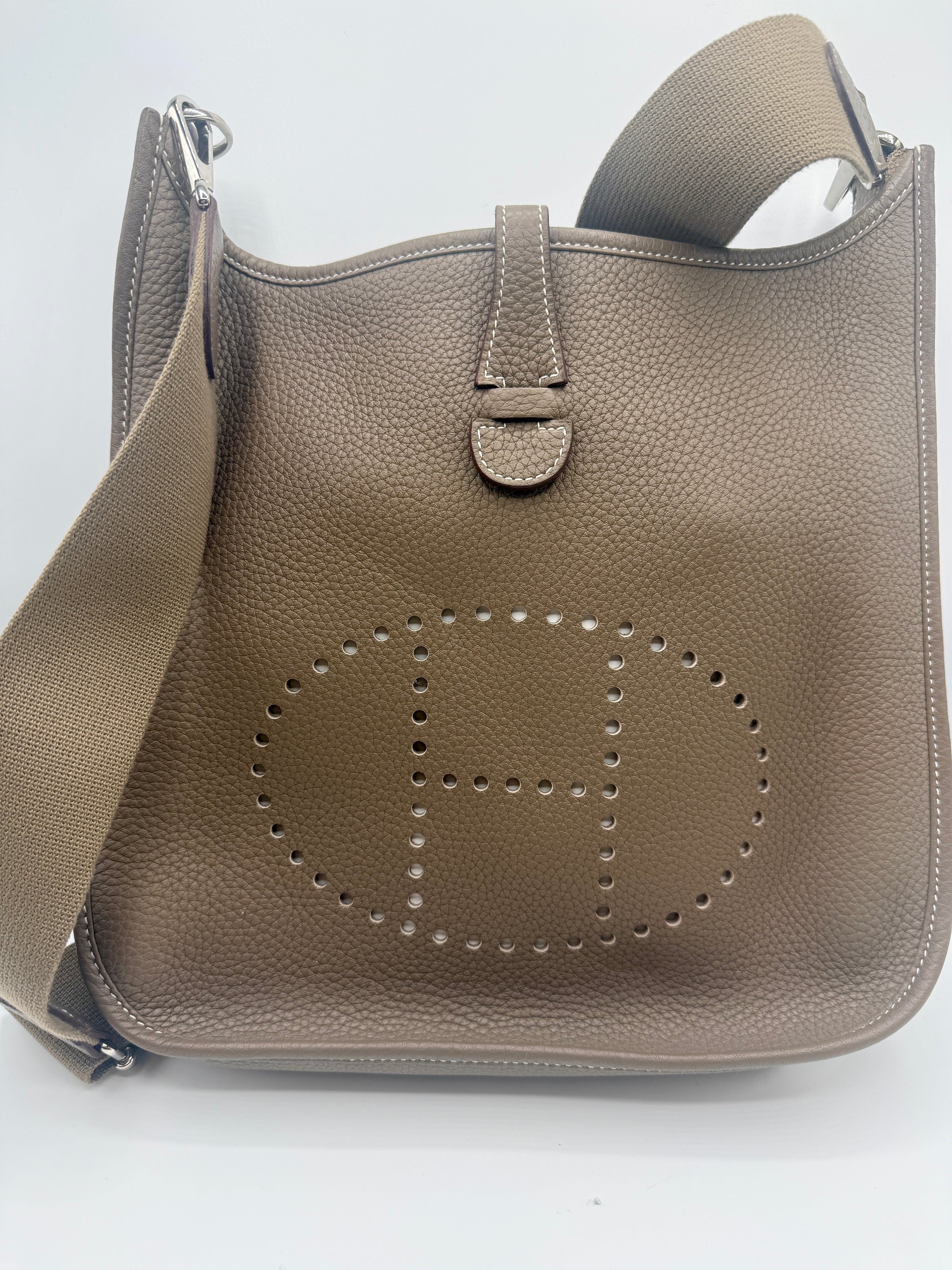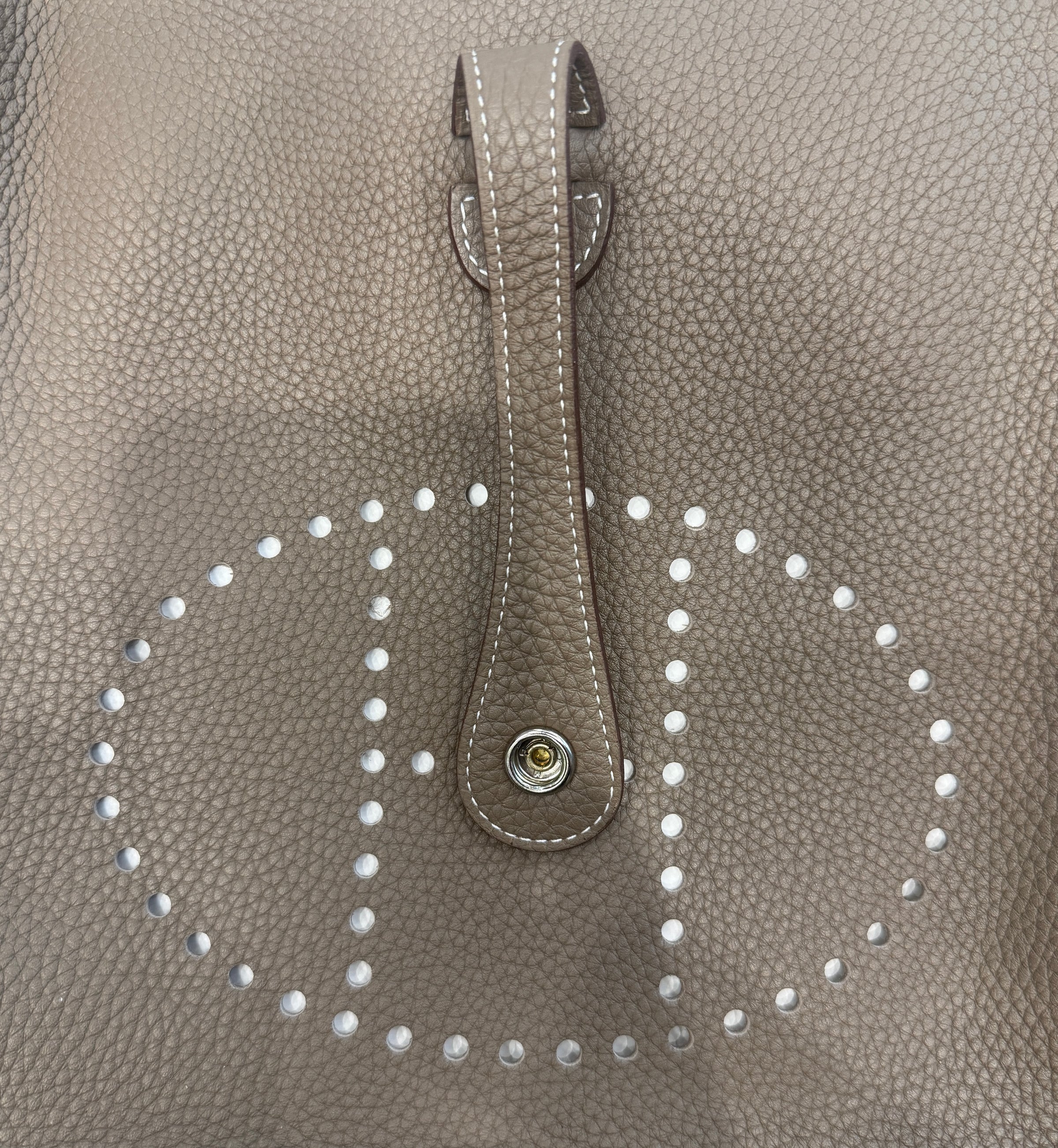 Hermès Evelyne III 29 Bag in taupe-toned leather, crafted from the house’s signature grained leather, offering both durability and a refined, understated finish. This 29cm model features the iconic perforated “H” logo to the front, palladium-plated hardware and a fully adjustable canvas shoulder strap designed for comfortable crossbody wear.