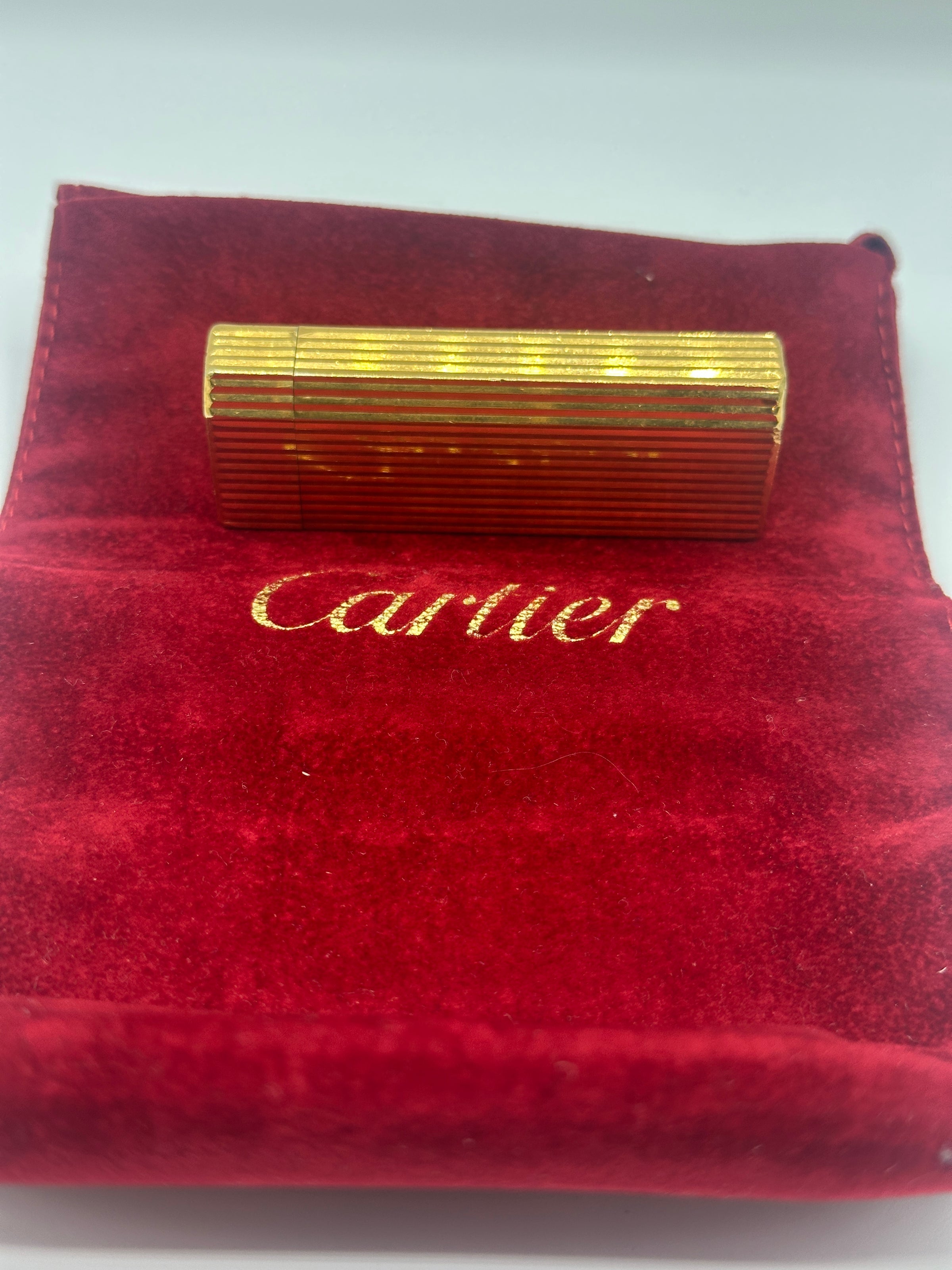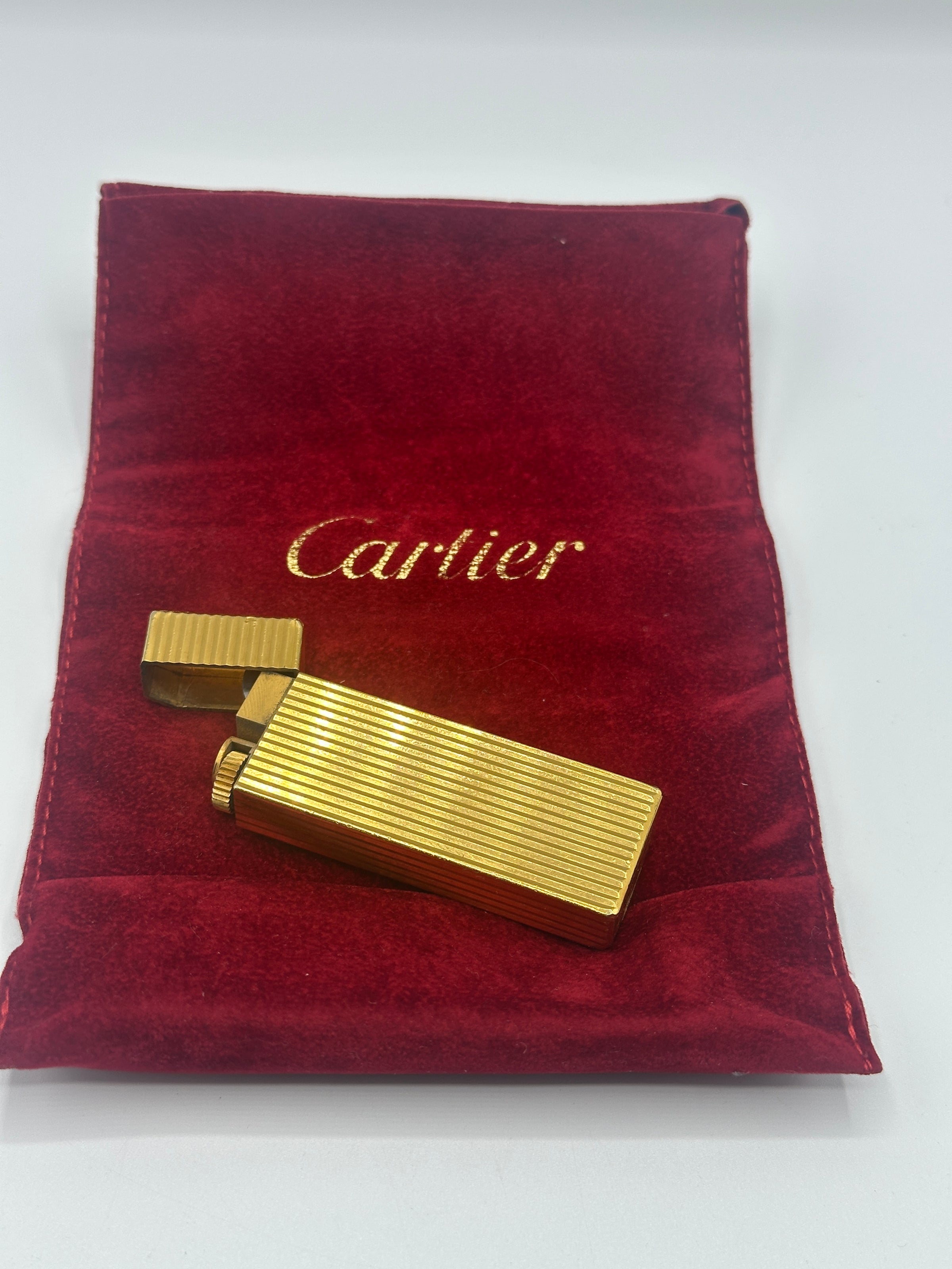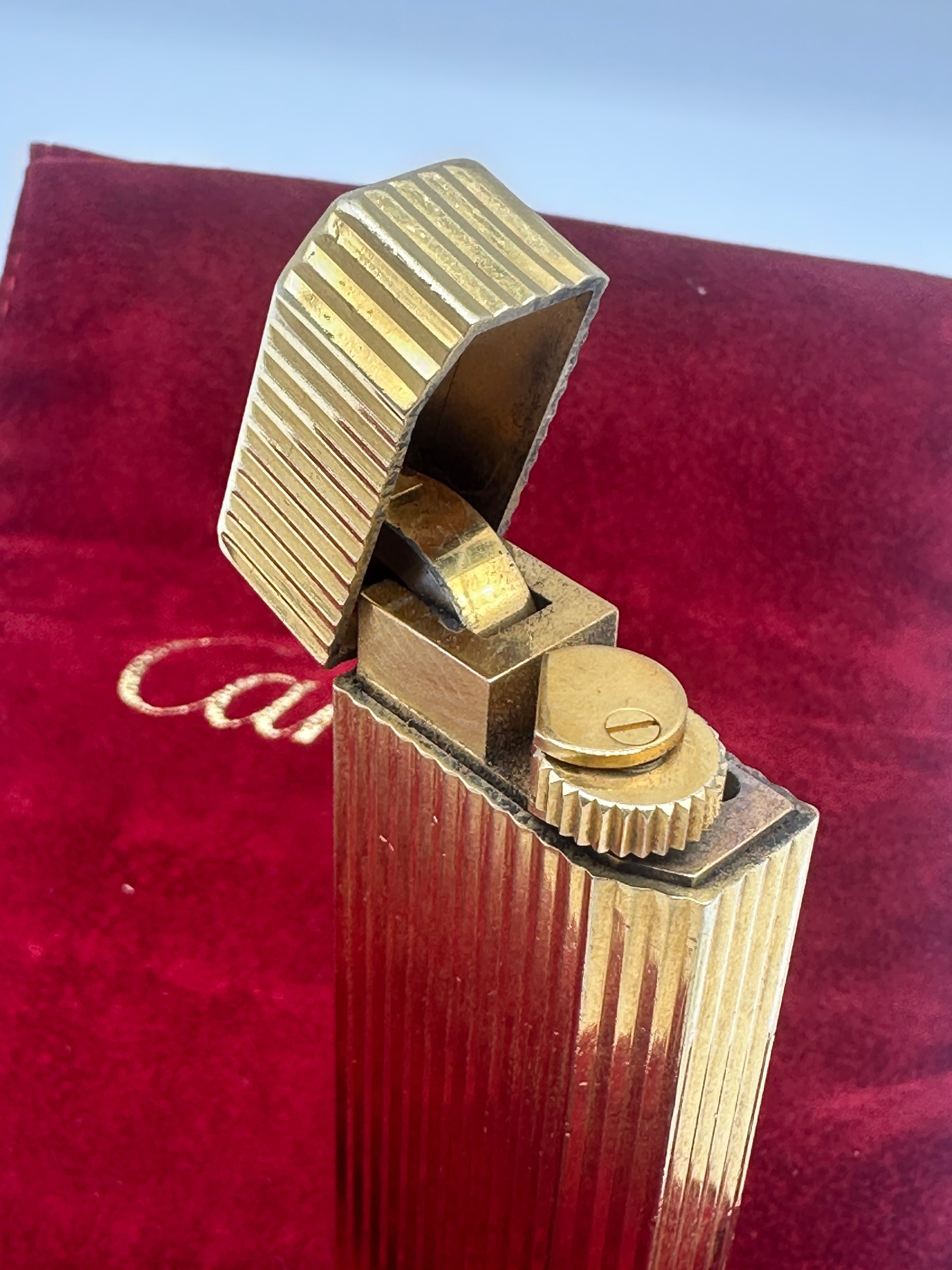 Crafted in the 1980s, this vintage Cartier lighter exemplifies the brand's commitment to timeless elegance and superior craftsmanship. The lighter features a robust metal body, meticulously plated with 18k gold, showcasing a distinctive vertical striped (Godron) pattern that enhances its tactile appeal. Its oval silhouette is both ergonomic and aesthetically pleasing, measuring approximately 66 mm in height, 22 mm in width, and 10 mm in depth. The hinged lid mechanism ensures smooth operation, while the flint ignition system provides reliable functionality. The base is engraved with the Cartier logo, affirming its authenticity and luxury pedigree.