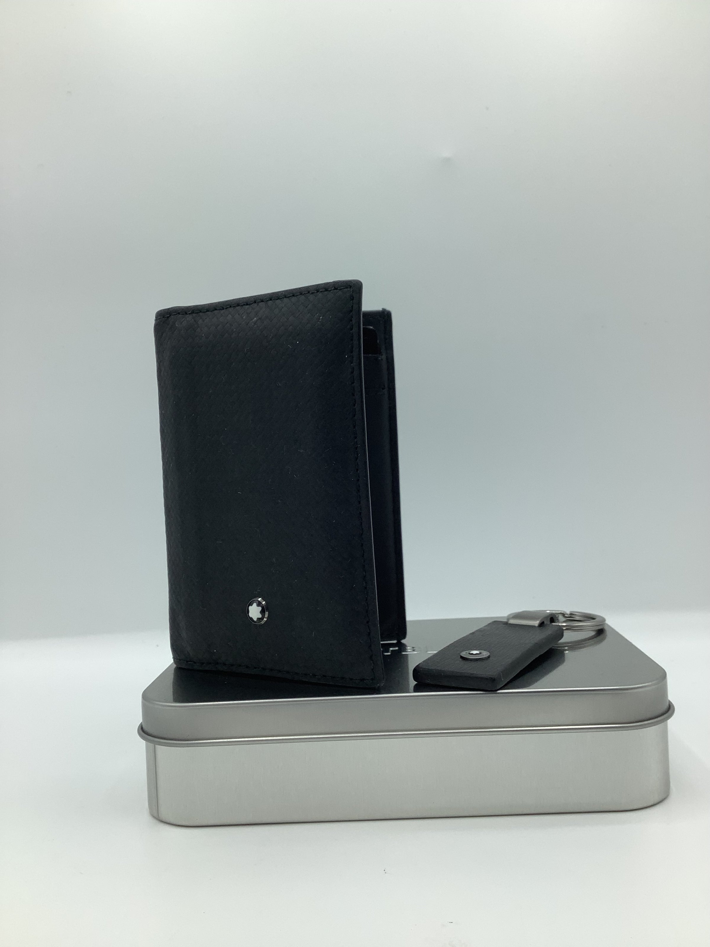 Materials & Design: The Montblanc Extreme 2.0 Wallet and Keychain Set is meticulously crafted from high-quality leather featuring a carbon-fibre print motif, offering a contemporary and sophisticated aesthetic. The wallet's interior boasts plain leather, providing a subtle contrast to its textured exterior.