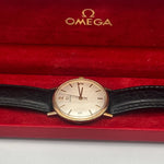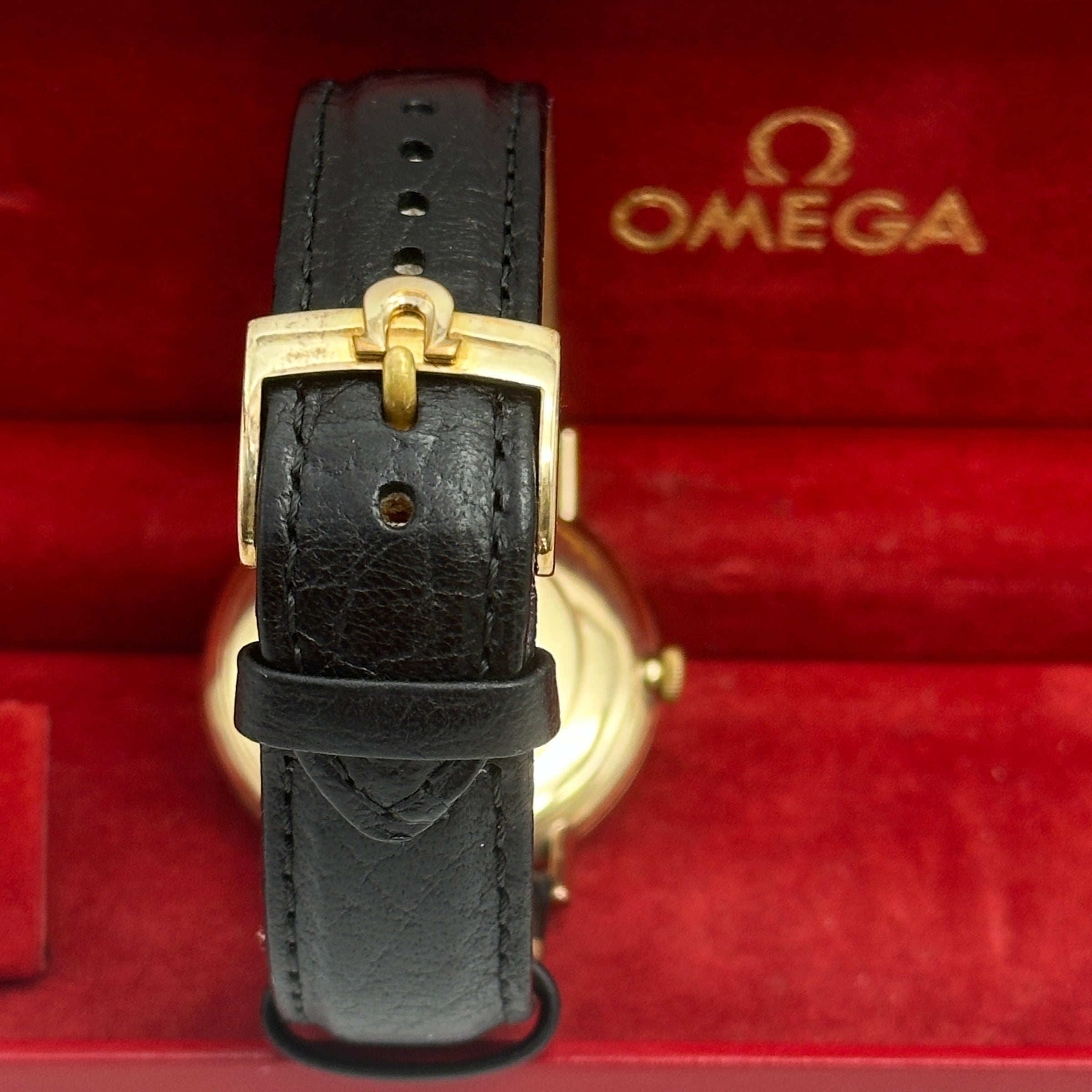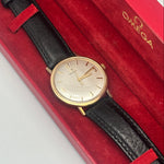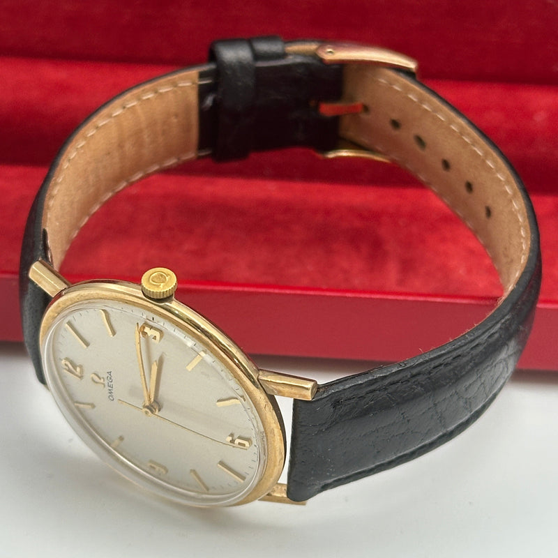 An outstanding example of understated vintage luxury, this Omega wristwatch, reference 131.5016 from 1967, is crafted from solid 9ct yellow gold. The elegant silvered dial features slim black baton hour markers, applied gold 12 numeral at the top, slender black hands, and a subtle subsidiary seconds dial positioned at 6 o’clock. Measuring approximately 34mm in diameter, the gold case is complemented by a classic black leather strap and gold-tone buckle. Powered by a manual wind Swiss Omega movement, this timepiece offers exceptional mechanical reliability and timeless style, ideal for discerning collectors.