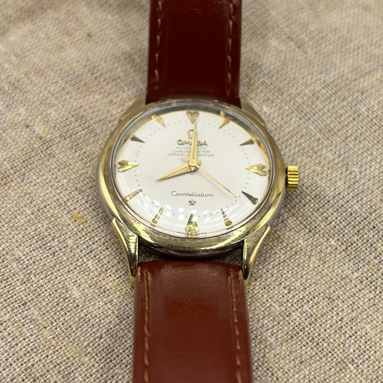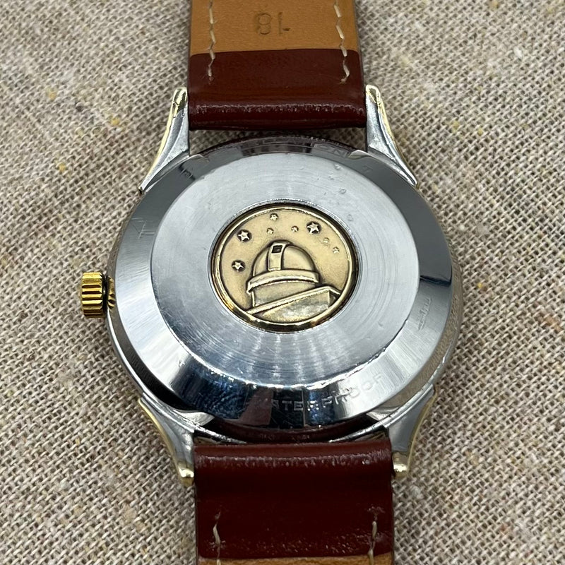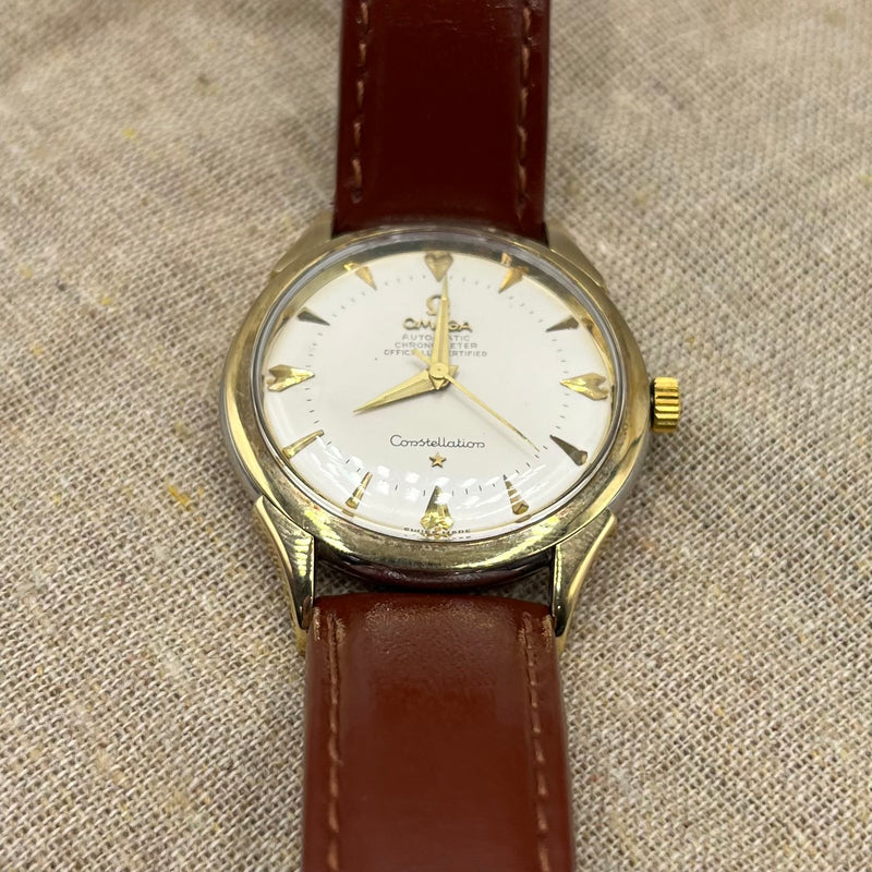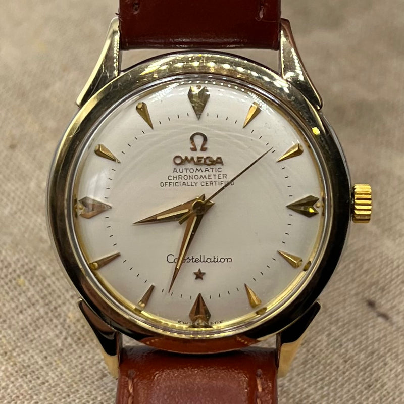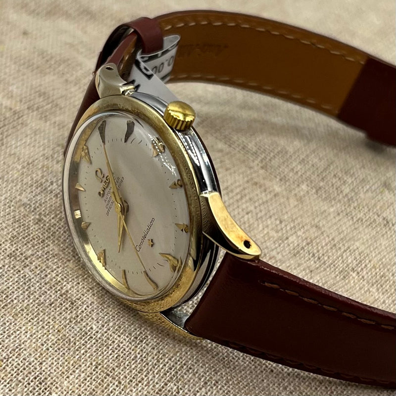 Crafted from stainless steel and good condition gold plate, this timepiece features a 34mm case with distinctive "dog-leg" lugs, a hallmark of mid-20th-century Omega design. The watch showcases the iconic "pie-pan" dial, characterized by its sloped edges. The dial is adorned with dauphine hands, distinctive applied hour markers, and the Omega logo. The Constellation is powered by the excellent Omega Calibre 333, a chronometer-certified automatic movement. The charming observatory medallion on the case-back commemorates records and awards that Omega earned at the Geneva Observatory, between 1933 and 1952.