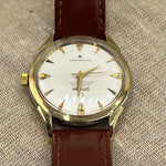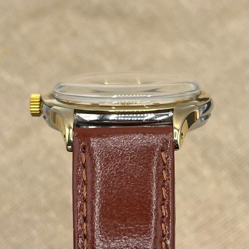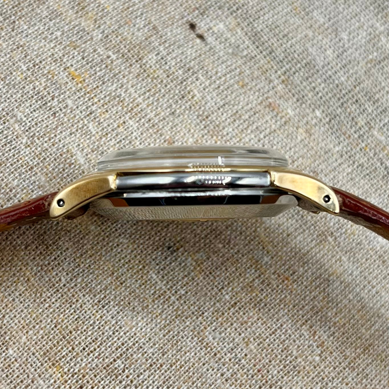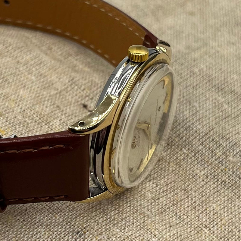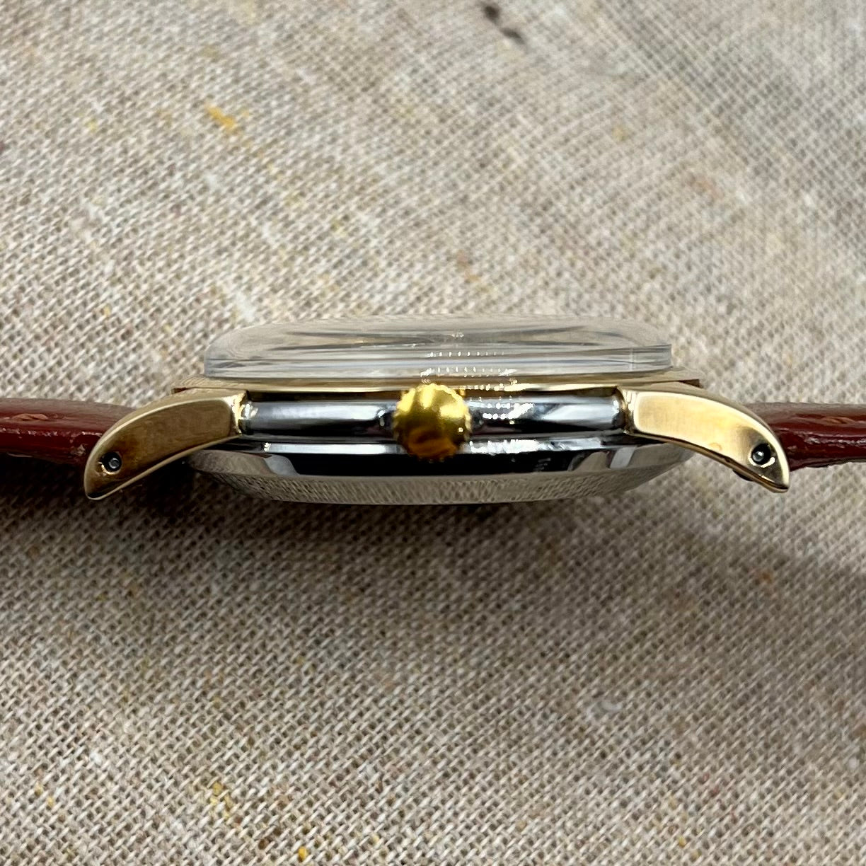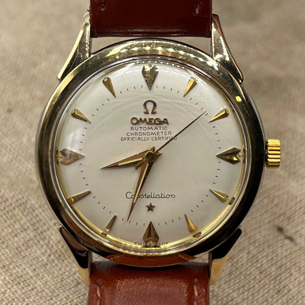 Crafted from stainless steel and good condition gold plate, this timepiece features a 34mm case with distinctive "dog-leg" lugs, a hallmark of mid-20th-century Omega design. The watch showcases the iconic "pie-pan" dial, characterized by its sloped edges. The dial is adorned with dauphine hands, distinctive applied hour markers, and the Omega logo. The Constellation is powered by the excellent Omega Calibre 333, a chronometer-certified automatic movement. The charming observatory medallion on the case-back commemorates records and awards that Omega earned at the Geneva Observatory, between 1933 and 1952.