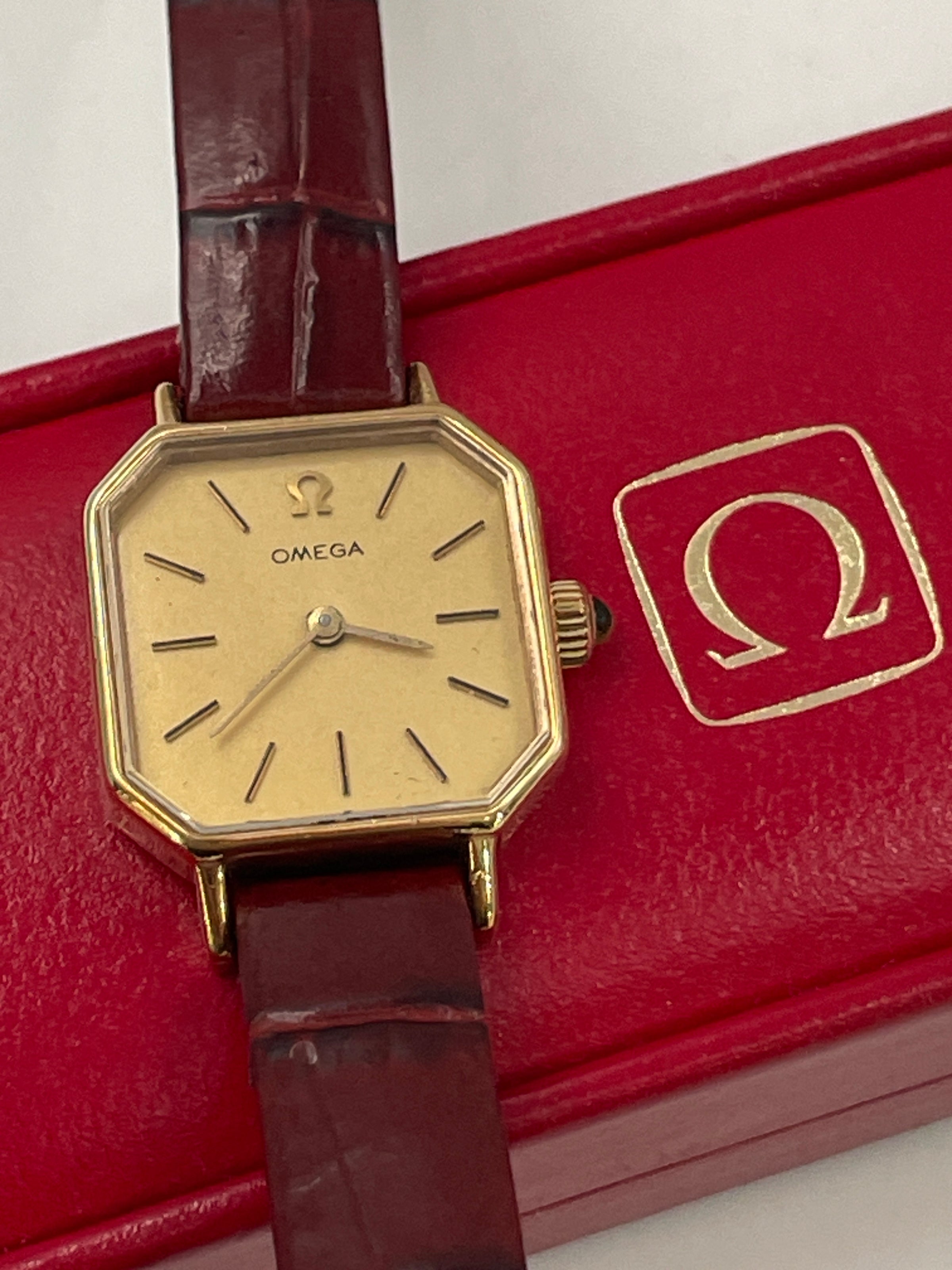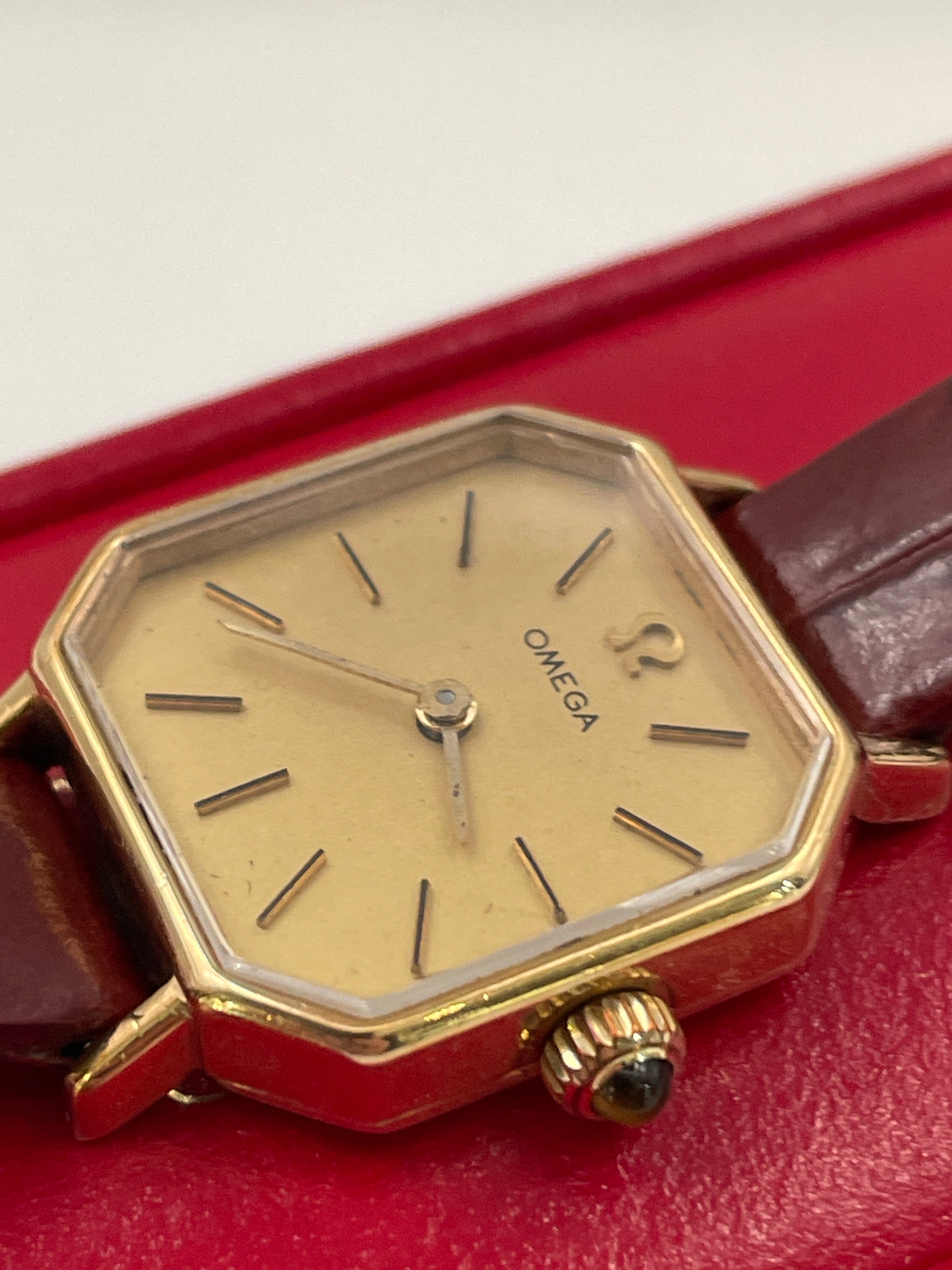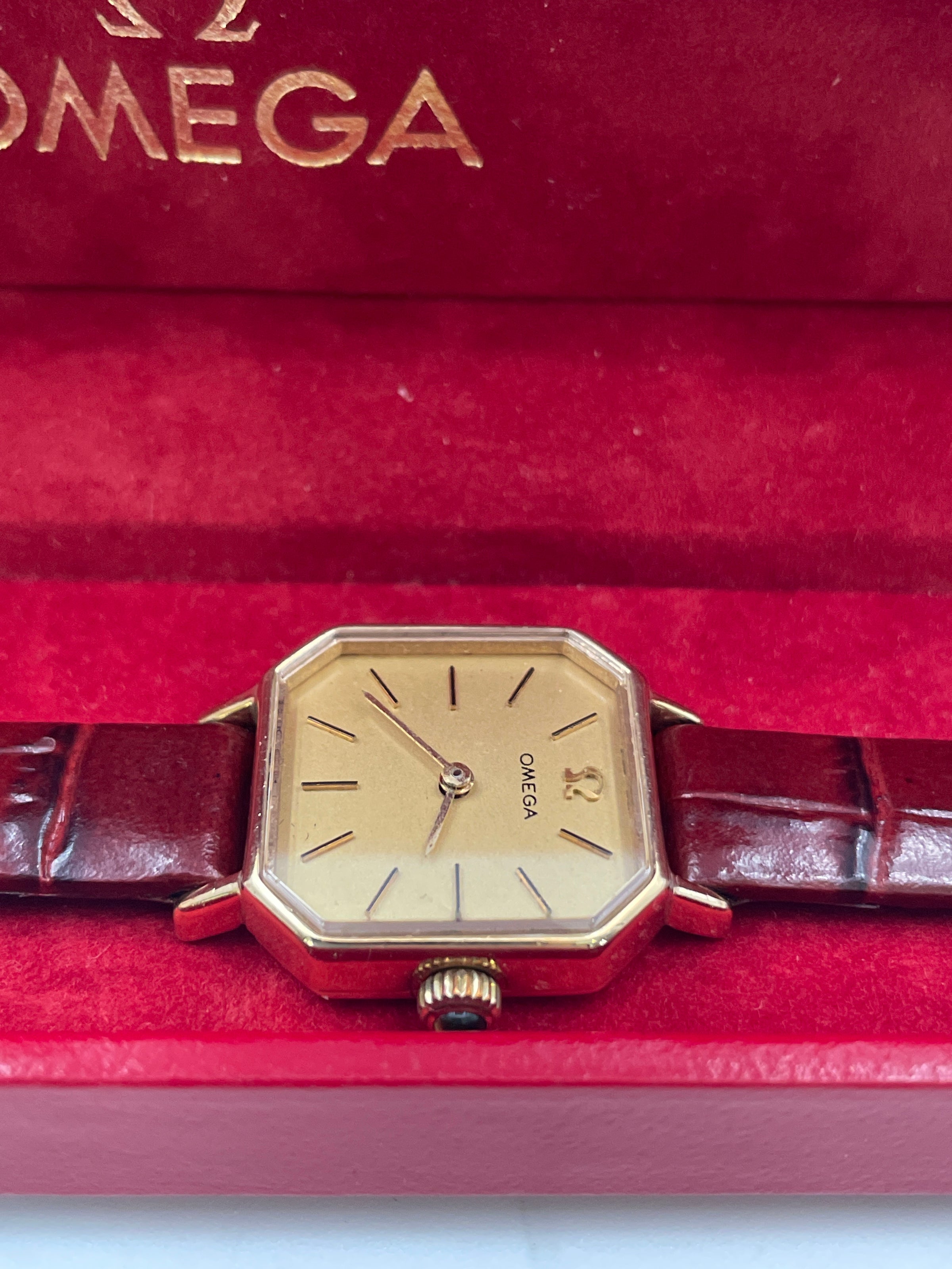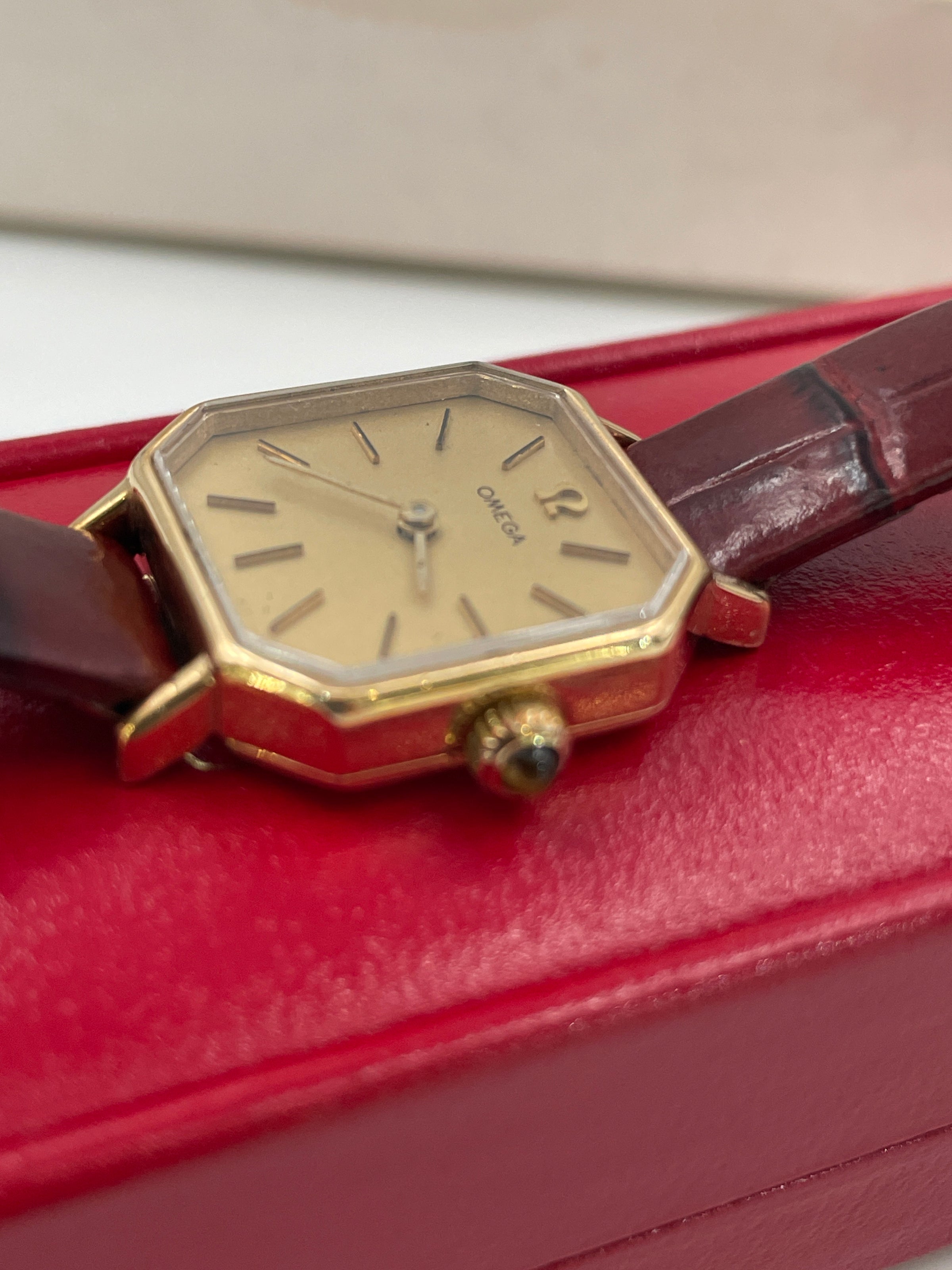 A ladies Omega watch featuring a mechanical movement and 9ct Yellow Gold case. The case is a square / octagonal shape and has a plain gold dial with hour markers. Approximate dimensions are as follows: Case width: 19.8mm, Case depth: 5.6mm, Lug to lug: 26.8mm. This watch comes with original box but the strap is not of the Omega brand.