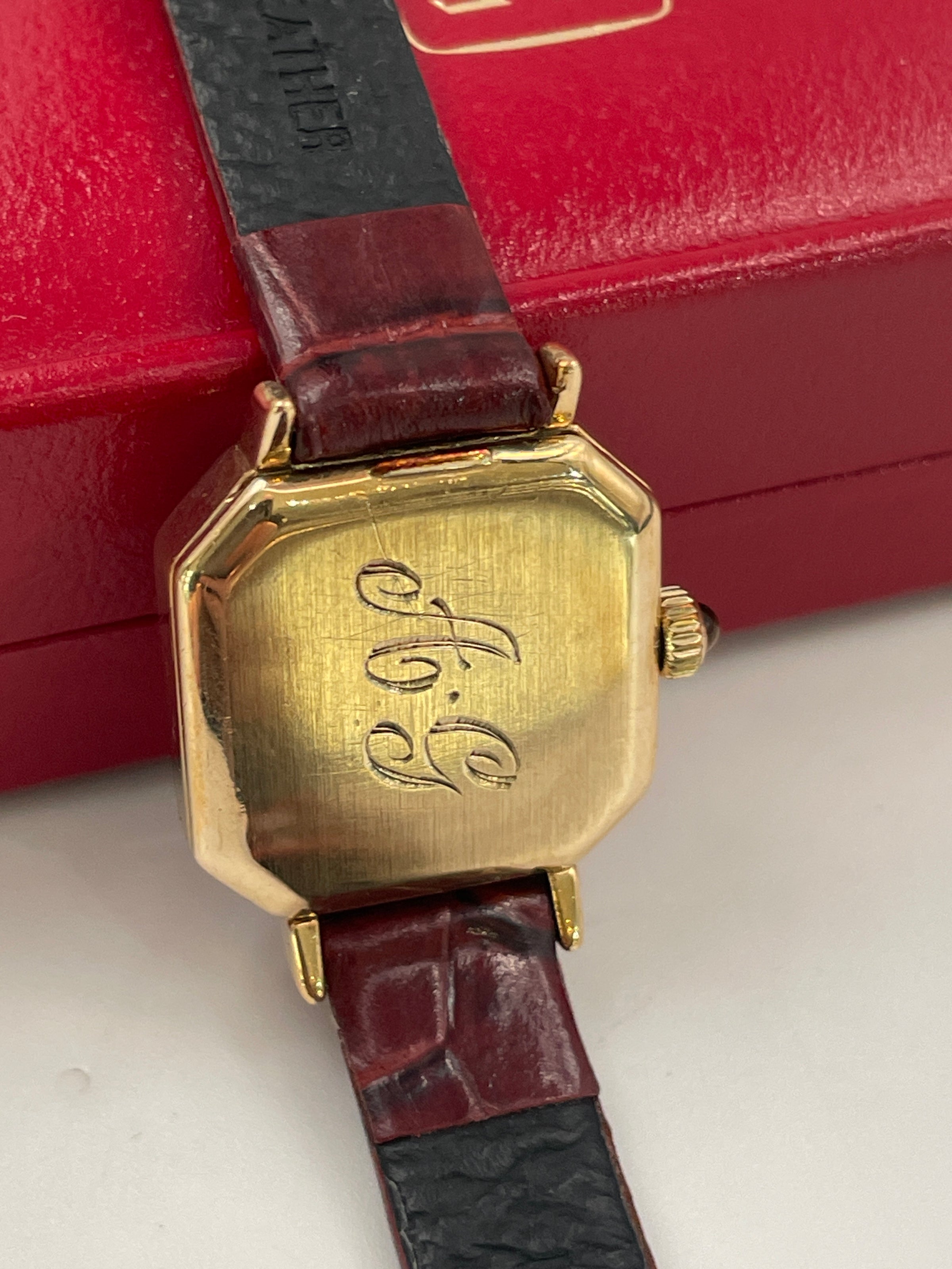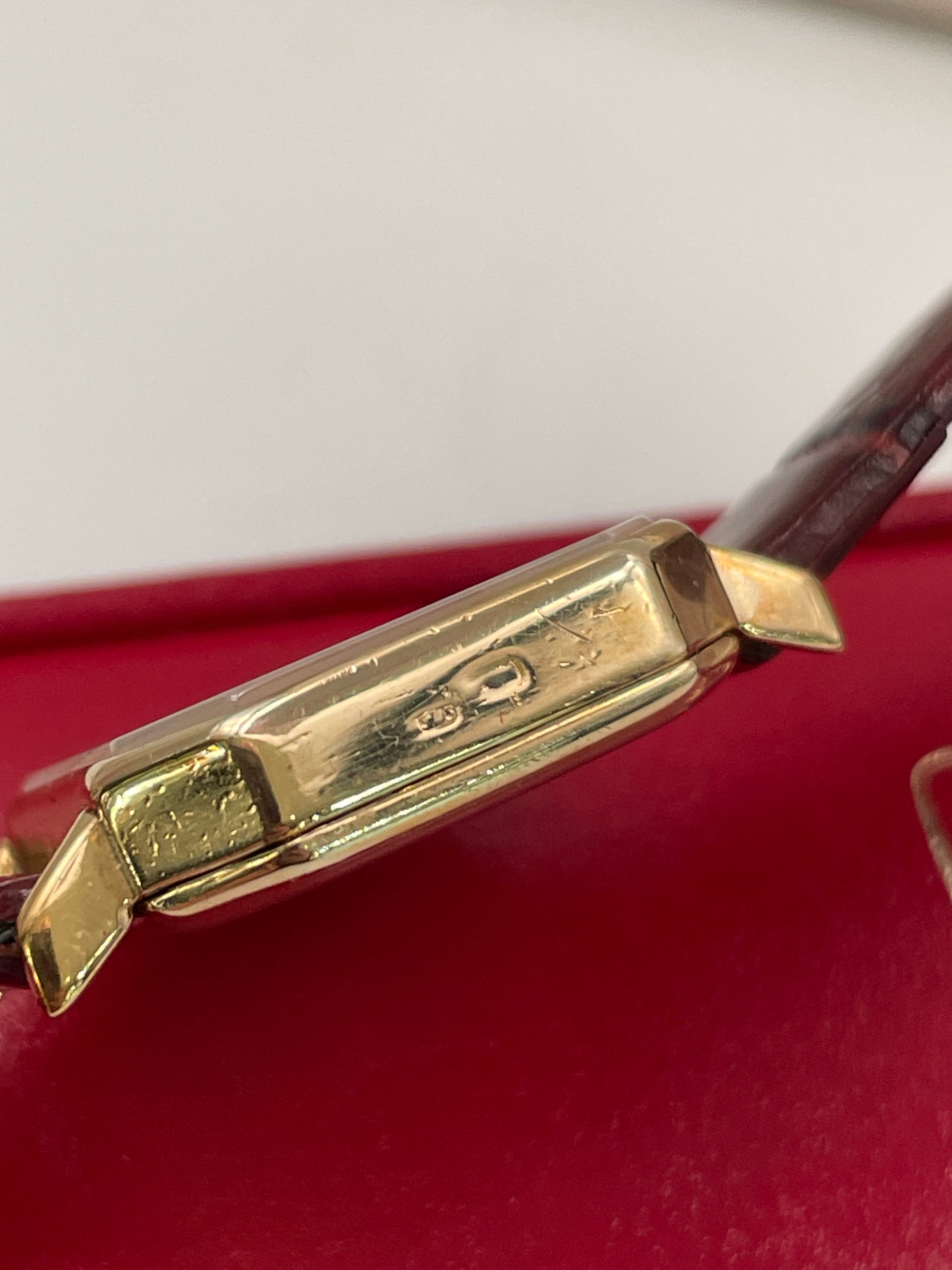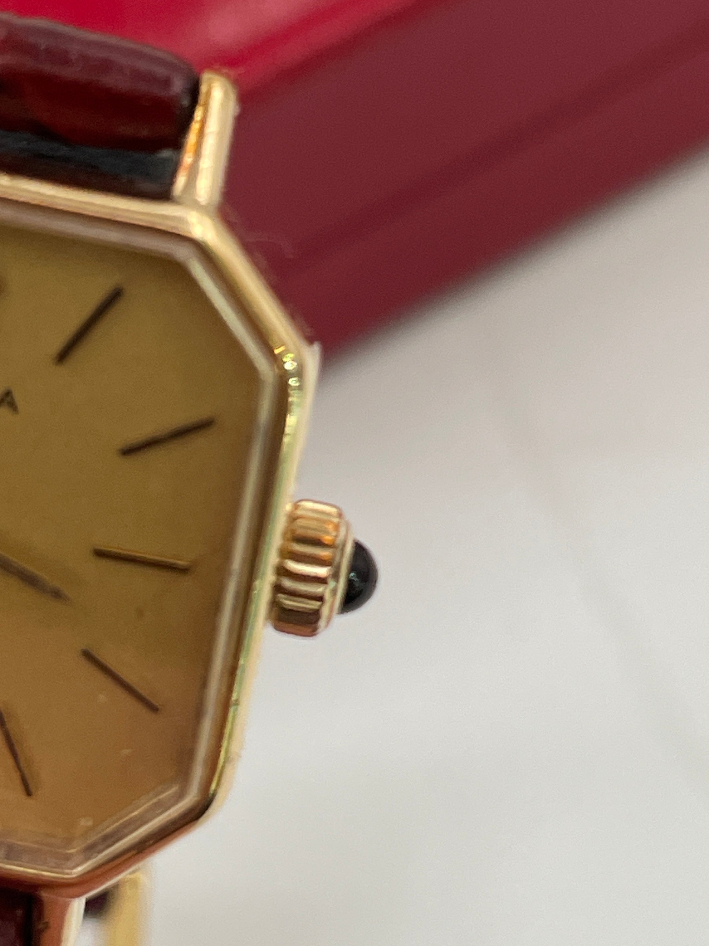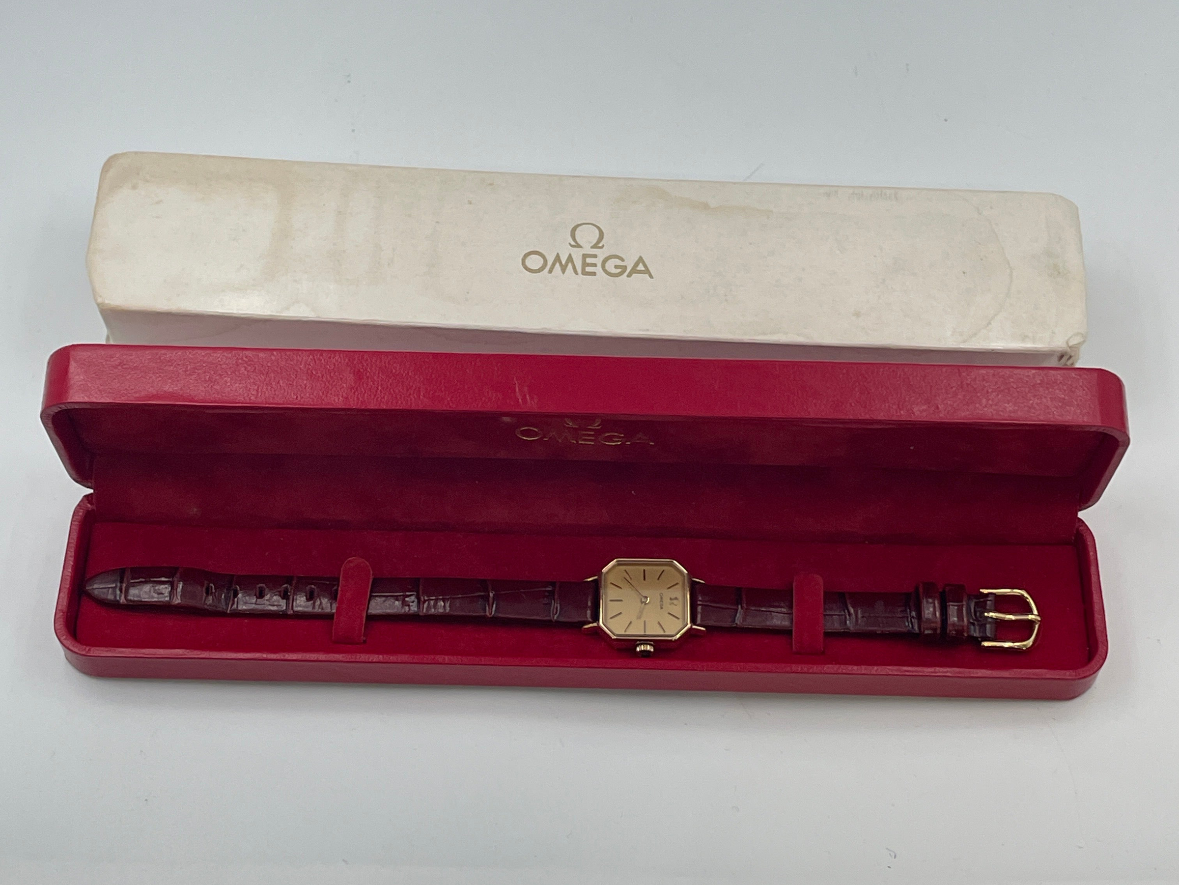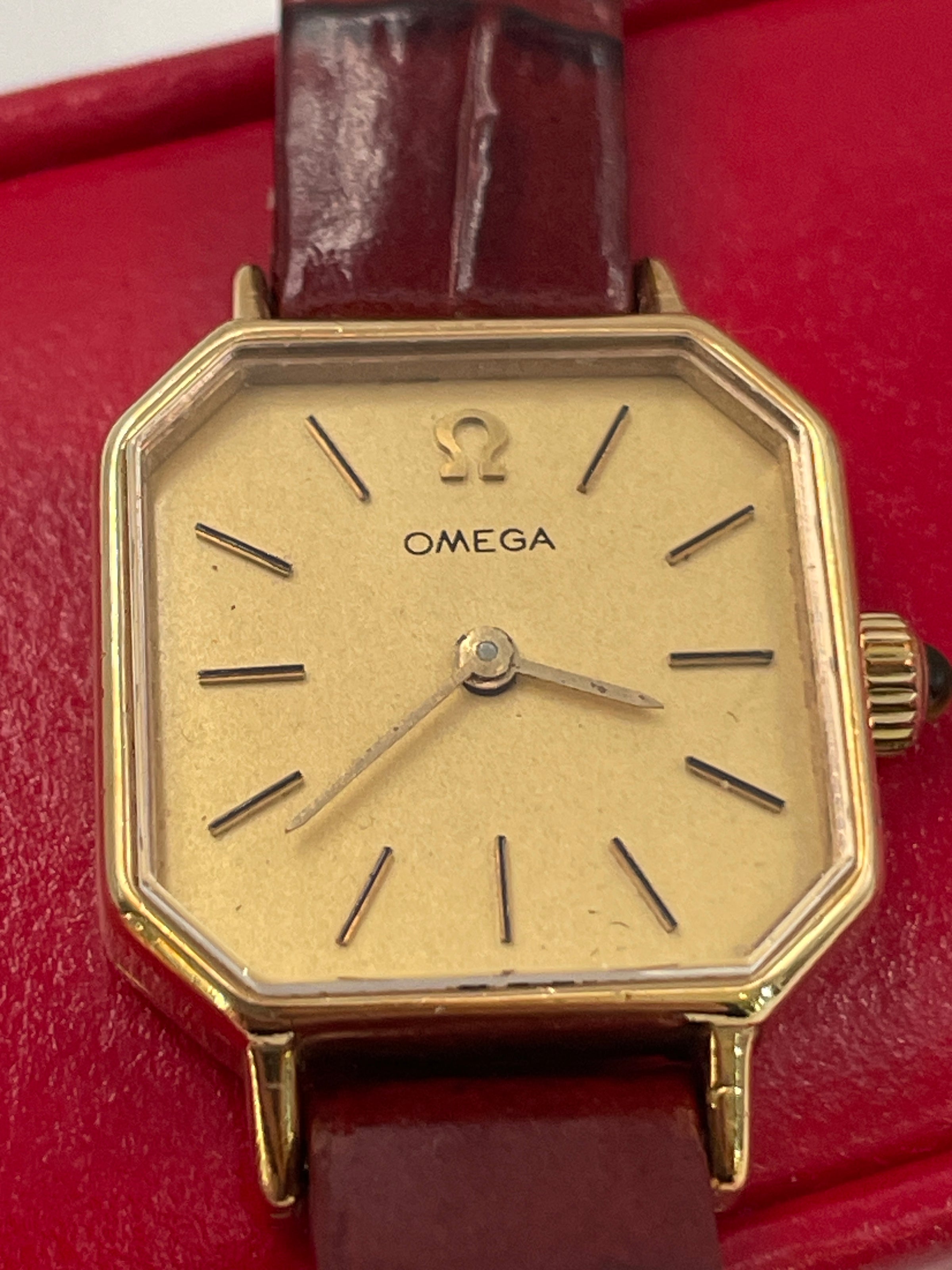 A ladies Omega watch featuring a mechanical movement and 9ct Yellow Gold case. The case is a square / octagonal shape and has a plain gold dial with hour markers. Approximate dimensions are as follows: Case width: 19.8mm, Case depth: 5.6mm, Lug to lug: 26.8mm. This watch comes with original box but the strap is not of the Omega brand.
