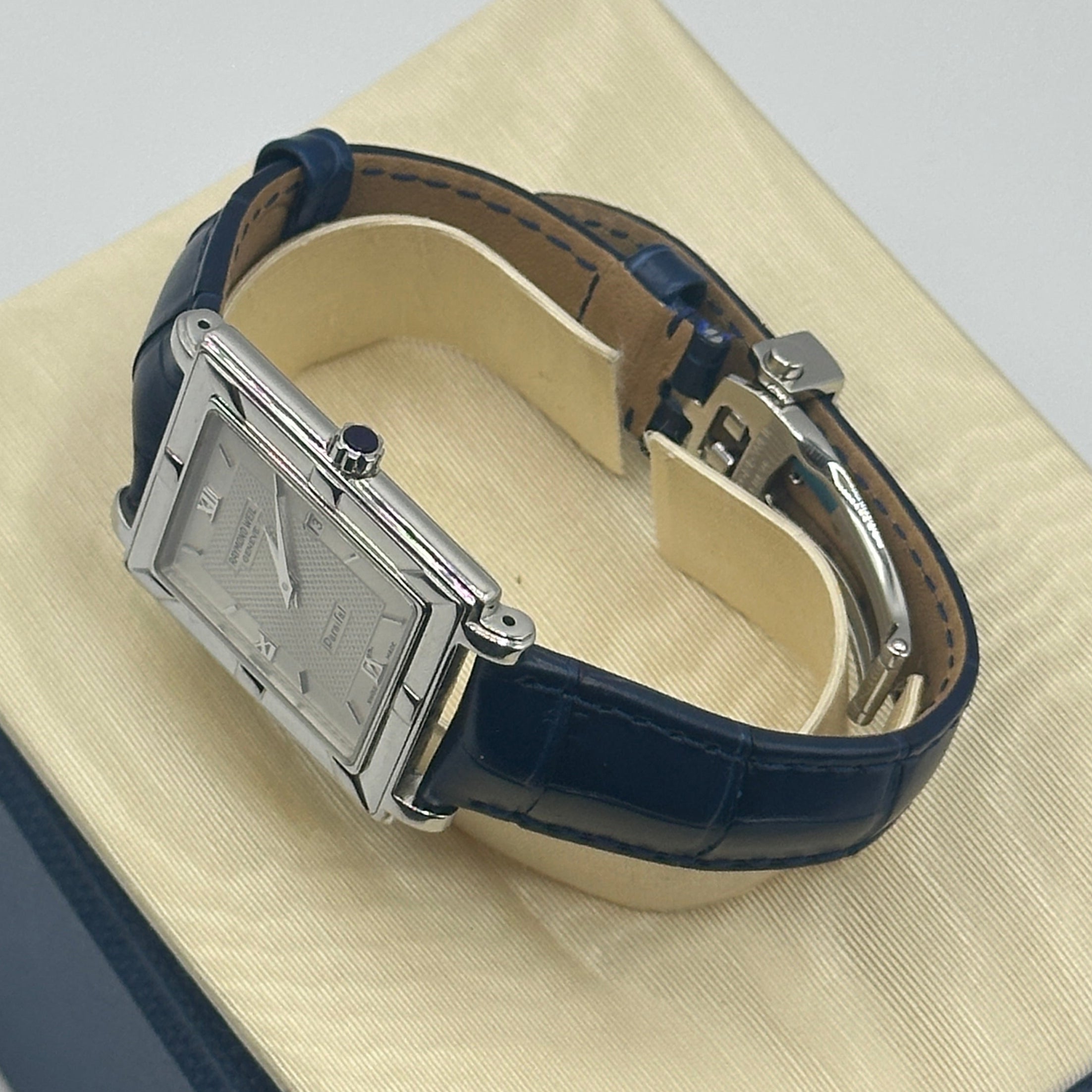 The Raymond Weil Parsifal Watch is a distinguished timepiece that showcases the brand's commitment to luxury and precision. Crafted with a stainless steel case, this watch features a rectangular white dial adorned with Roman numeral hour markers, exuding a timeless and sophisticated aesthetic.