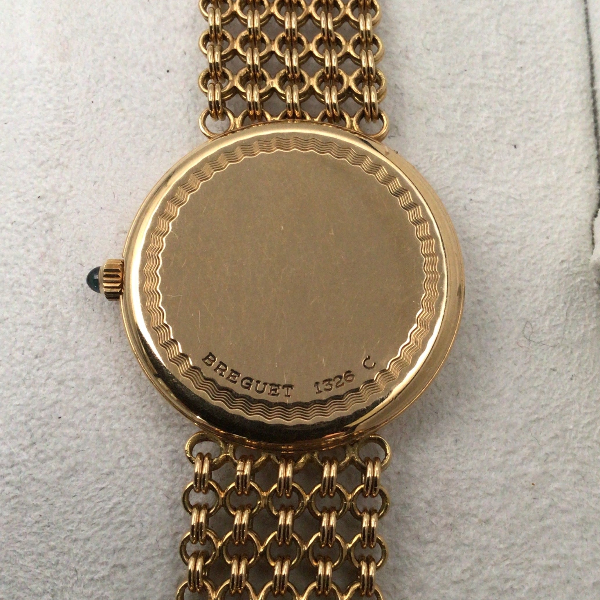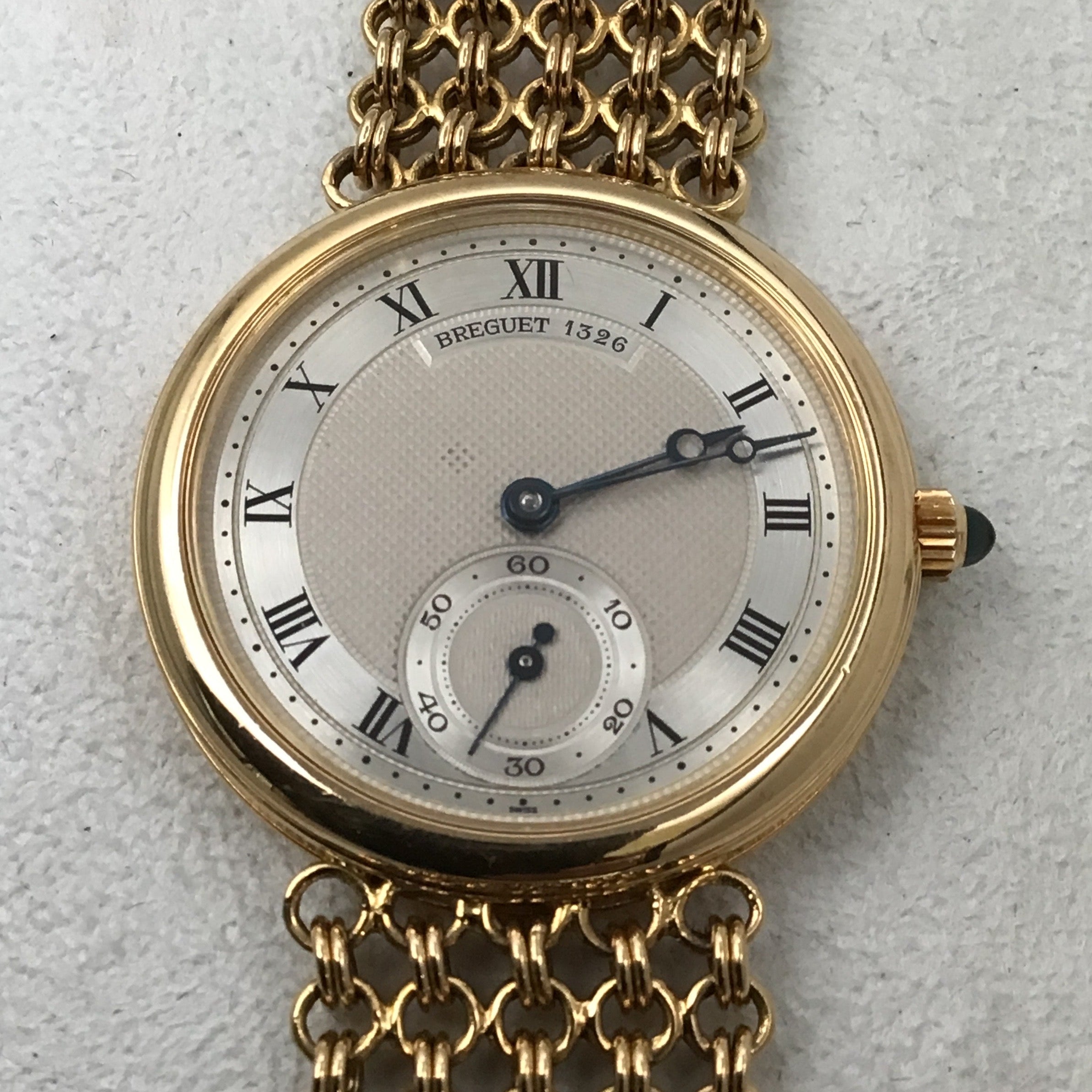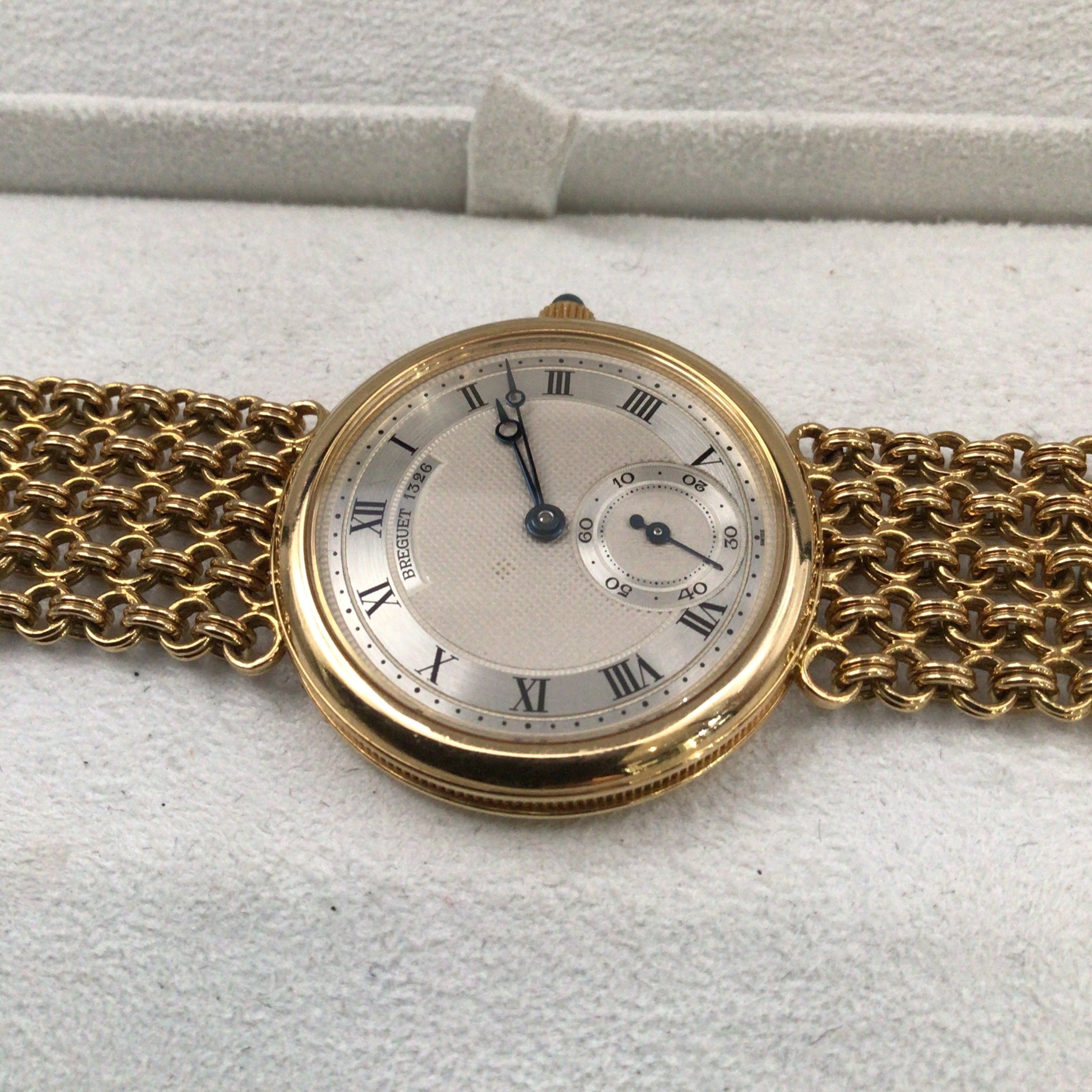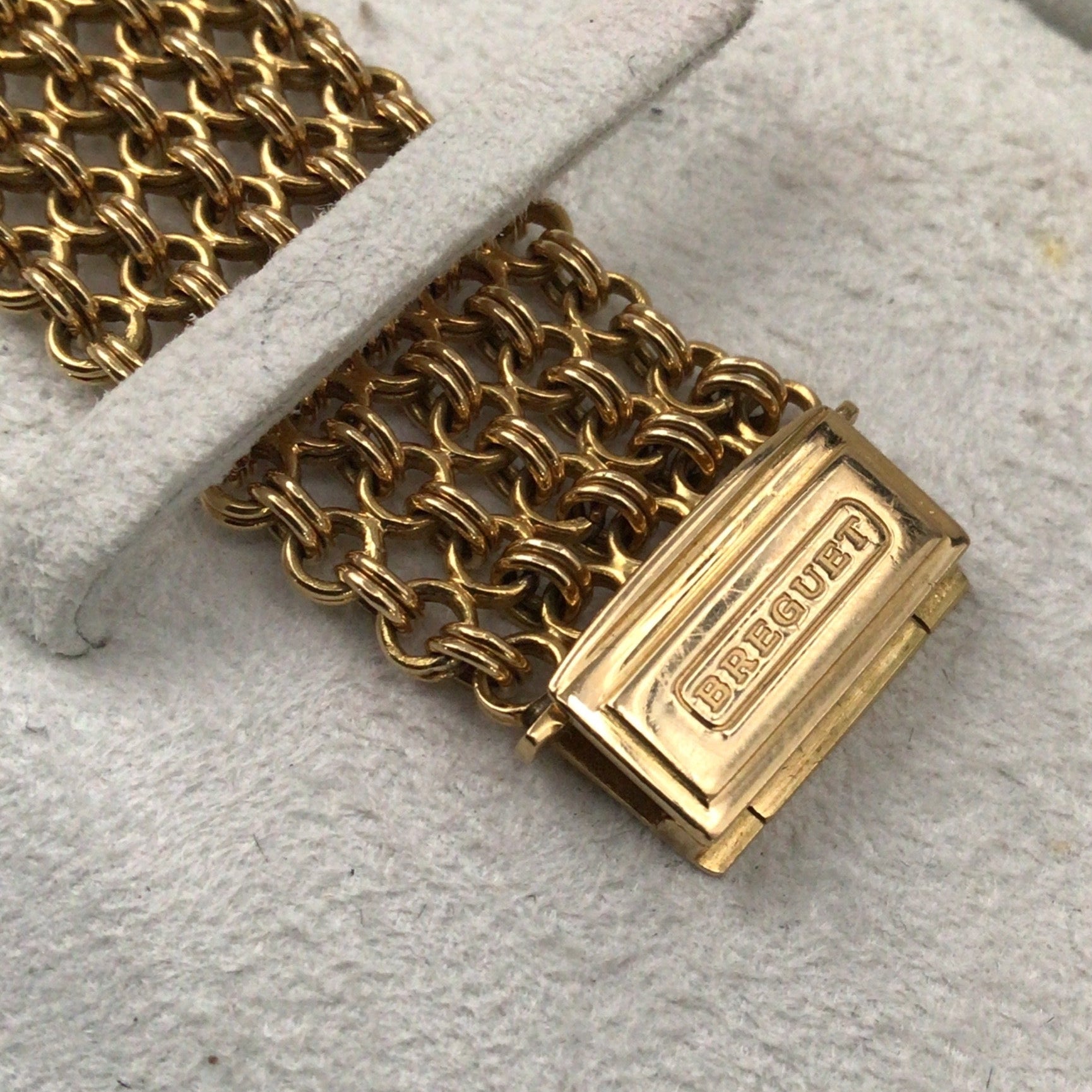 This Breguet Classique (Ref. 3210/2BA106D) is a rare and elegant timepiece crafted in 18-carat yellow gold. The case measures approximately 30.5 mm in diameter, and it features the signature fluted “coin-edge” case band that defines the Classique line. The silvered guilloché dial is adorned with Roman numerals and blued Breguet hands. Inside, the watch is powered by a manual-winding mechanical calibre. The pièce de résistance is a yellow gold 'chainmail' bracelet made for Breguet by high end bracelet maker Roland-Gilbert Gaschen.