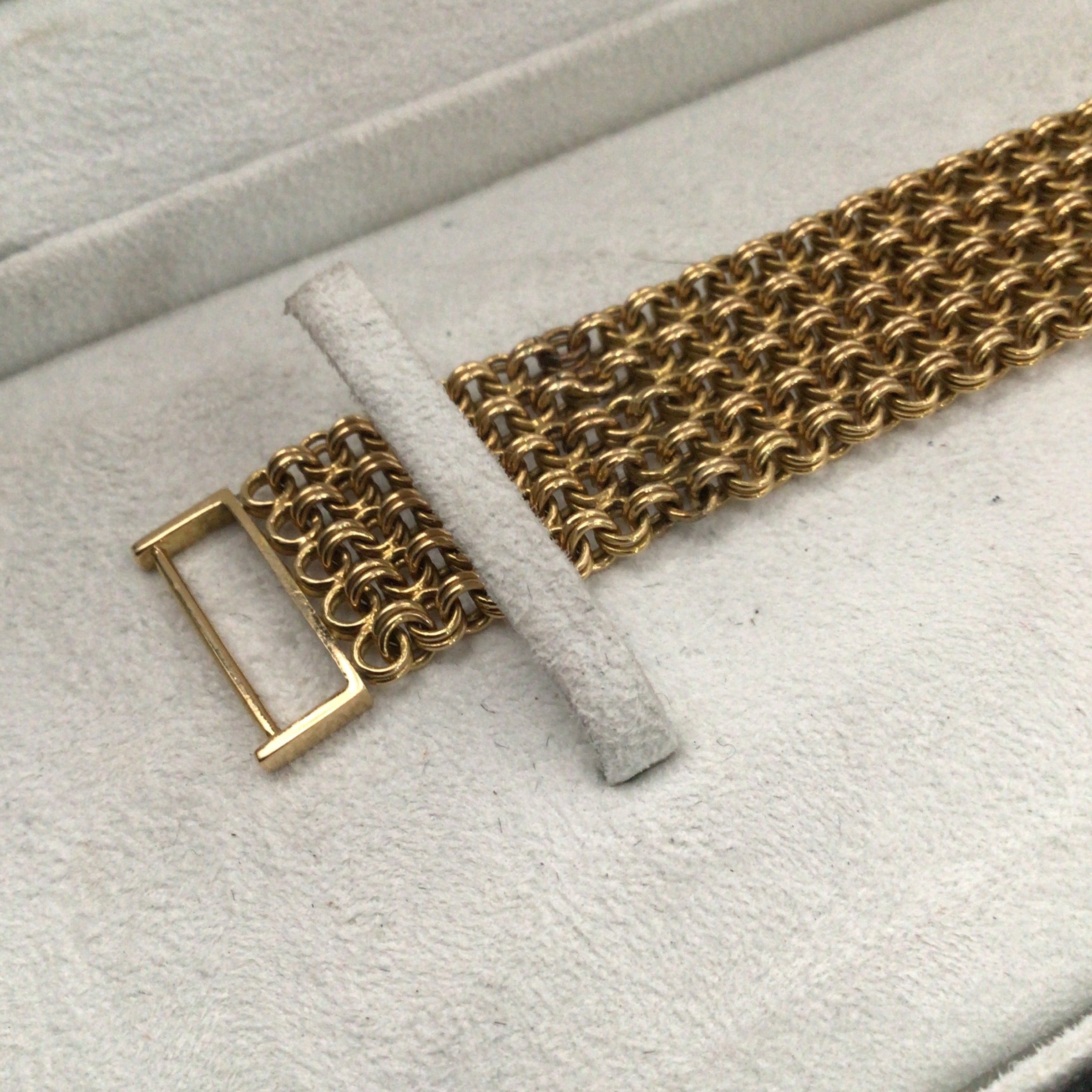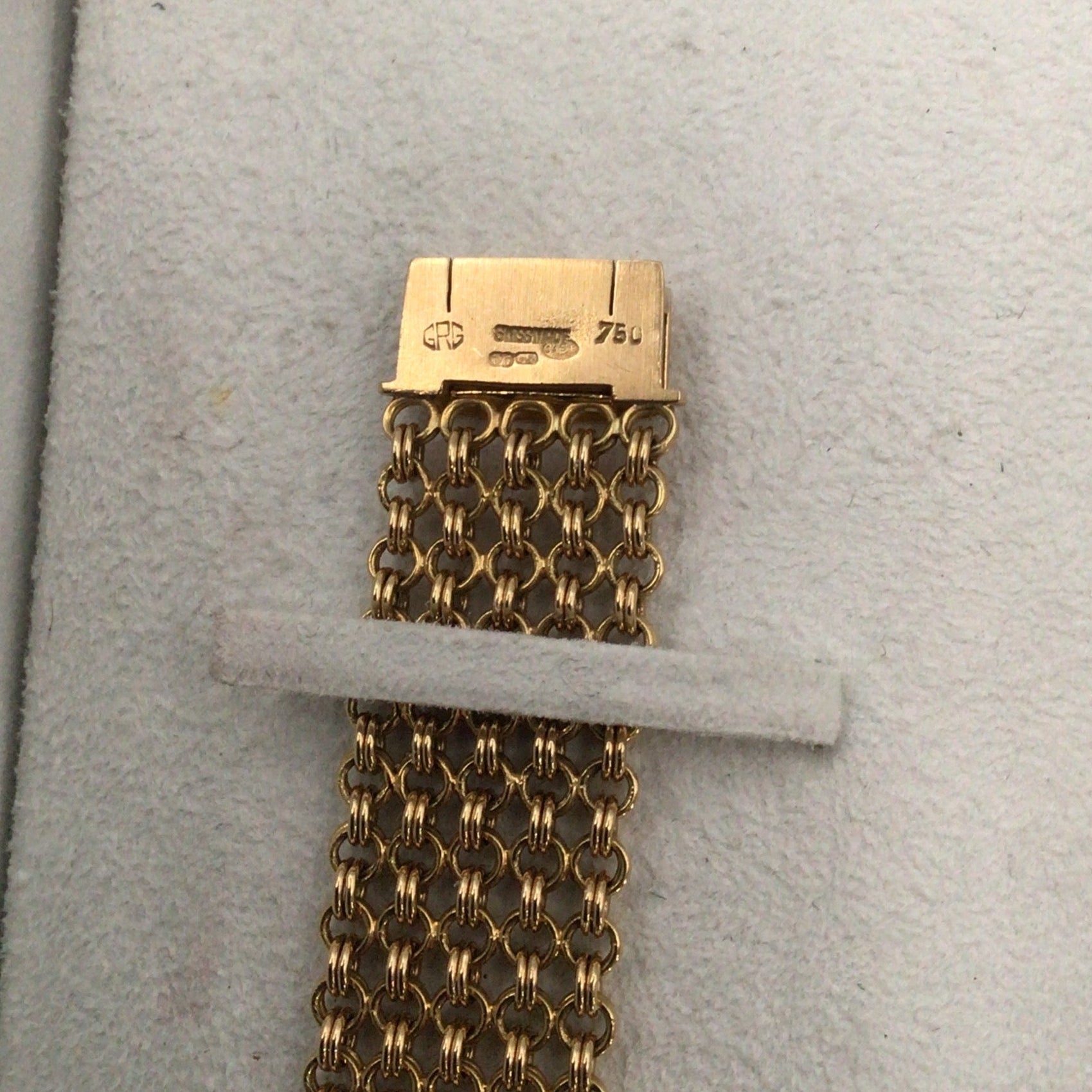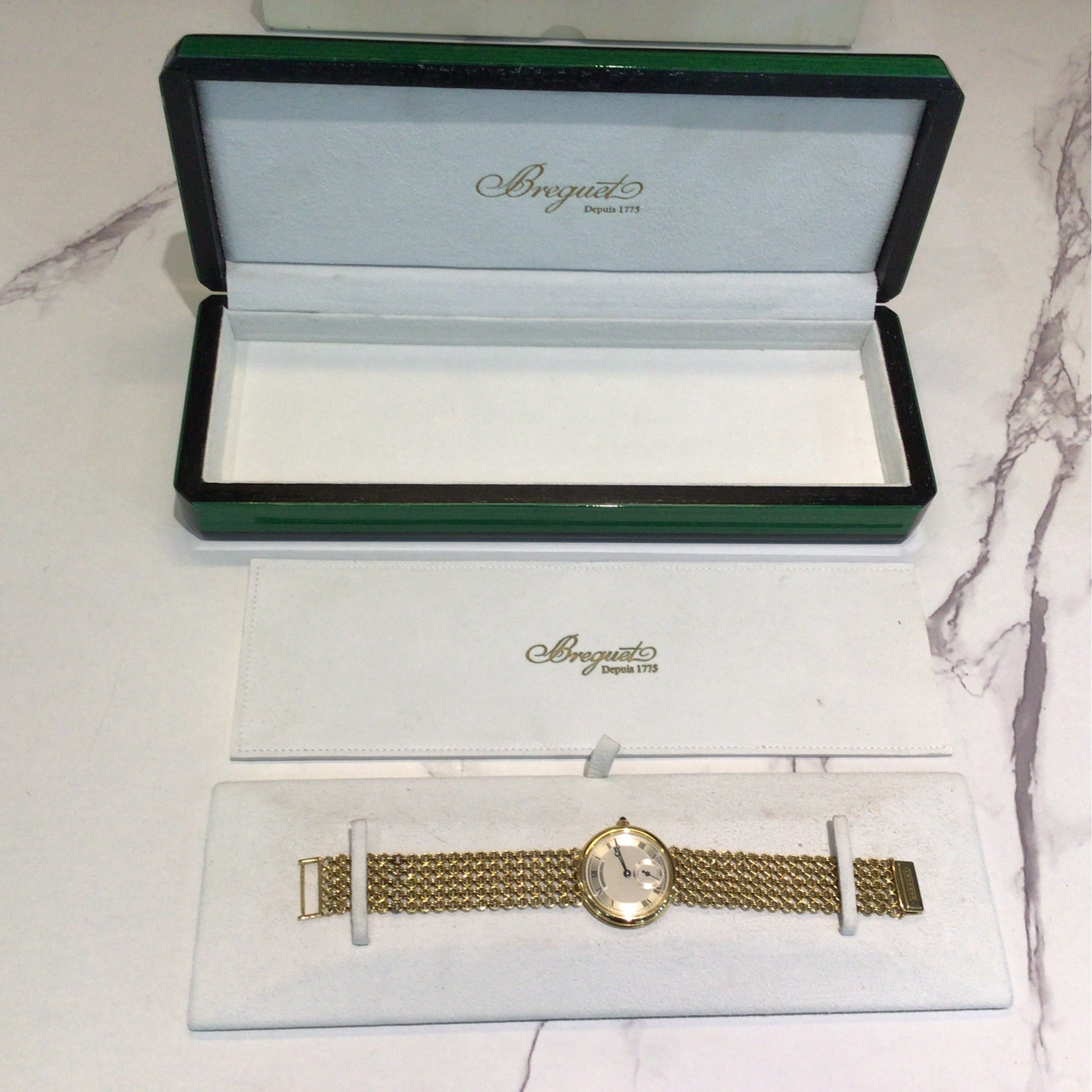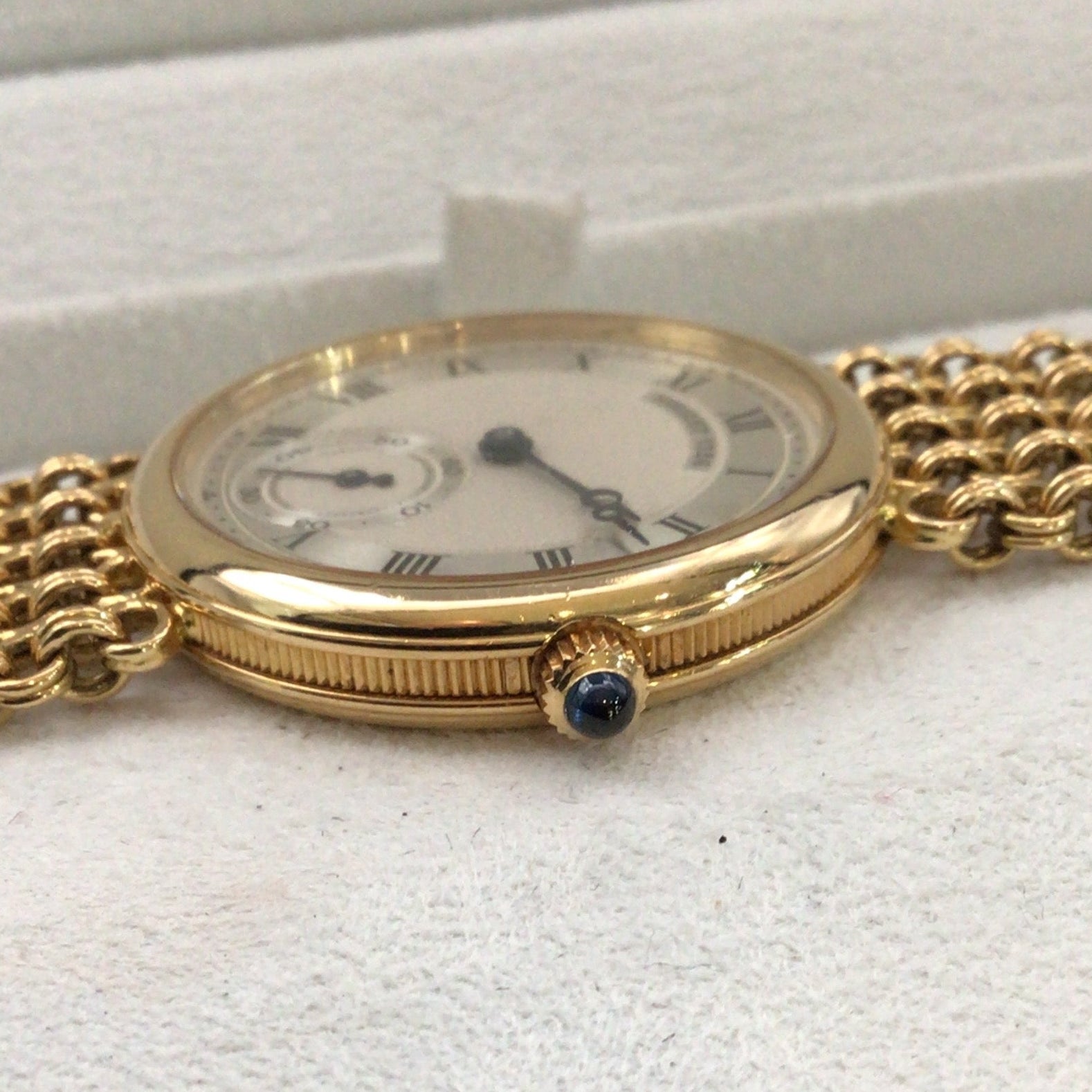 This Breguet Classique (Ref. 3210/2BA106D) is a rare and elegant timepiece crafted in 18-carat yellow gold. The case measures approximately 30.5 mm in diameter, and it features the signature fluted “coin-edge” case band that defines the Classique line. The silvered guilloché dial is adorned with Roman numerals and blued Breguet hands. Inside, the watch is powered by a manual-winding mechanical calibre. The pièce de résistance is a yellow gold 'chainmail' bracelet made for Breguet by high end bracelet maker Roland-Gilbert Gaschen.