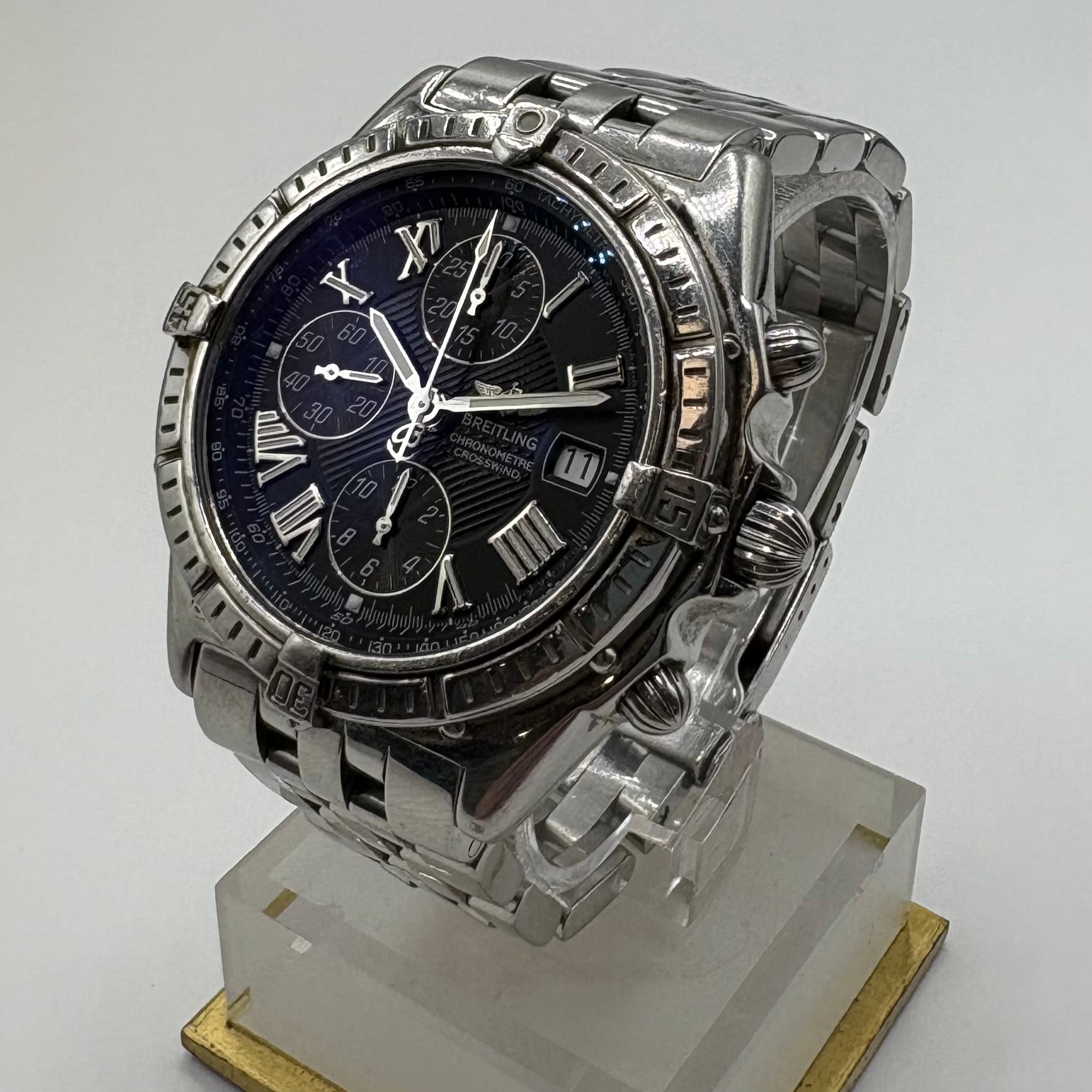 Breitling, founded in 1884, is synonymous with precision aviation watches. The Crosswind A13055 is part of the Windrider series (1997–2004), known for its bold design — notably the rider bezel, onion crown, and elevated dial — blending functional instrument aesthetics with luxury appeal.