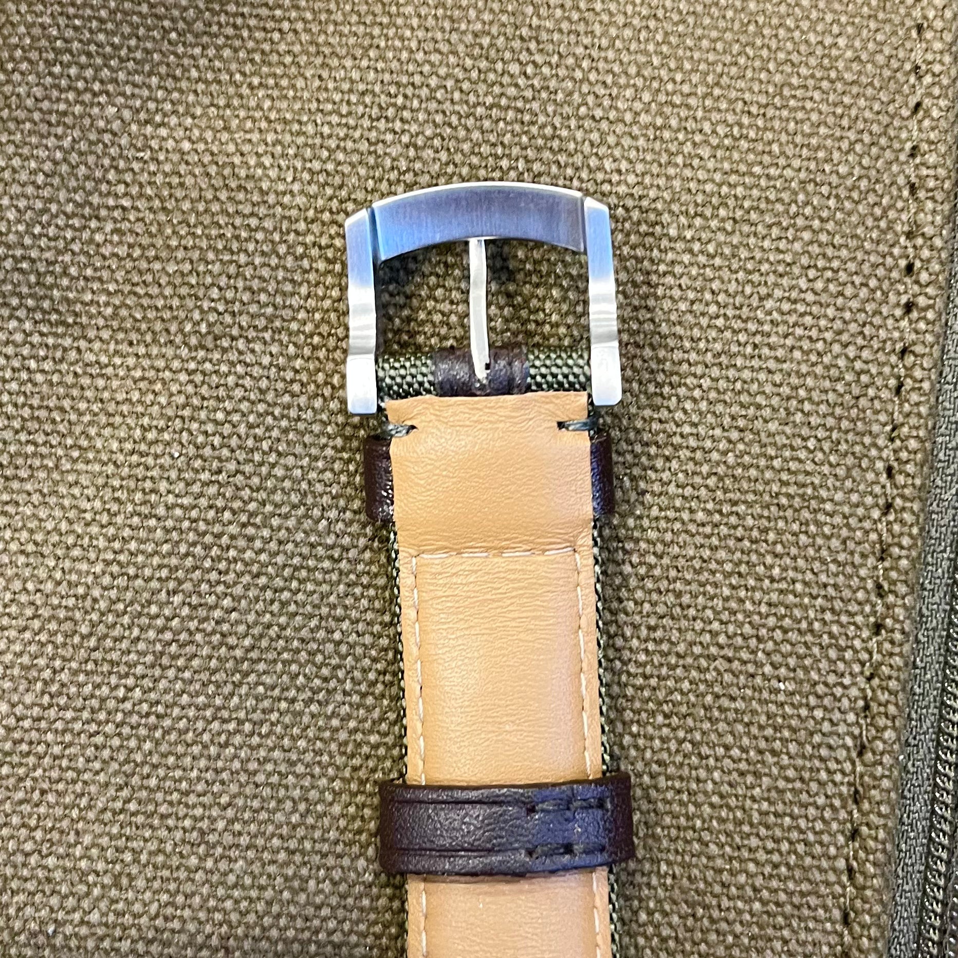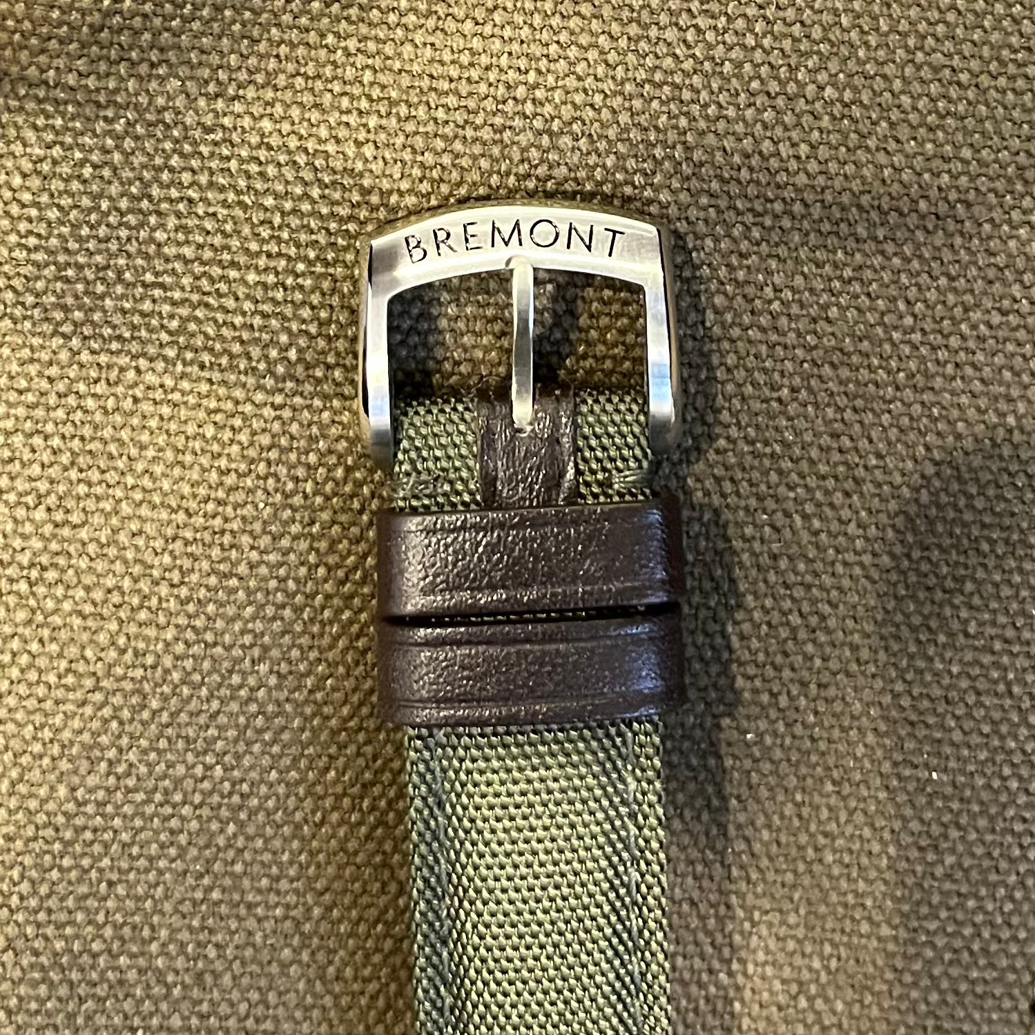 The Bremont Broadsword draws inspiration from the original 'Dirty Dozen' watches commissioned for the British Army during World War II. This model features a robust 40mm two-piece hardened and brushed stainless steel case. The black dial, protected by a domed and anti-reflective sapphire crystal, has large arabic numerals and several applications of Superluminova - ensuring excellent legibility. Powered by the chronometer rated BE-95-2AV automatic movement, the Broadsword offers precise and robust timekeeping. 100 meters of water resistance also ensures durability. The watch is complemented by a khaki green sailcloth strap with tan leather lining, providing both comfort and a distinctive military-inspired appearance.