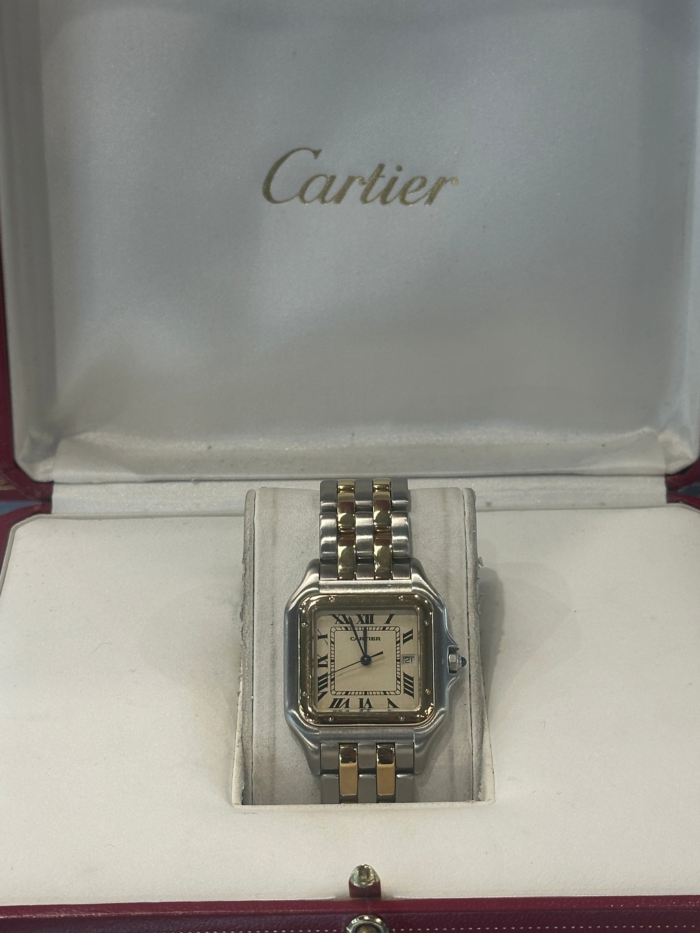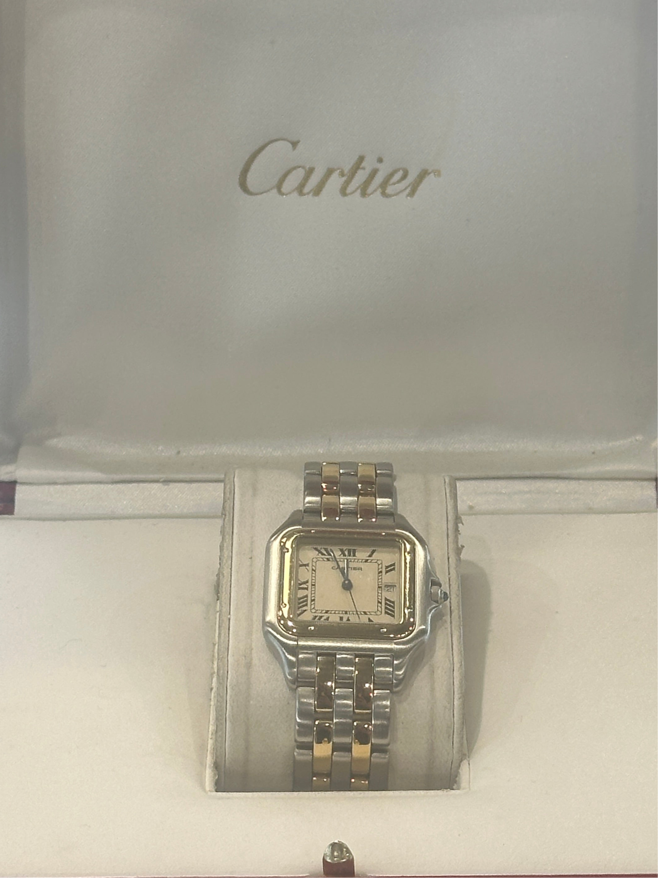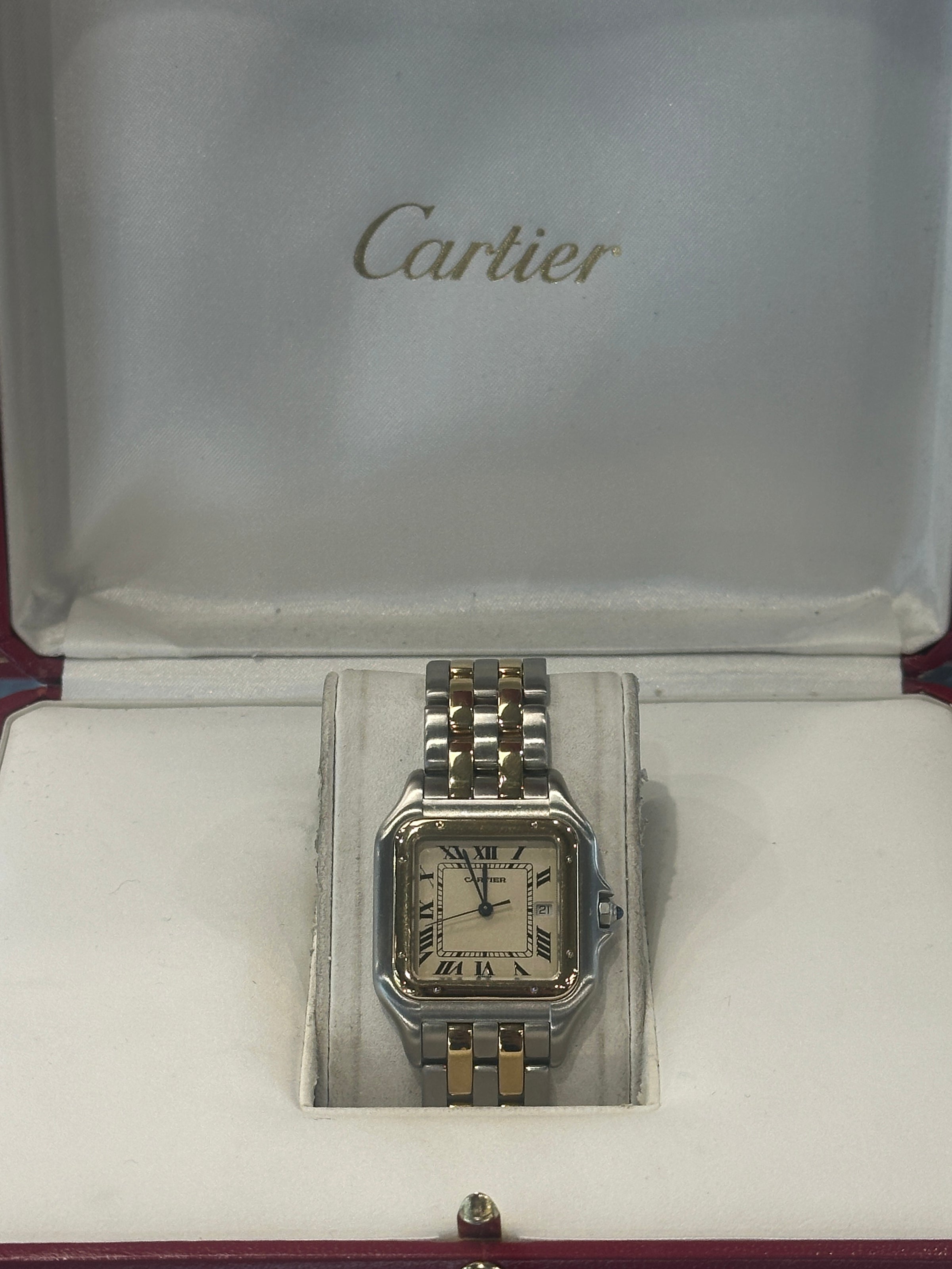 While initially offered in mixed metals, full gold and steel, and occasionally gemstone-set versions, the Panthère found popularity among both men and women. Some early two-tone versions with two rows of gold links (as in the “2-row”) are especially sought after.