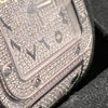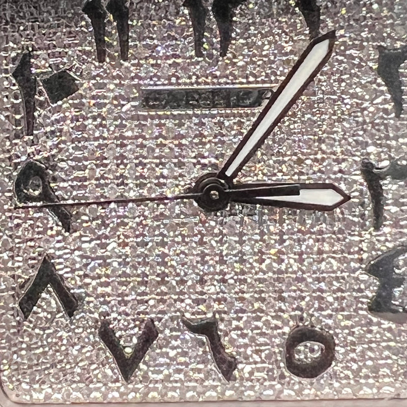 This beautiful stainless steel Cartier Santos 100 is completely covered with aftermarket set brilliant cut diamonds on the top of each link, shoulders, bezel and on the dial (Arabic numeral). A truly amazing sparkling watch with Arabic hour numbers.