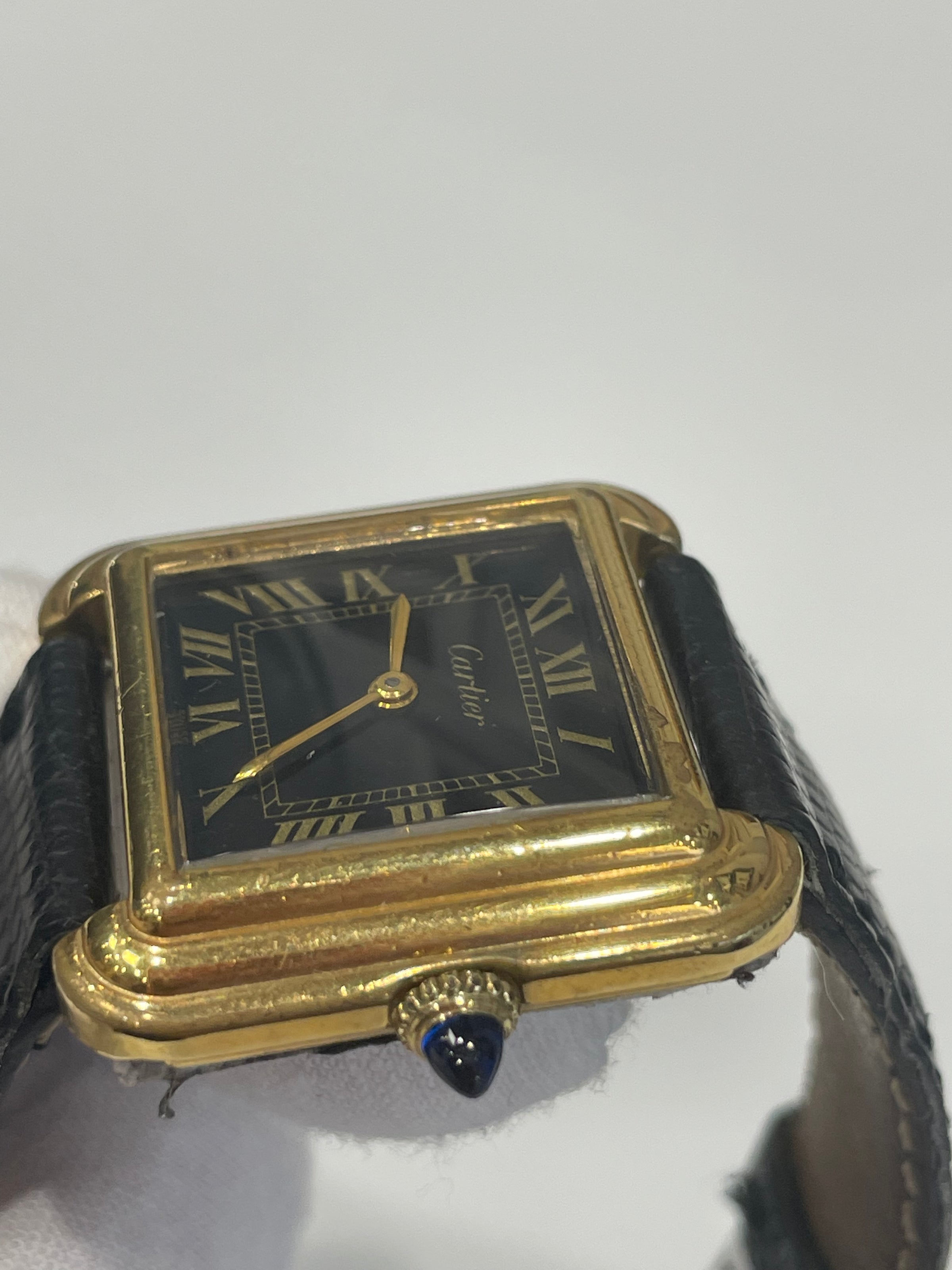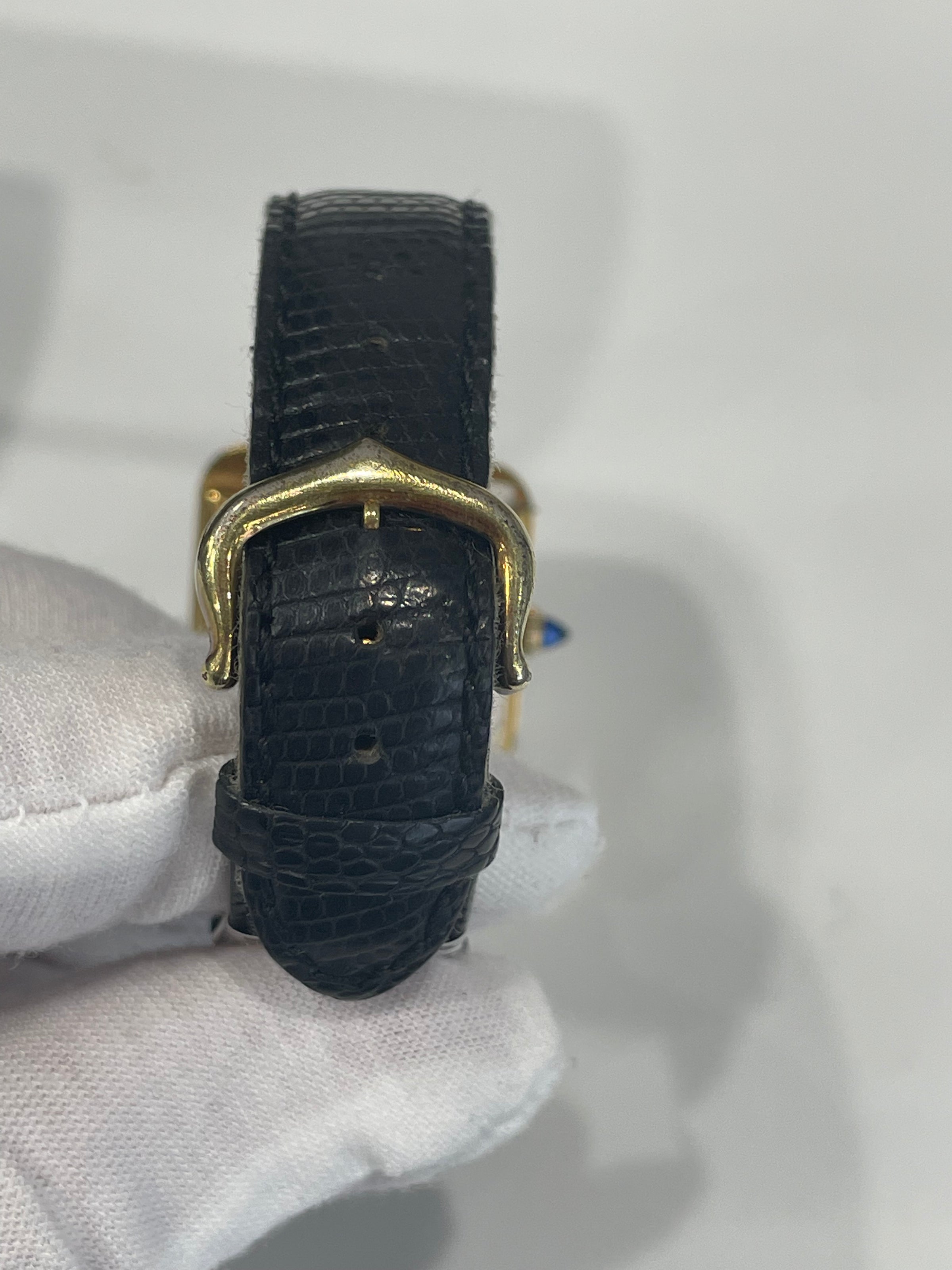 This stunning vintage Cartier is a 28mm yellow gold dress watch on a black leather lizard grain strap. This watch is completely original, though unfortunately does not come with its box or paperwork.