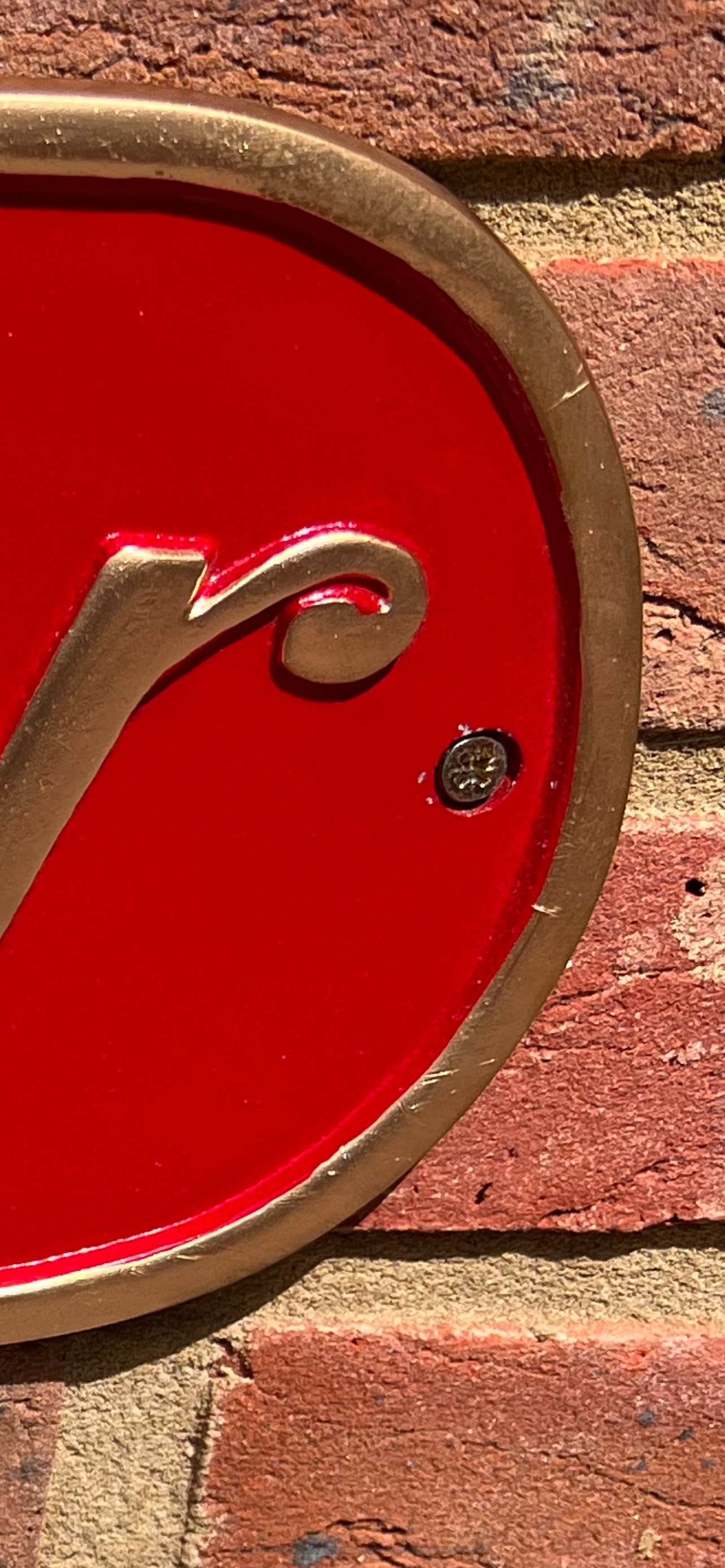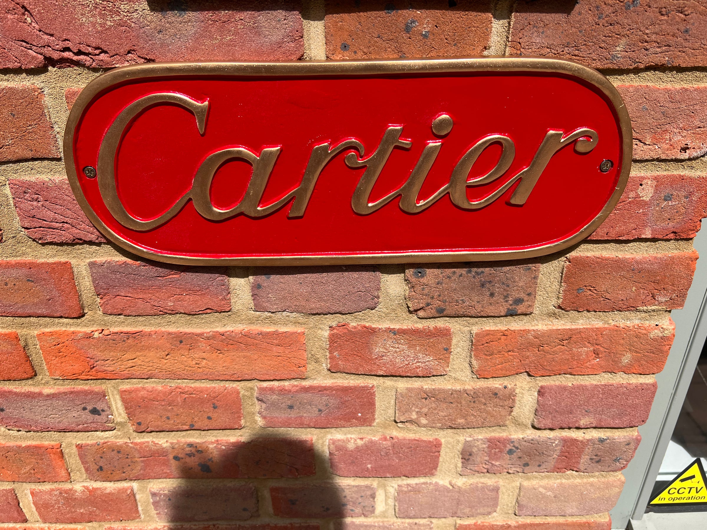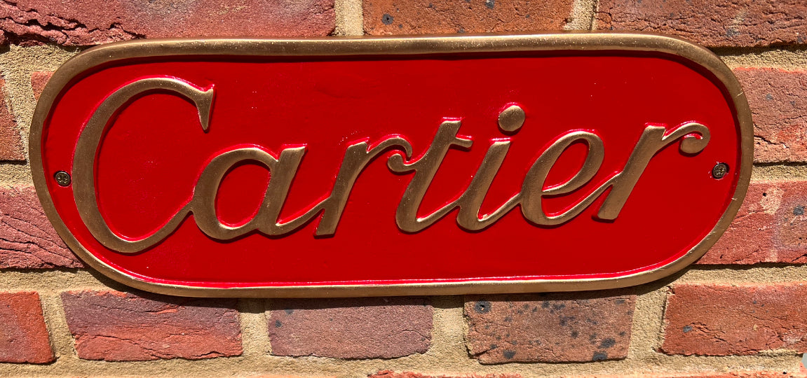 A solid metal Cartier exterior or interior display sign, made of solid metal with two fixing wholes and painted in traditional Cartier colours of red and gold