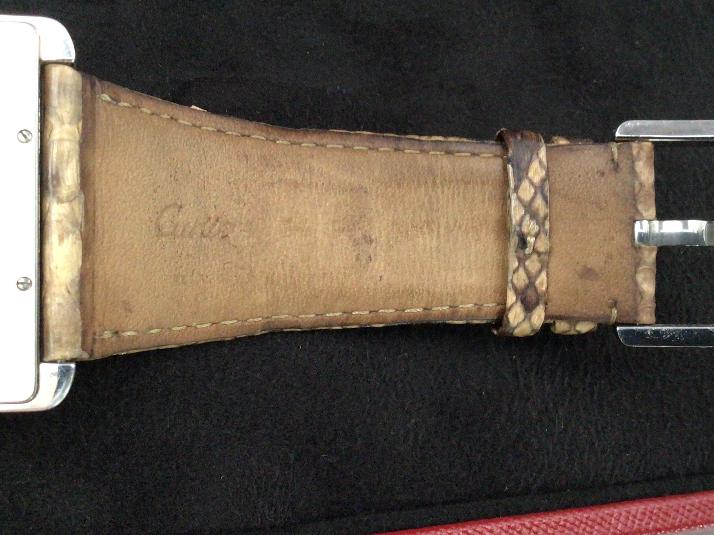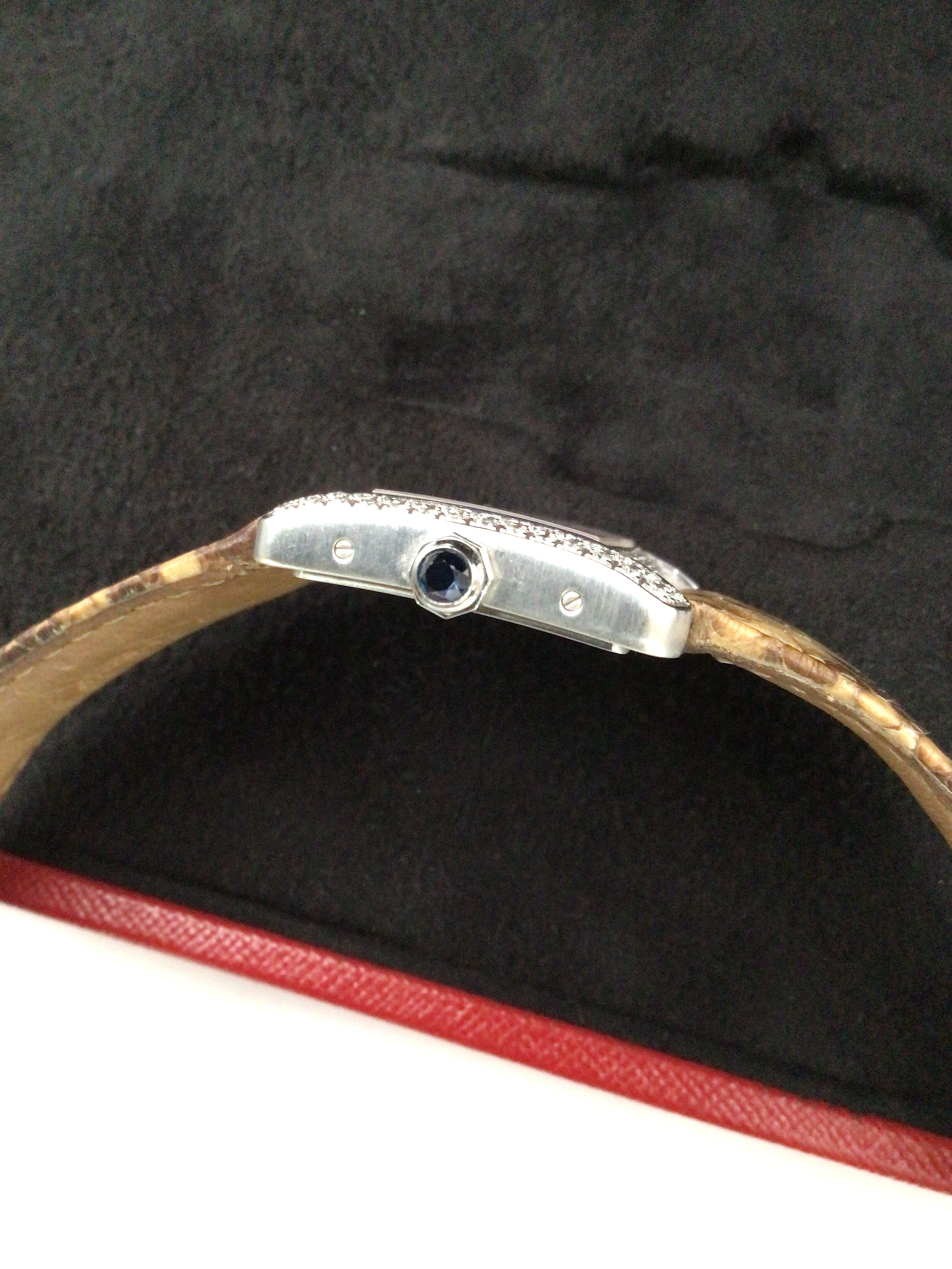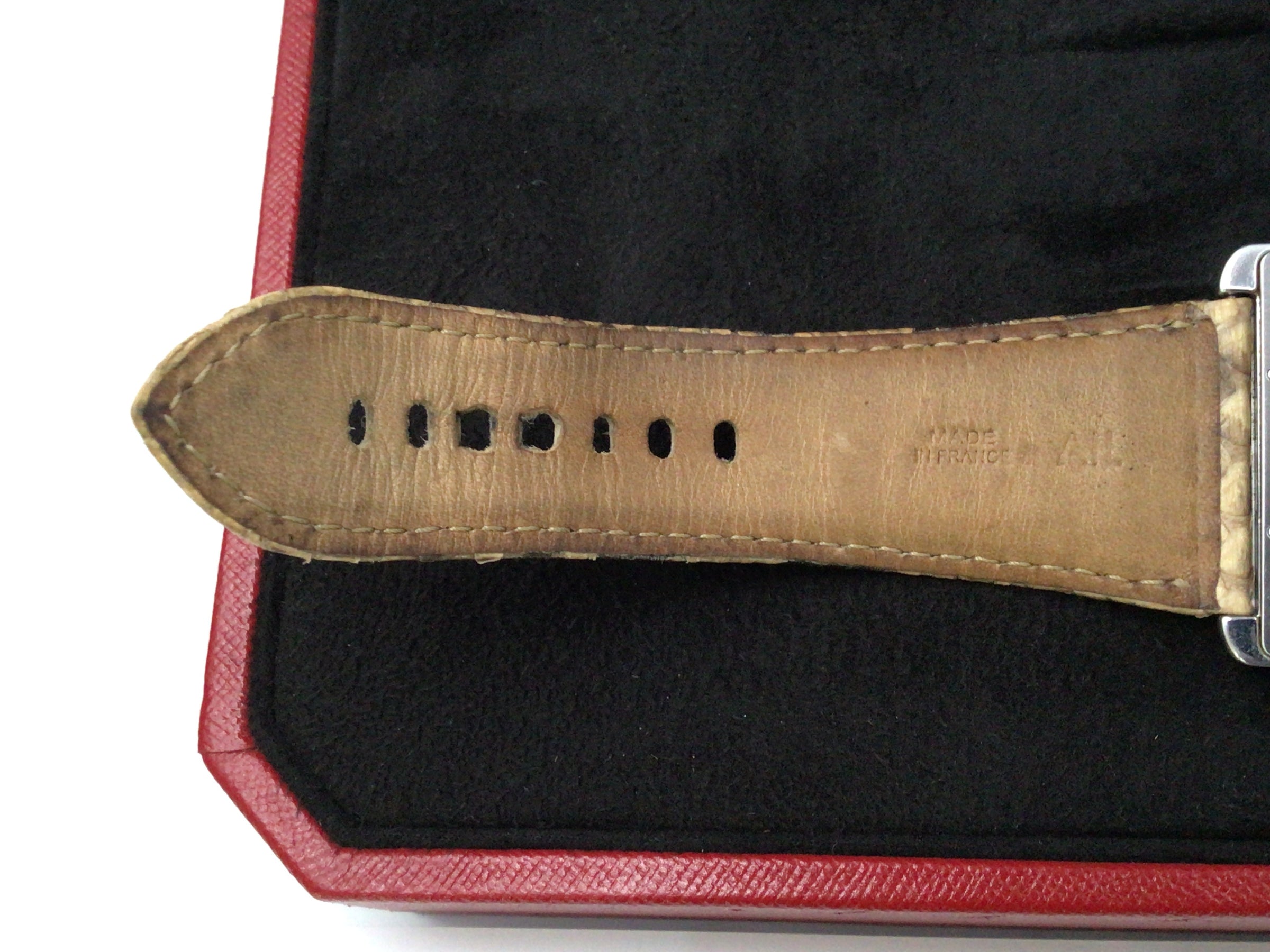 Materials & Design: Polished stainless-steel rectangular case (approximately 38 mm × 30 mm). Quartz movement calibre 690. The model offered includes a diamond-set bezel and lugs, adding refined sparkle to the classic lines. Dial is silvered with black Roman numerals, inner minute track, and blued steel sword-hands. Fitted with the original Cartier reptile-pattern leather strap and signed steel buckle.