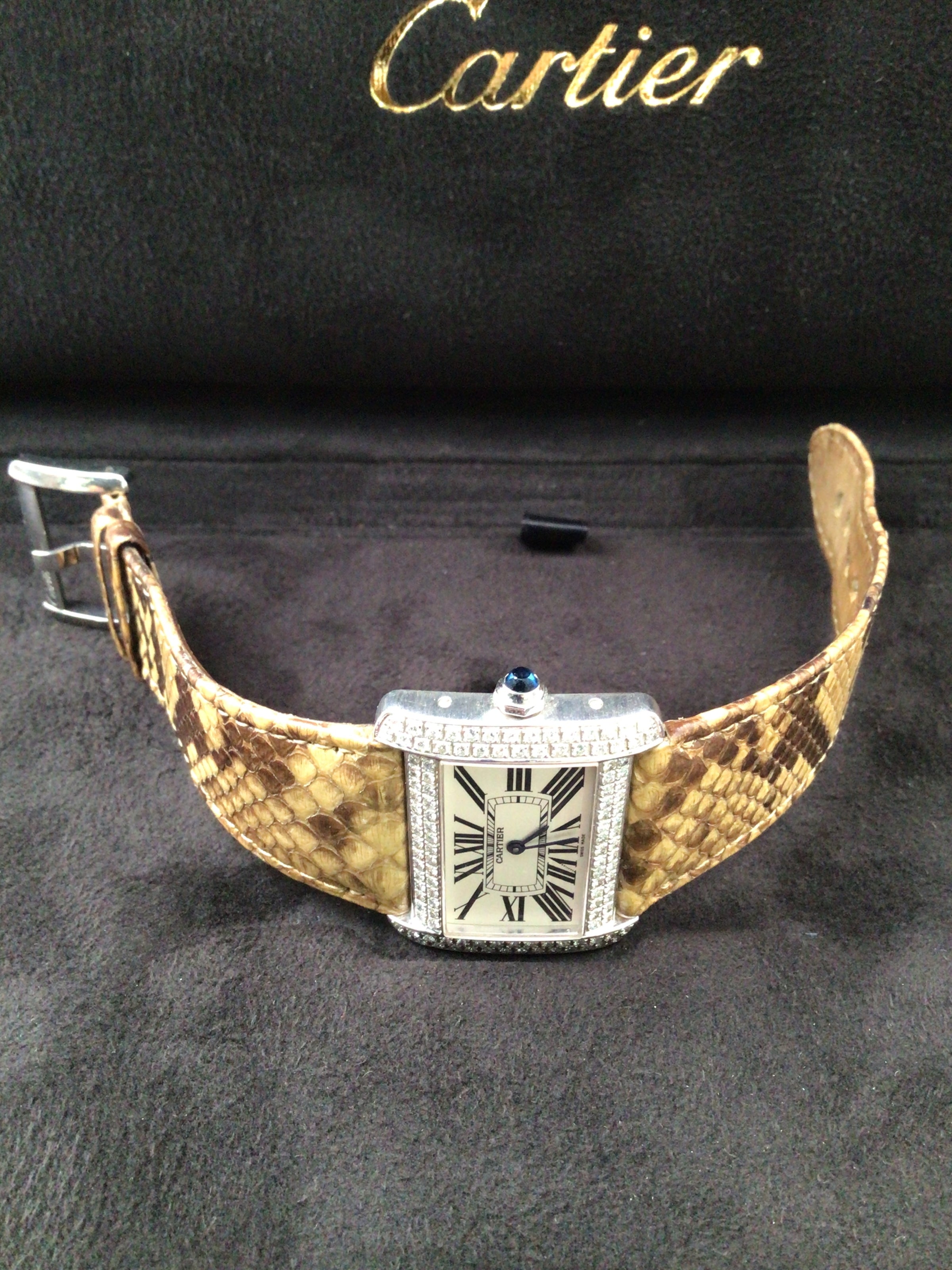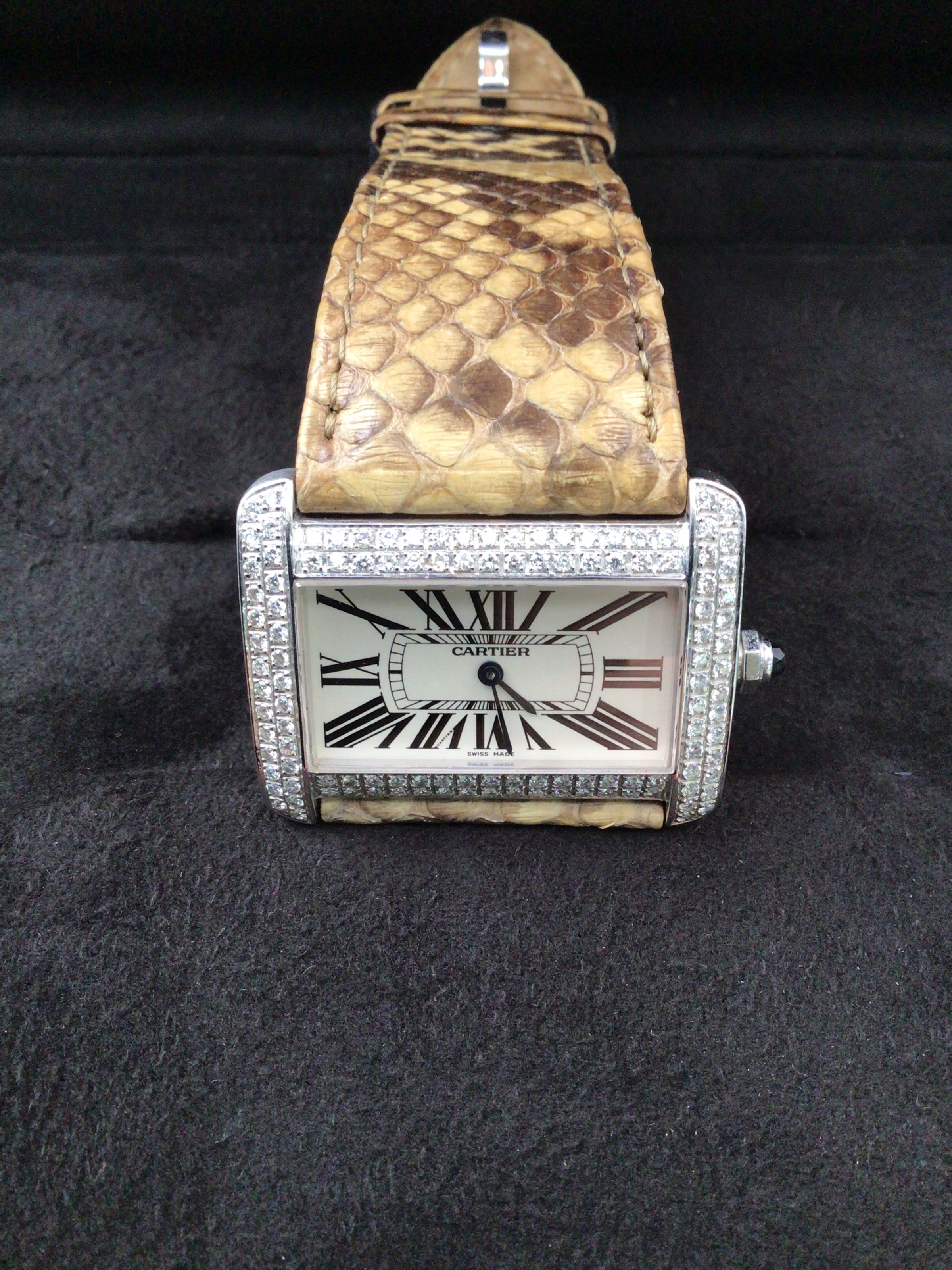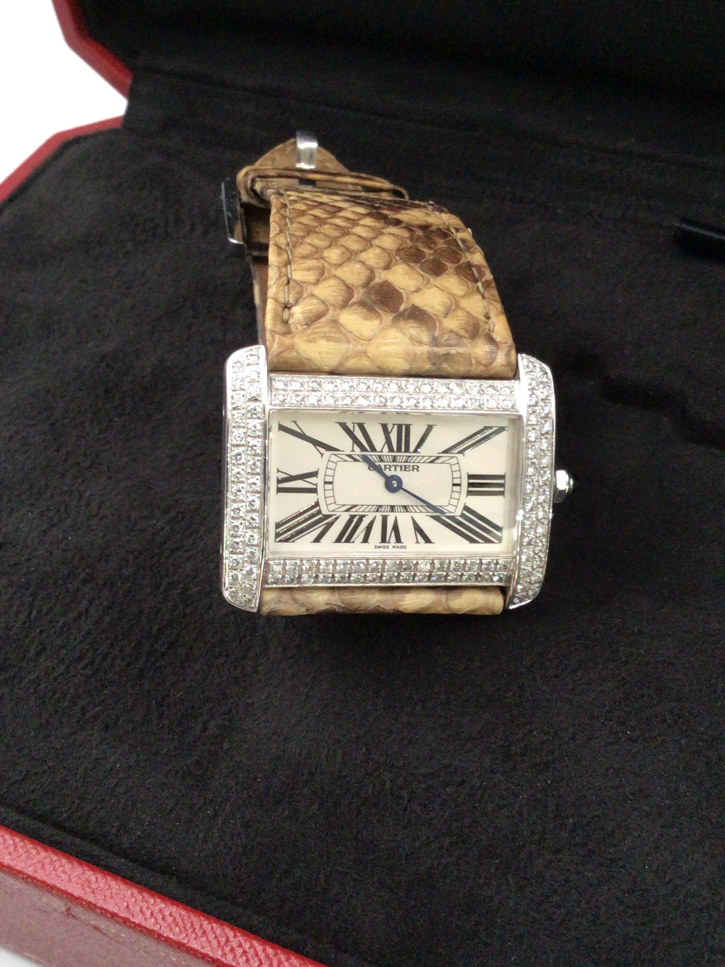 Materials & Design: Polished stainless-steel rectangular case (approximately 38 mm × 30 mm). Quartz movement calibre 690. The model offered includes a diamond-set bezel and lugs, adding refined sparkle to the classic lines. Dial is silvered with black Roman numerals, inner minute track, and blued steel sword-hands. Fitted with the original Cartier reptile-pattern leather strap and signed steel buckle.