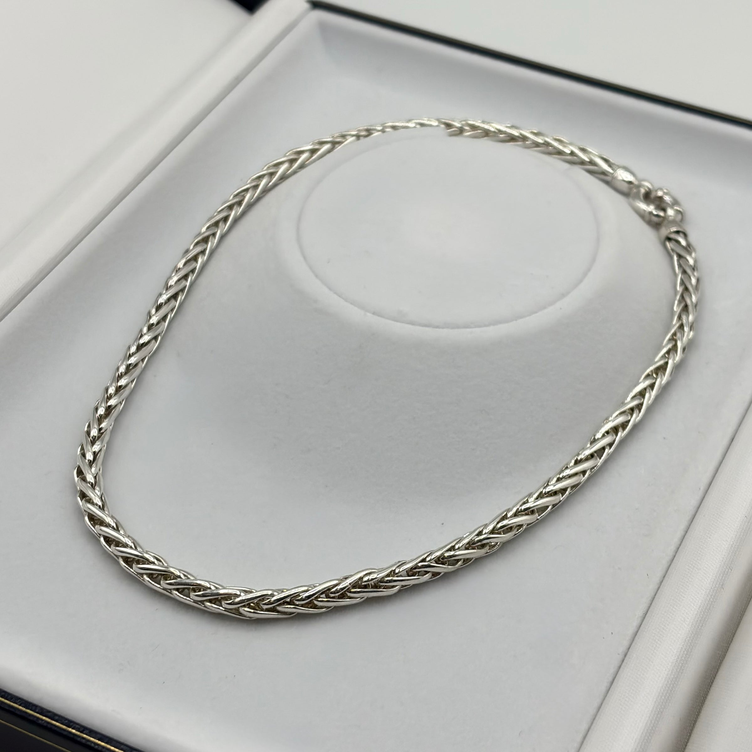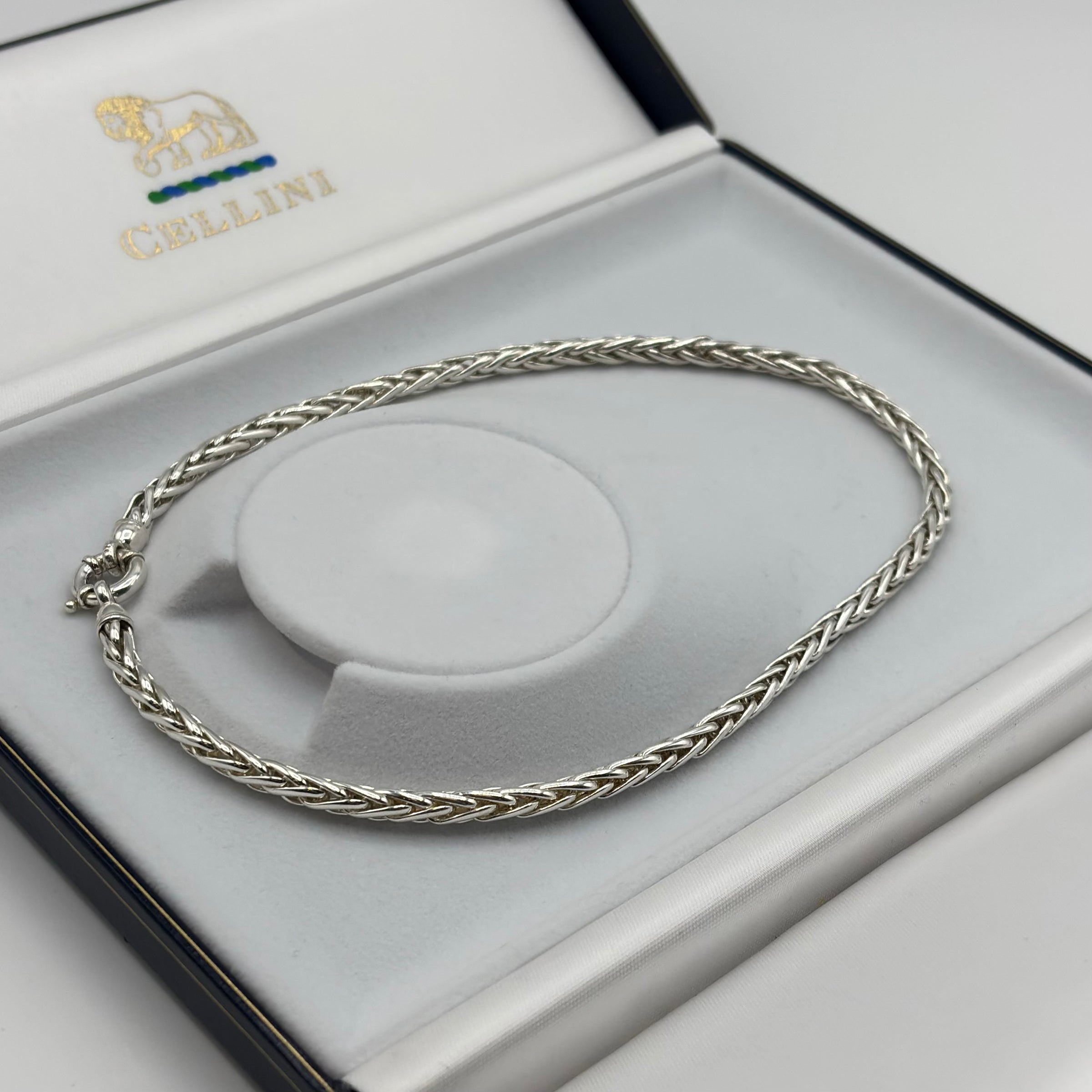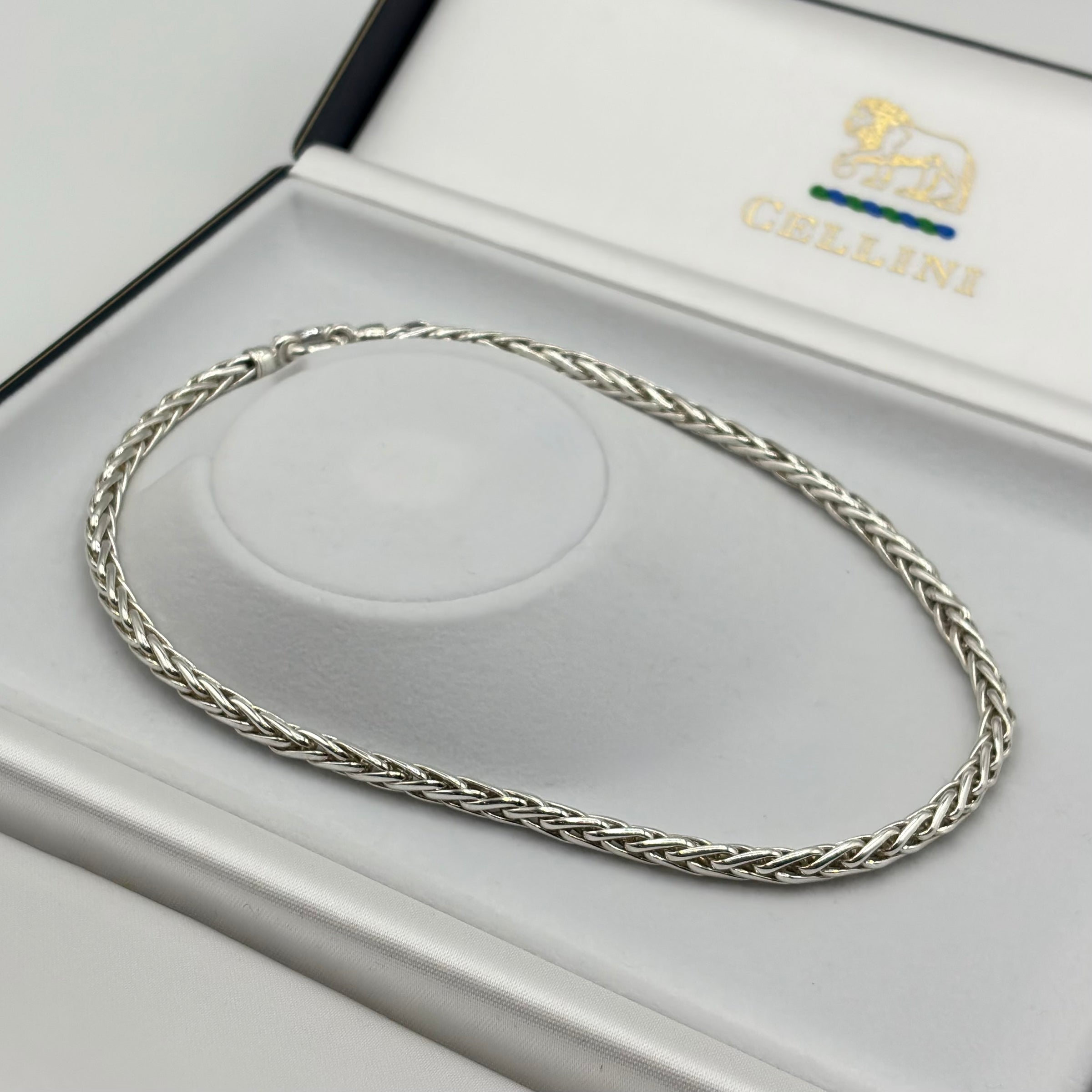 This elegant Cellini of Cambridge necklace is crafted from fine sterling silver (925), offering a beautifully polished finish that captures the light with subtle sophistication. The design embodies understated elegance, with a smooth, refined surface and secure clasp fastening that ensures comfort and durability. Measuring 39.5cm in length, the bracelet has a classic fit that makes it suitable for both everyday wear and formal occasions. Hallmarked and signed, it reflects Cellini’s commitment to timeless craftsmanship and enduring style.
