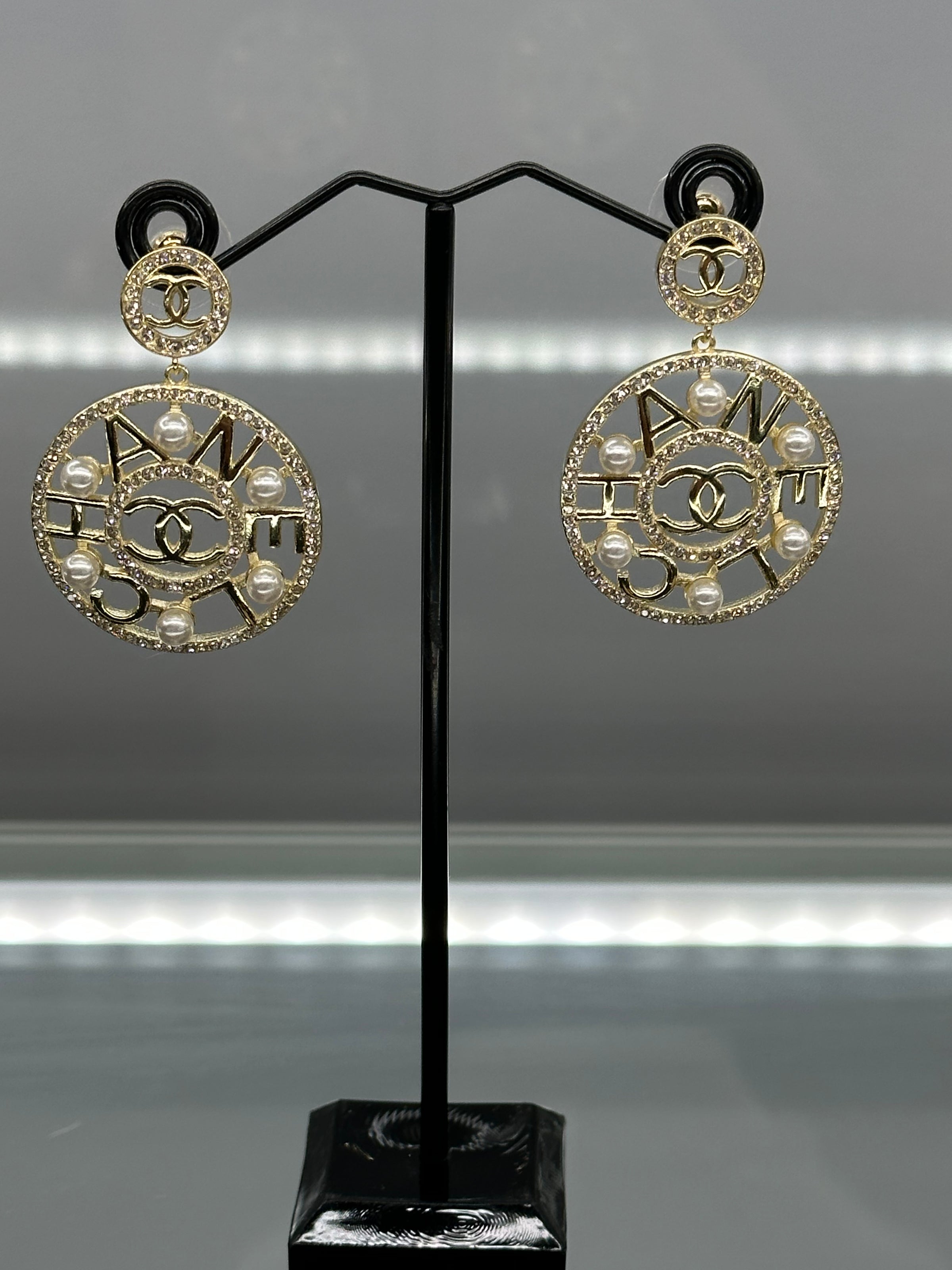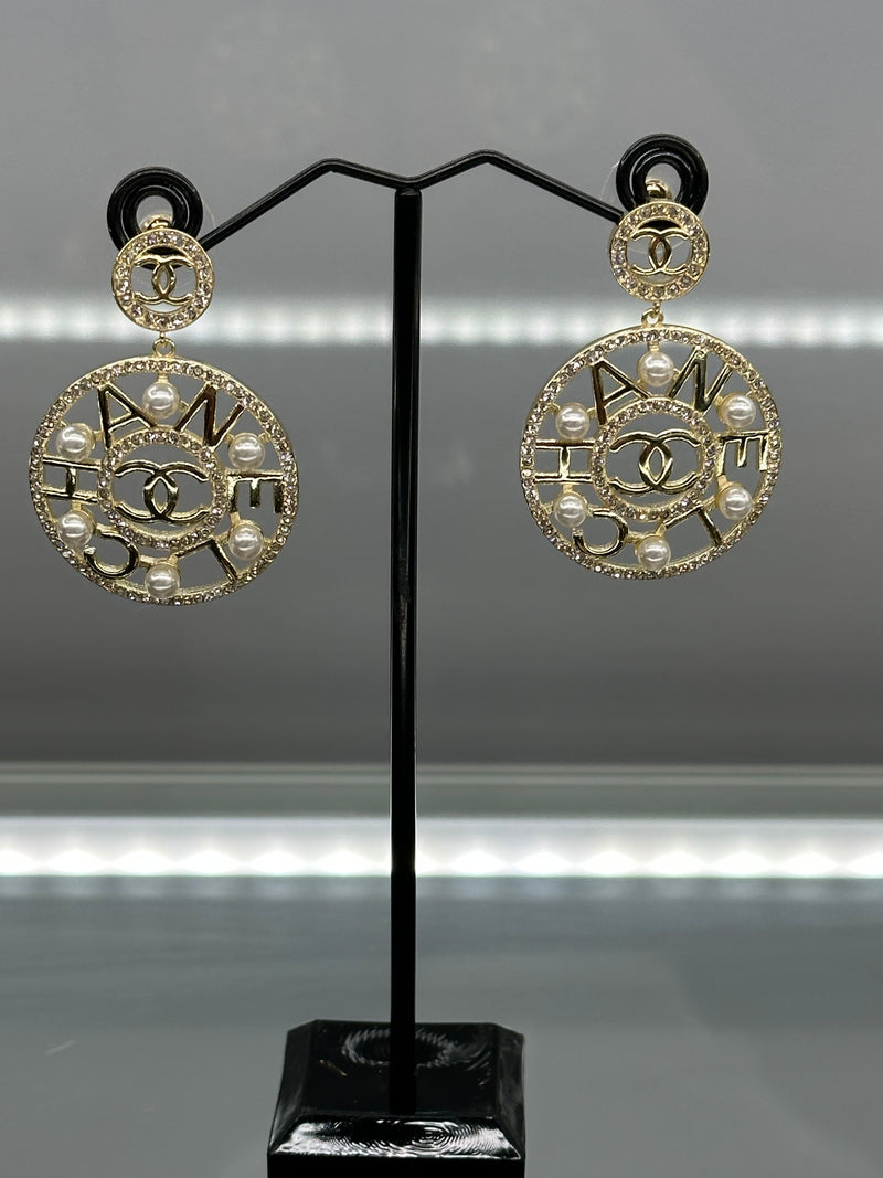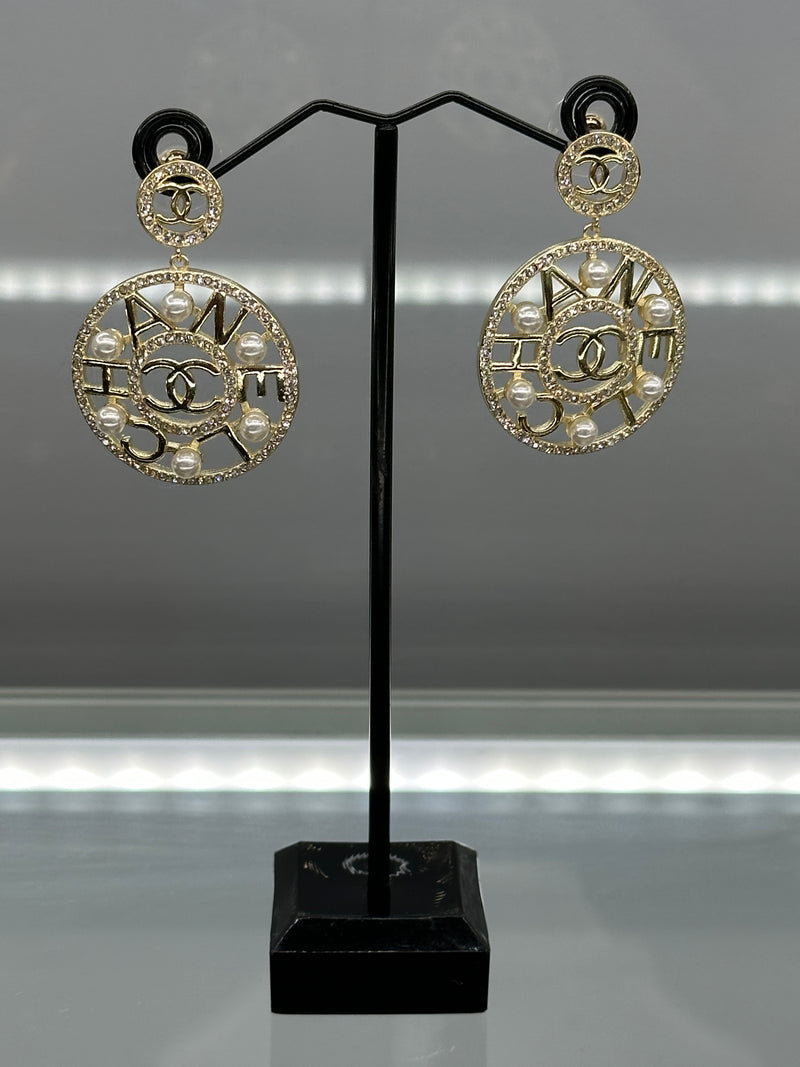 Gold Plated Disc Surrounded by Pearls With The Word Chanel In The Middle With 2 Rings Of Crystals And 6Fresh Water Pearls In Each Earring