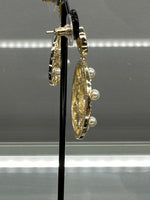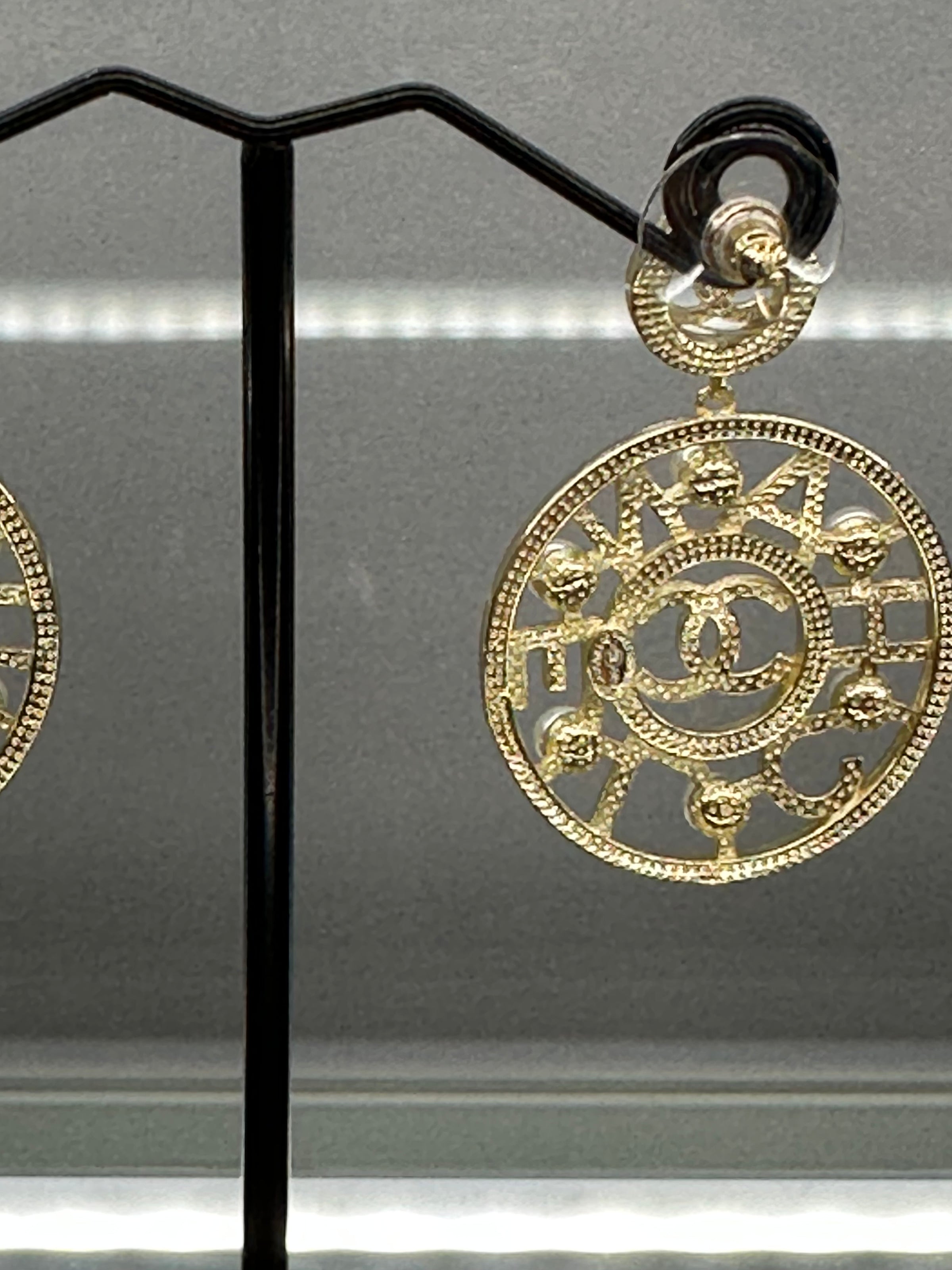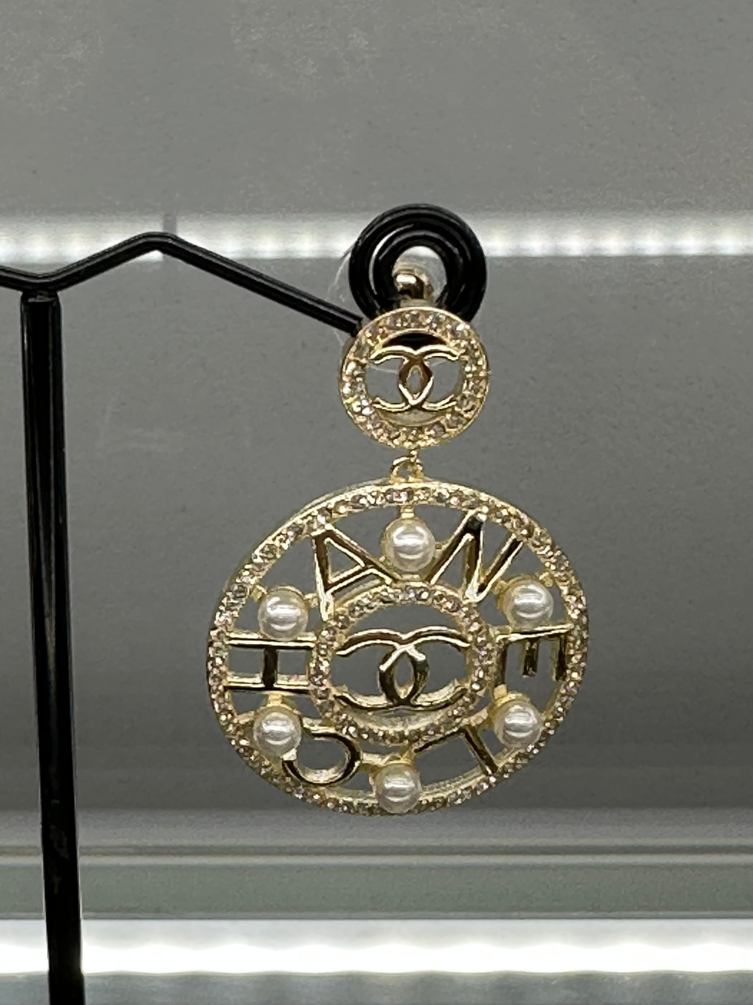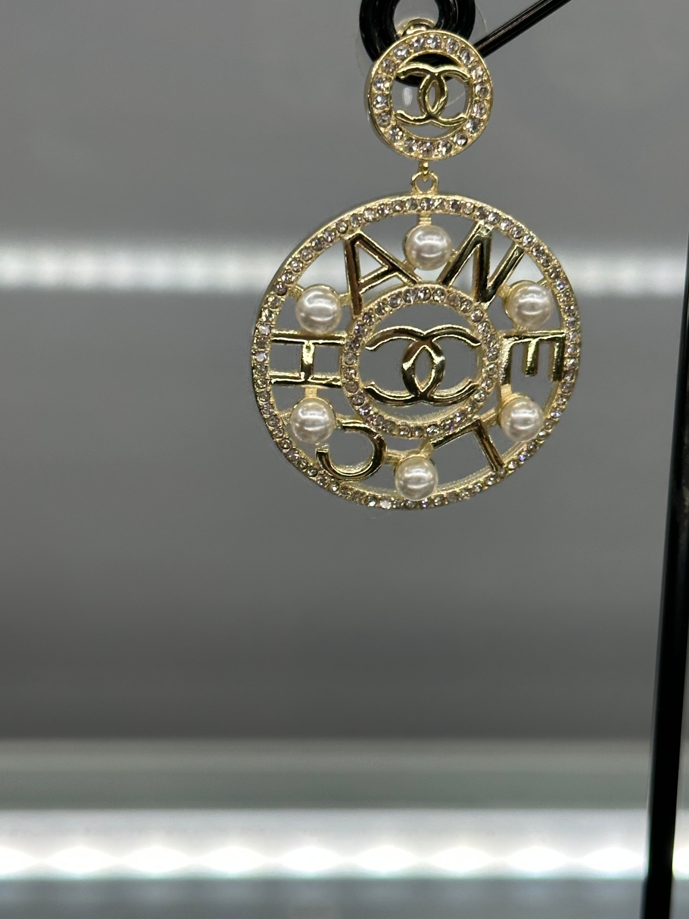 Gold Plated Disc Surrounded by Pearls With The Word Chanel In The Middle With 2 Rings Of Crystals And 6Fresh Water Pearls In Each Earring