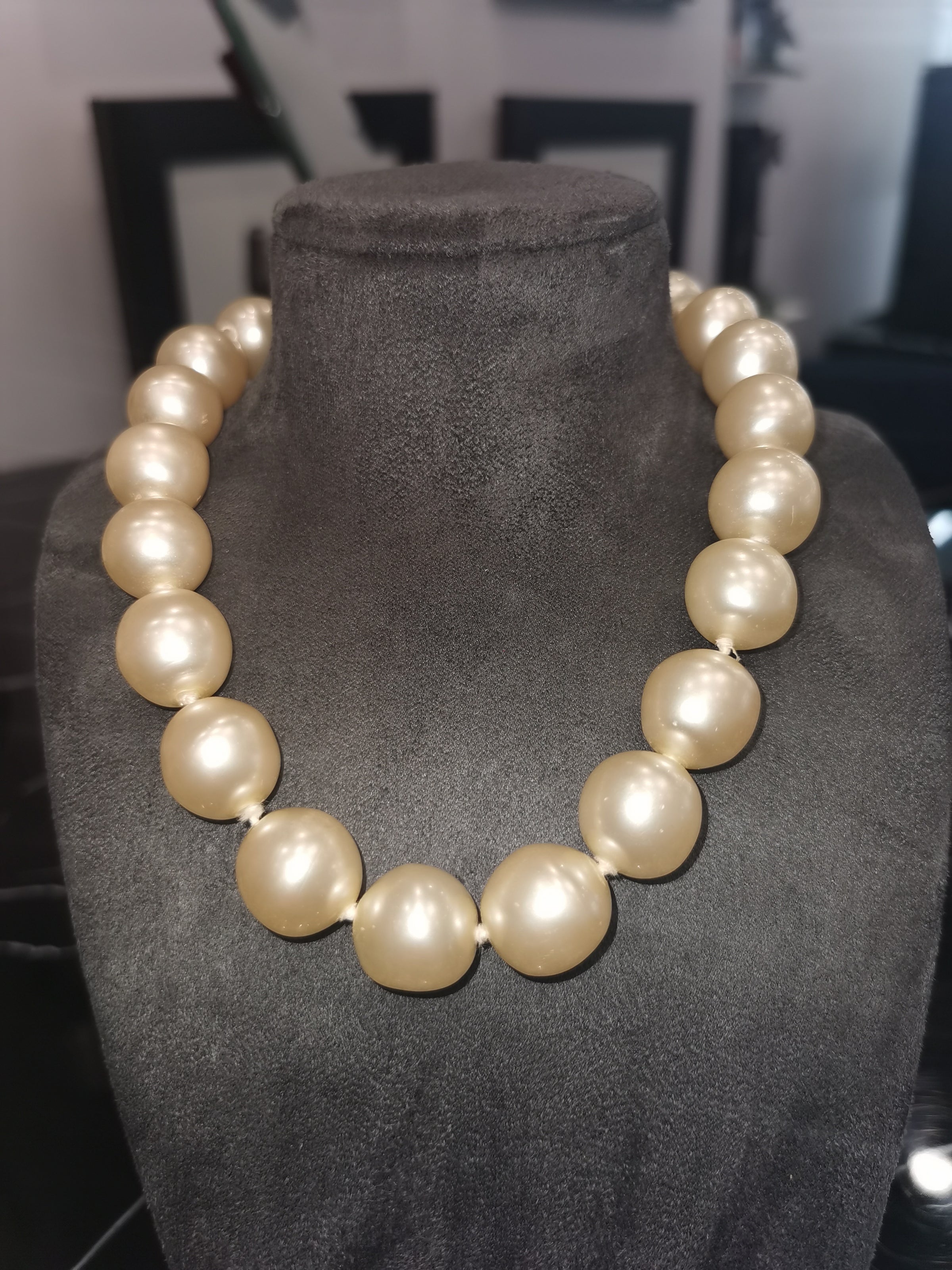 This reworked Chanel pearl necklace features elegant cream-coloured faux pearls, each measuring approximately 16mm for a bold, classic look. The strand is secured with a gold-plated bolt ring clasp, offering both functionality and a refined finish. The oversized pearls create a vintage-inspired silhouette, perfectly balanced by Chanel’s signature sophistication. -