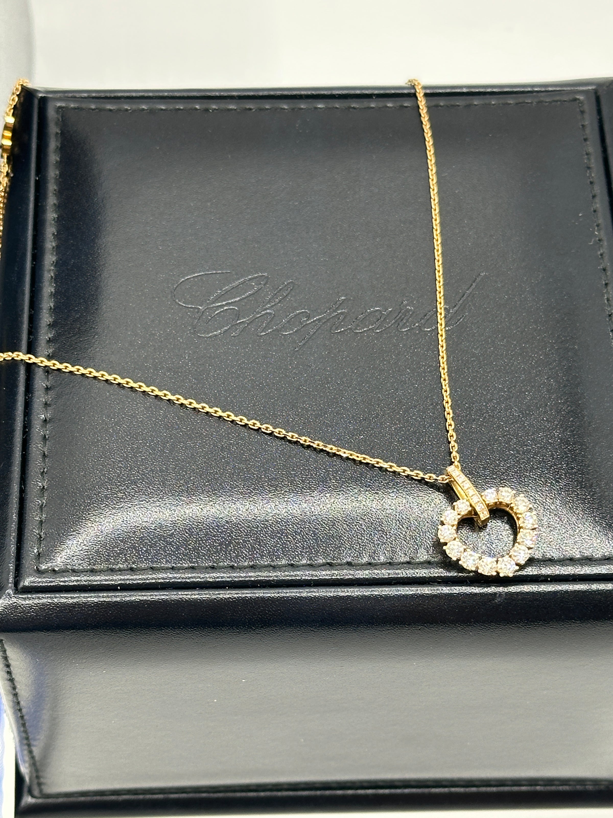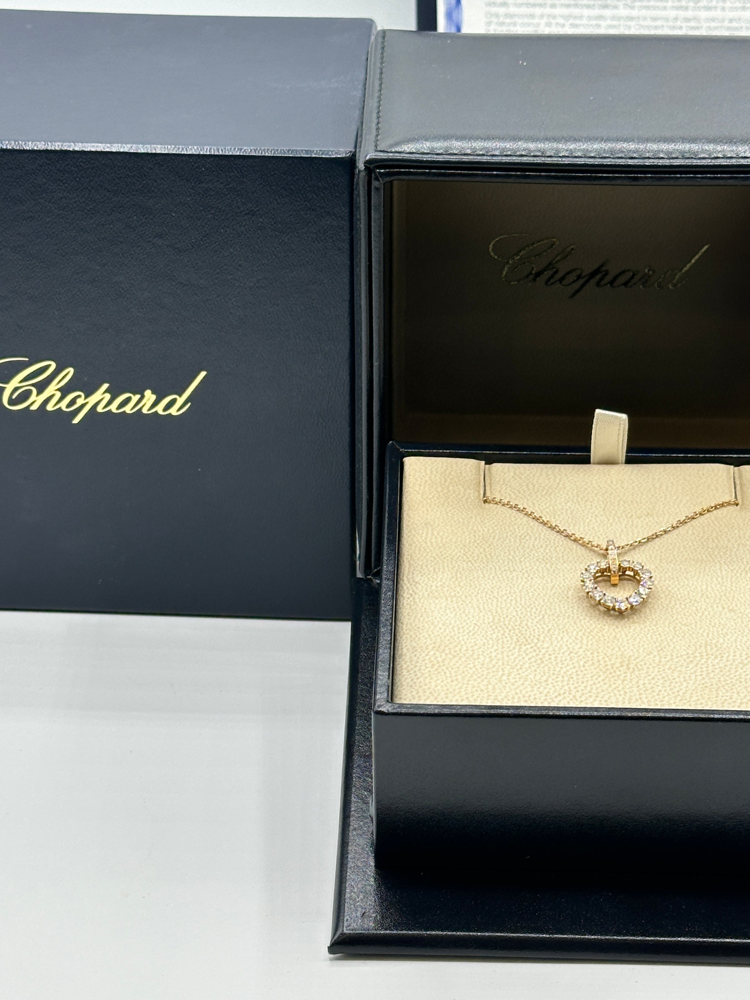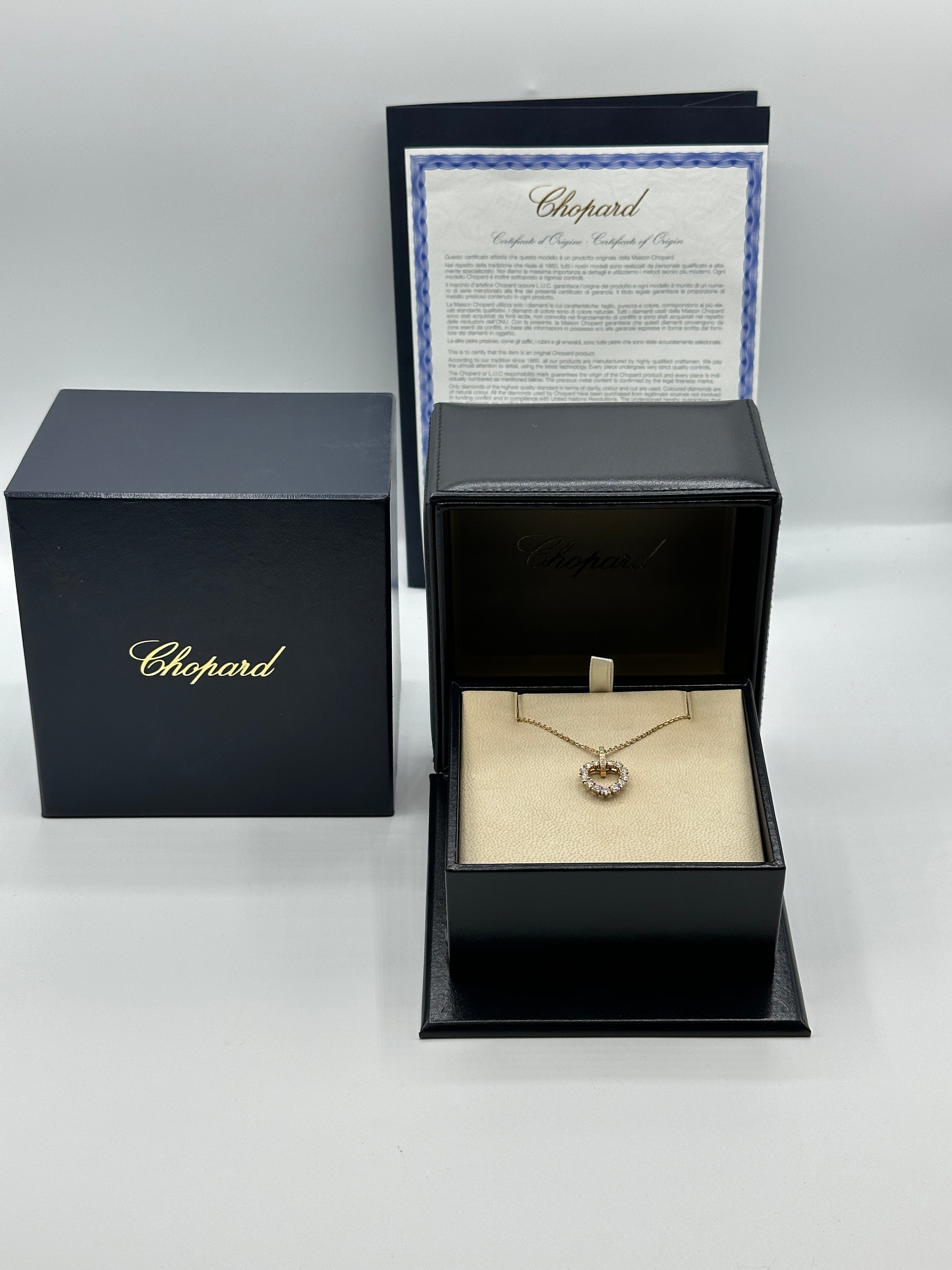 This pendant is not part of the “Happy Diamonds” range—it features a fully-set heart silhouette, where the diamonds are fixed into the design rather than floating between sapphire crystals. It reflects Chopard’s more classic fine jewellery aesthetic, showcasing precision stone setting and timeless romantic symbolism.