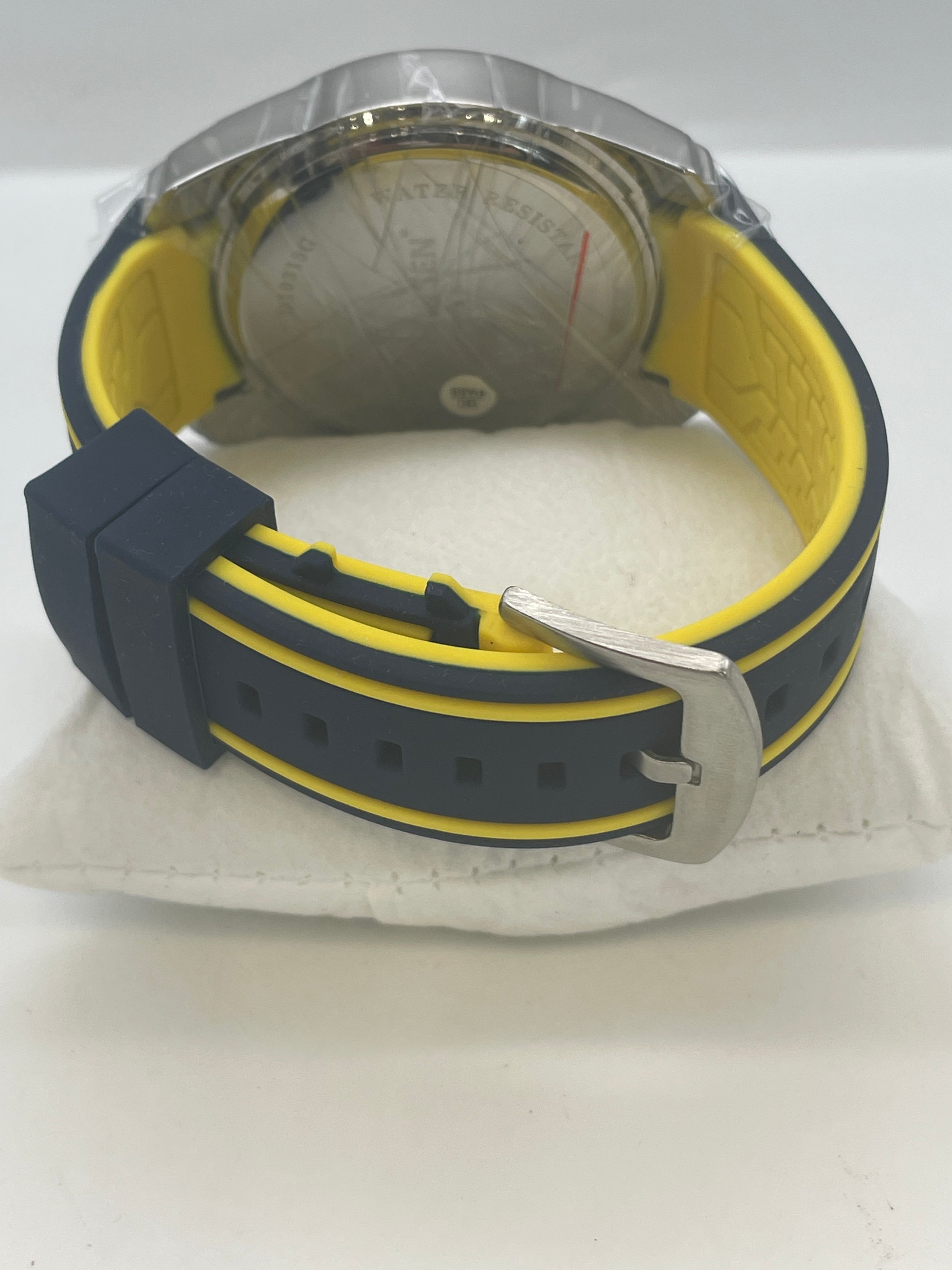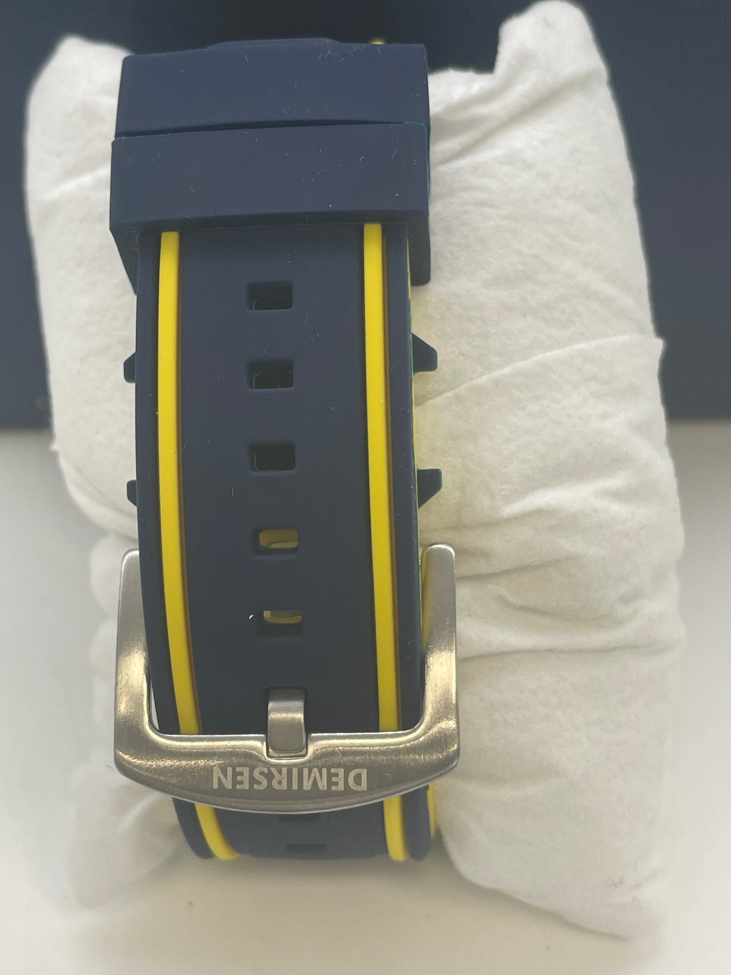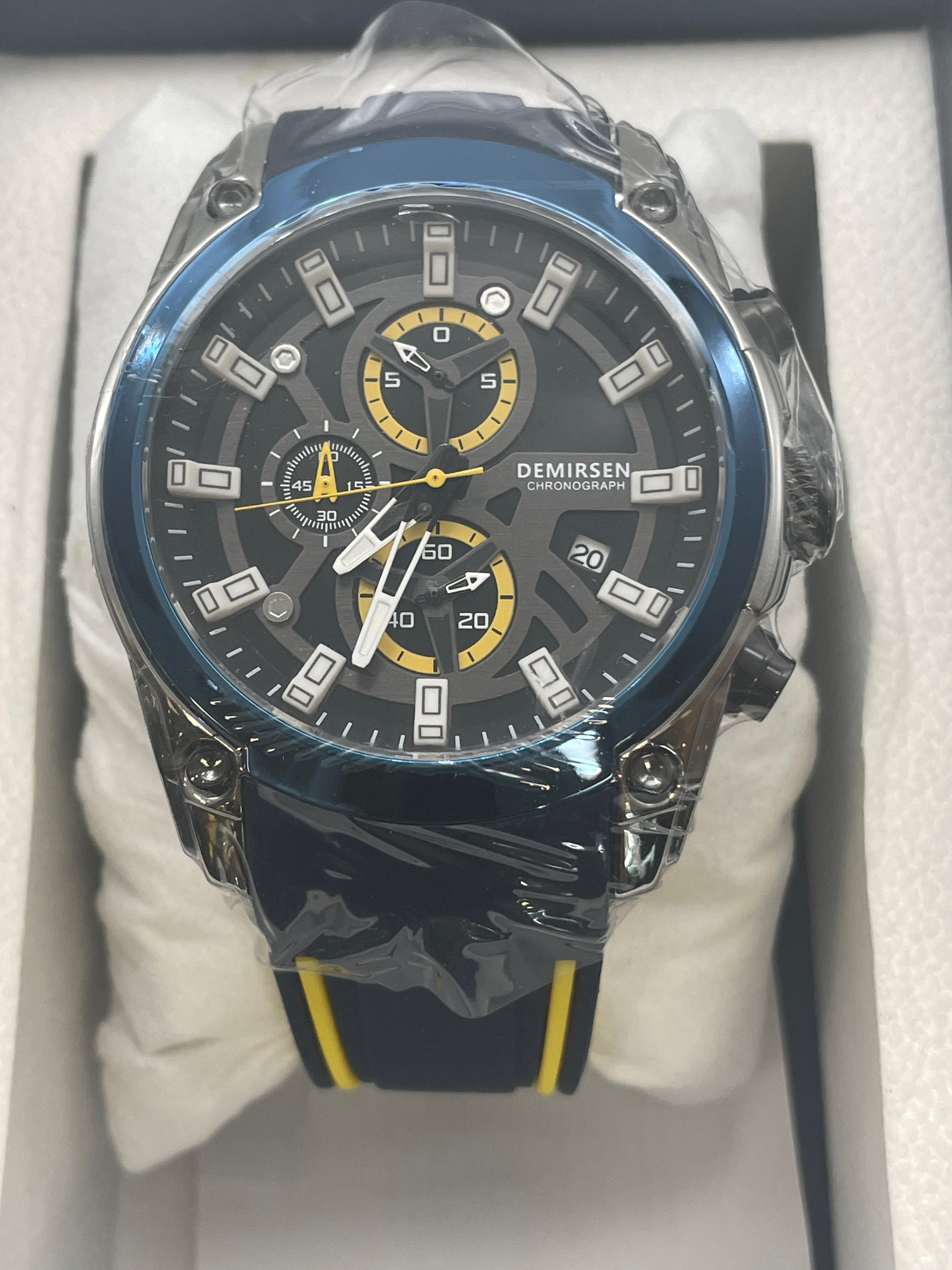This Demirsen chronograph features a 42mm case, bright blue smooth bezel, black dial with yellow outlined chronograph dials with white minute and hour hands and a yellow second hand. This watch comes on a blue silicone strap with yellow beading on the edge and is the perfect everyday watch .