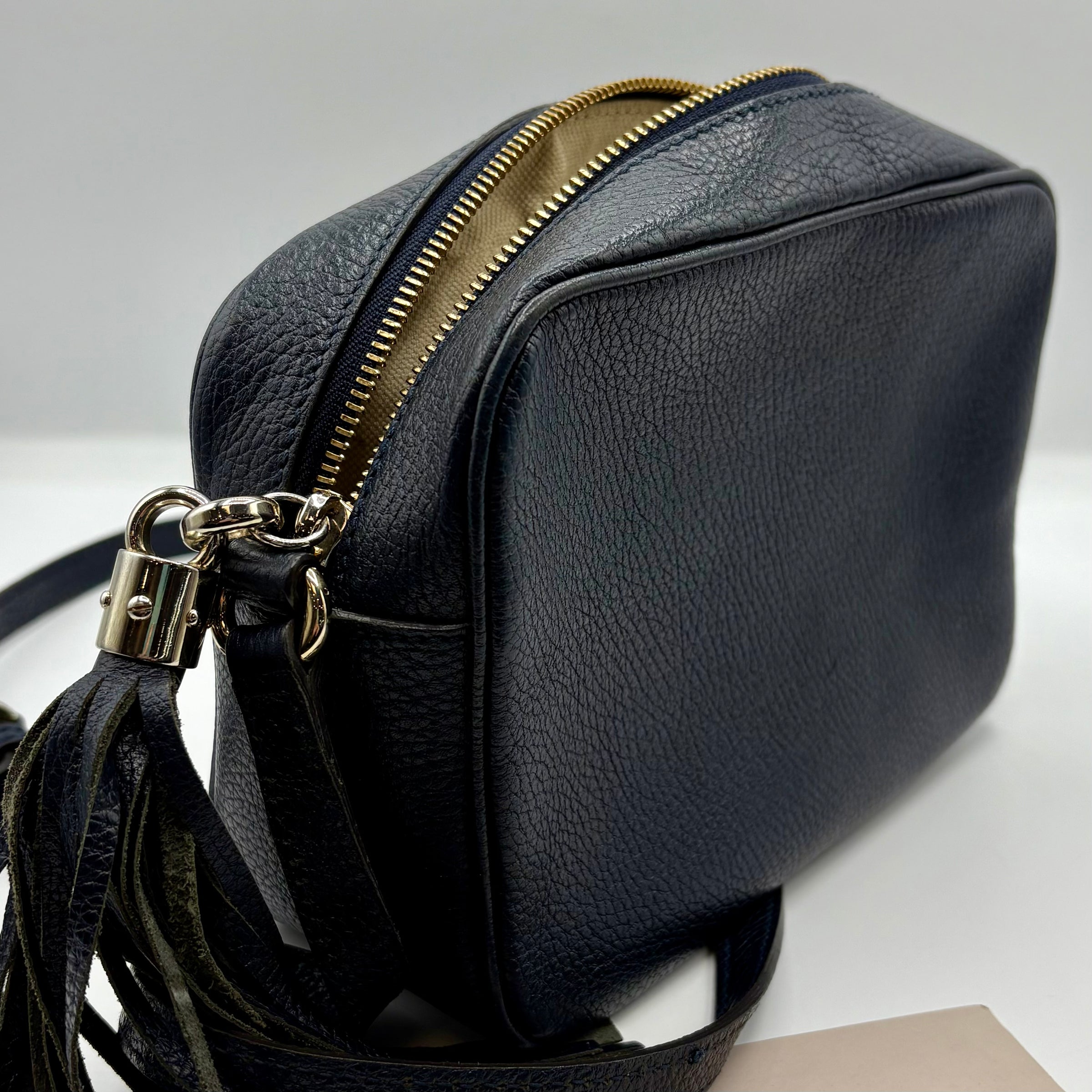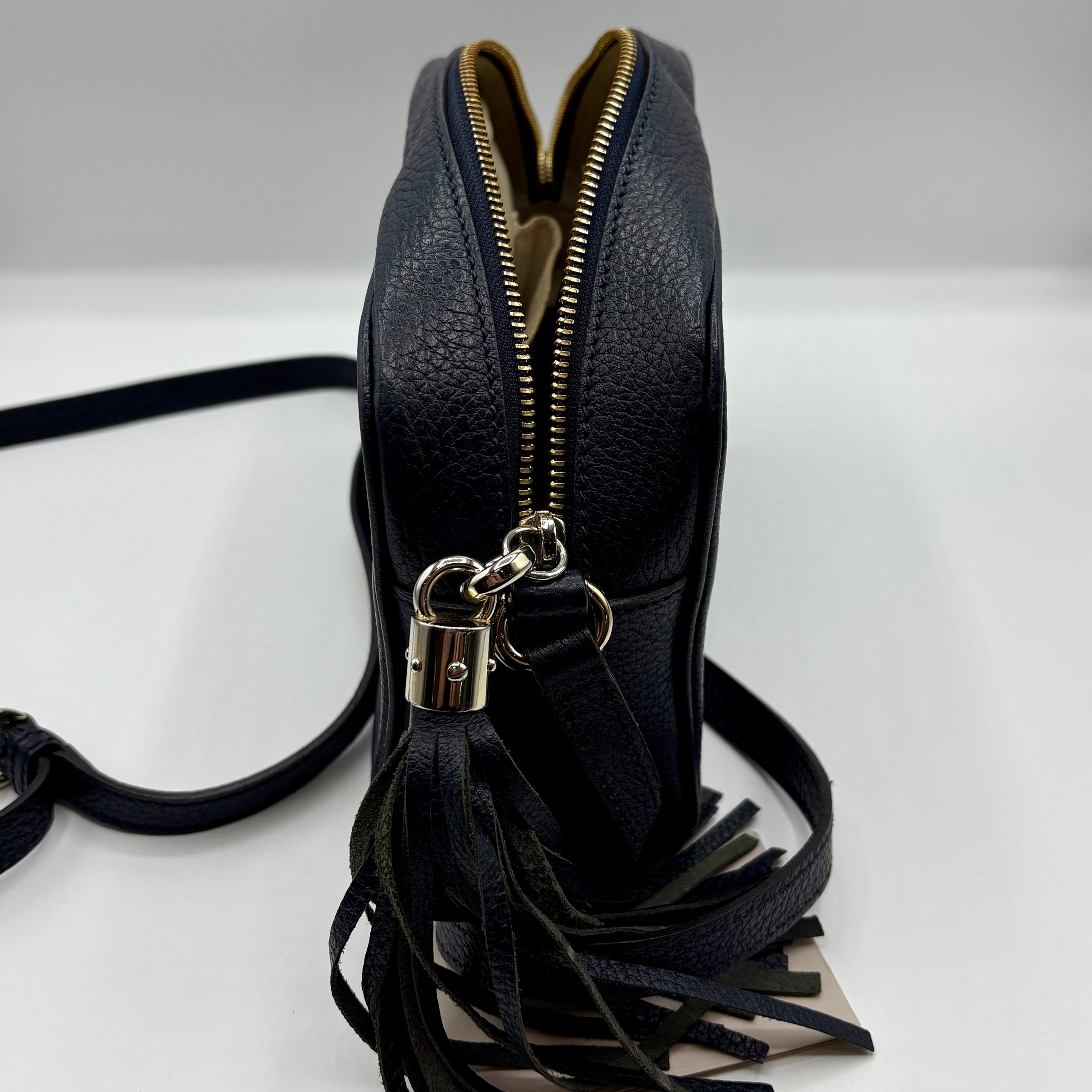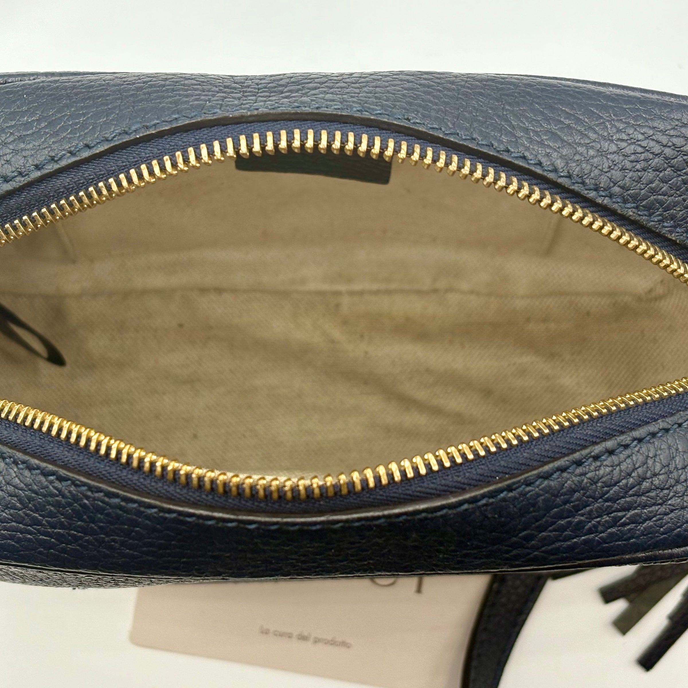 Crafted from supple navy blue pebbled calfskin leather, this Gucci hobo bag offers a refined texture and relaxed silhouette that makes it both elegant and effortlessly wearable. The design features soft curves, structured construction, and is complemented by polished gold-tone hardware, including a signature tassel accent for added character. Its generously sized interior provides ample space for daily essentials, complete with a zip closure for security and a canvas lining for longevity.