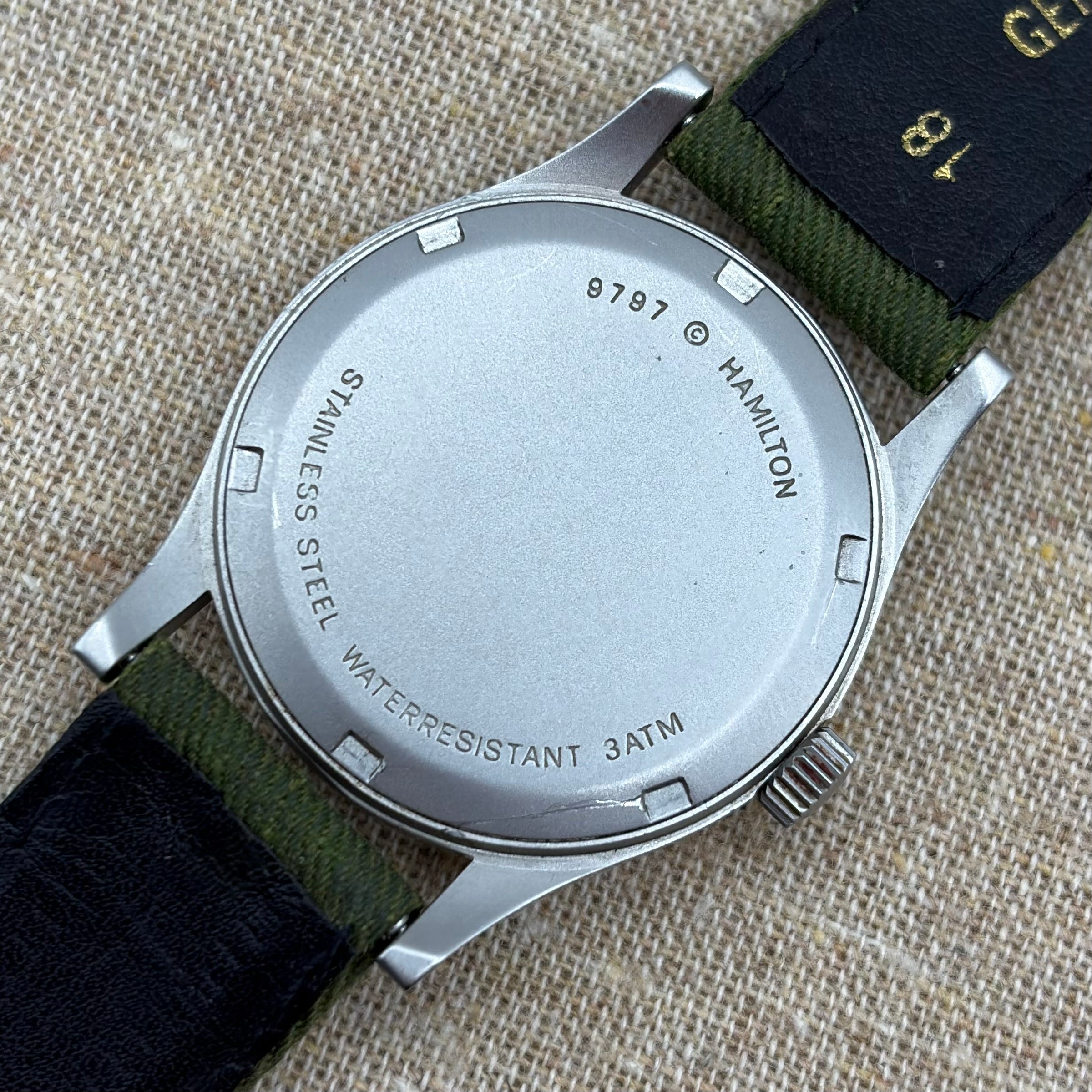 Likely from the 1980s or 1990s, this Hamilton Khaki Ref. 9797 is a compact, military-inspired field watch. Made of bead-blasted stainless steel, its 33mm case contains a high quality Swiss quartz movement and one of the most iconic field watch dials. Wearing bigger than the dimensions suggest, and extremely comfortable due to its light weight, this Khaki is a delight on the wrist. Increasingly collectible, this would make an excellent purchase for collectors looking for an inexpensive, vintage aesthetic 'grab and go' watch.