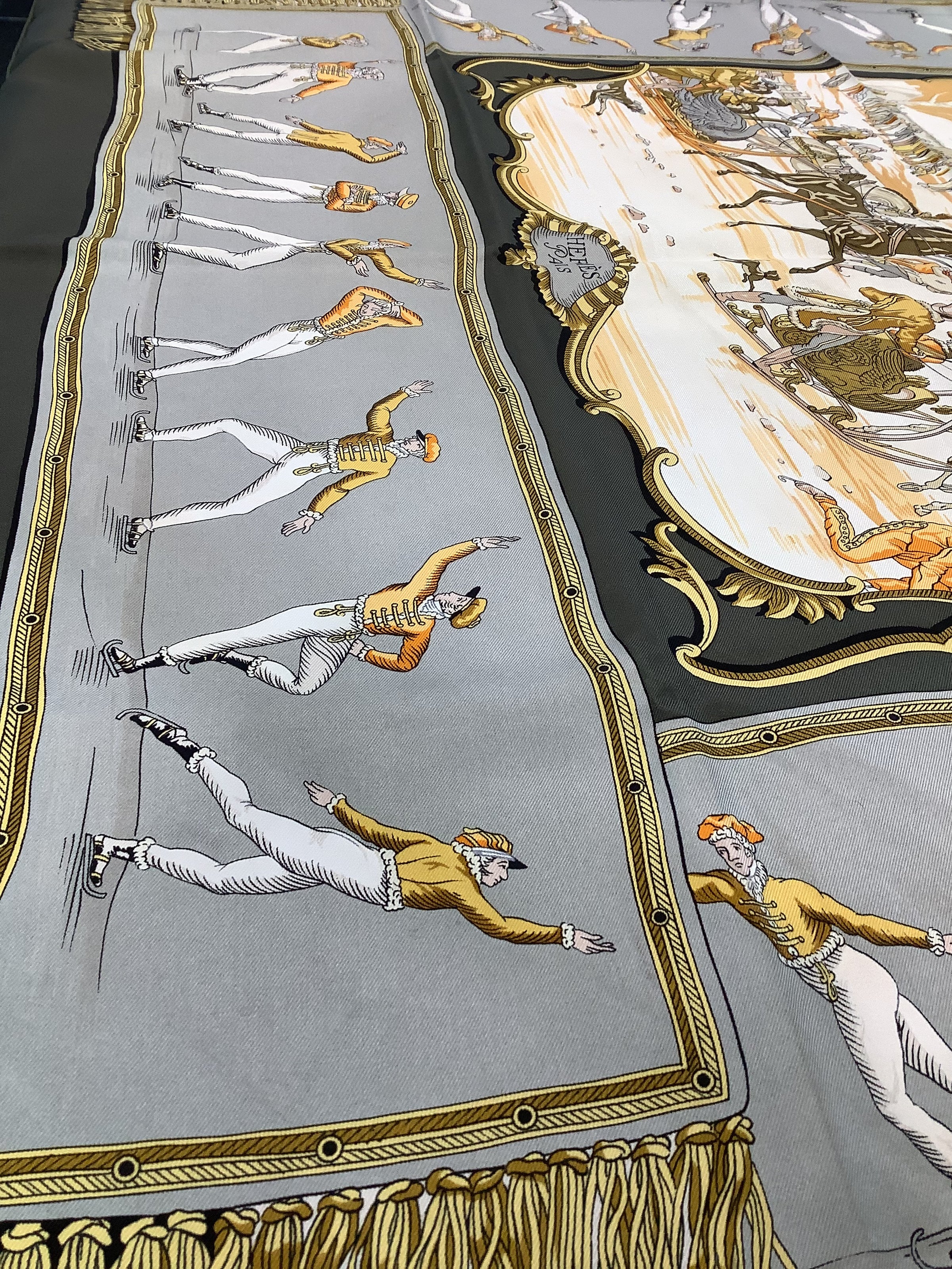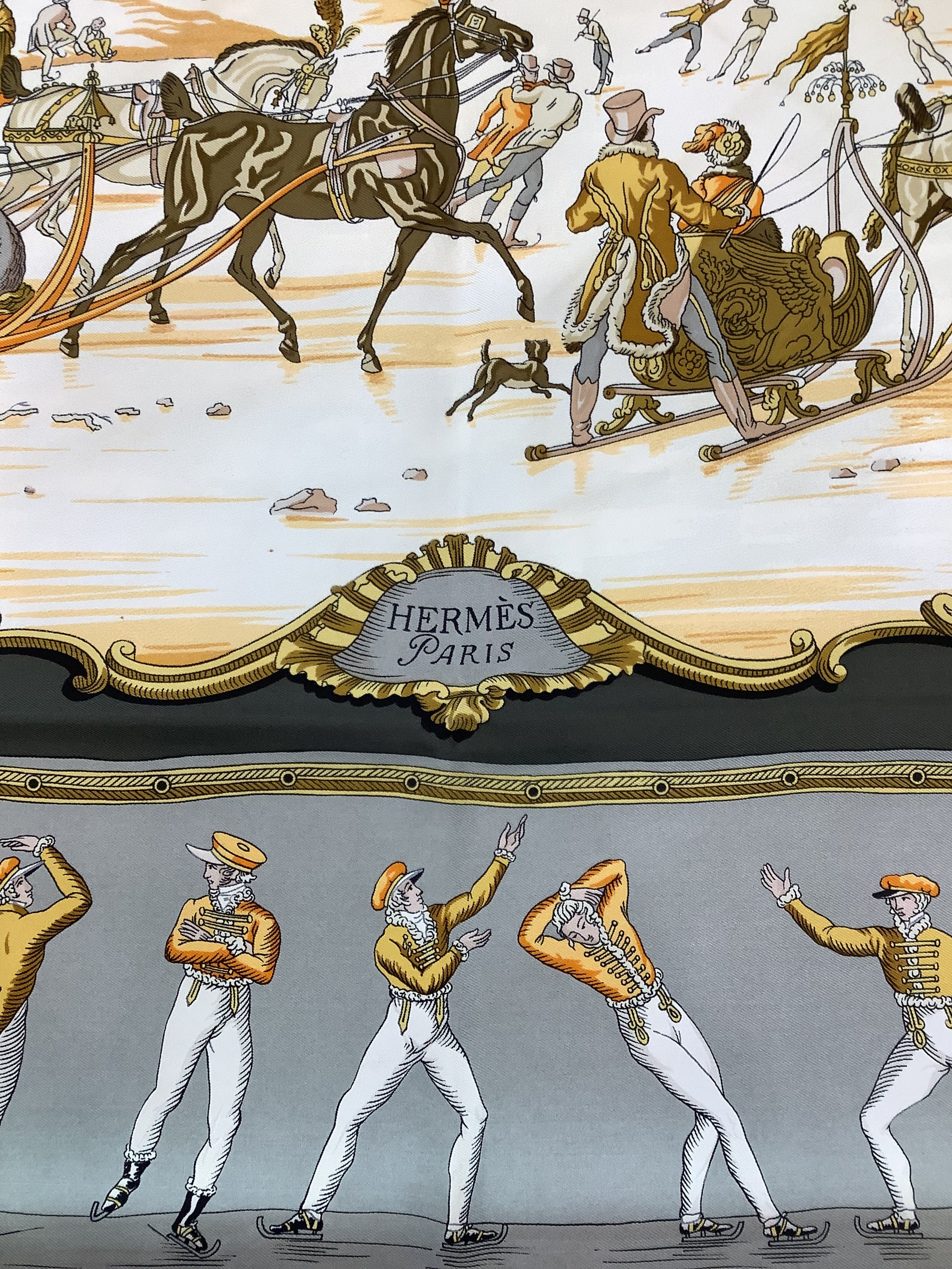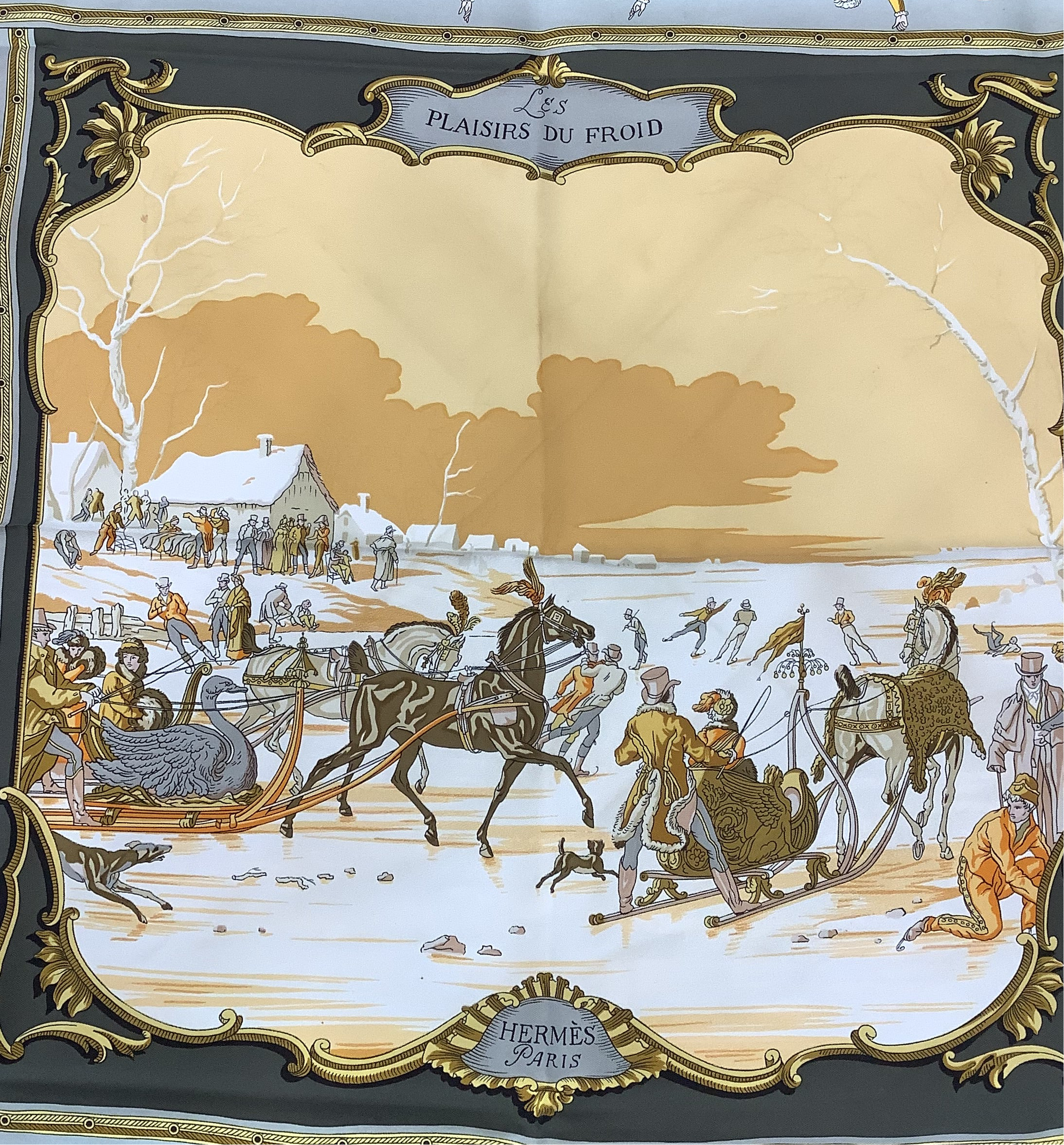 “Les Plaisirs du Froid” is a vintage Hermès scarf design, first published in 1955 under the direction of Hugo Grygkar. Over the years it has seen multiple reinterpretations and colour variants. Hermès carres (square scarves) are synonymous with luxury, craftsmanship, and artistic storytelling — each design becomes a wearable tableau. The hand-rolled hems and precise print registration reflect the maison’s commitment to artisan finishing and high standards.