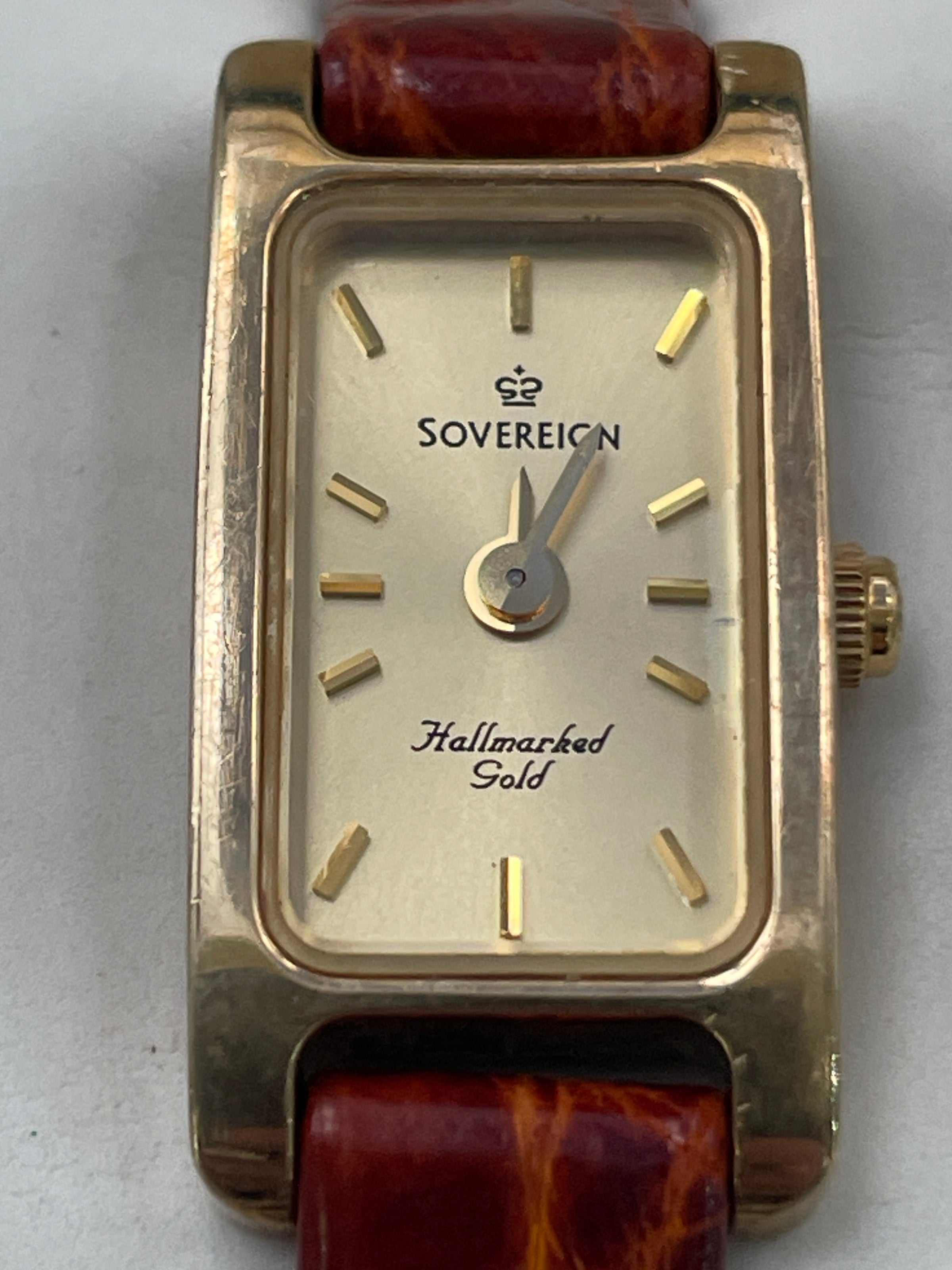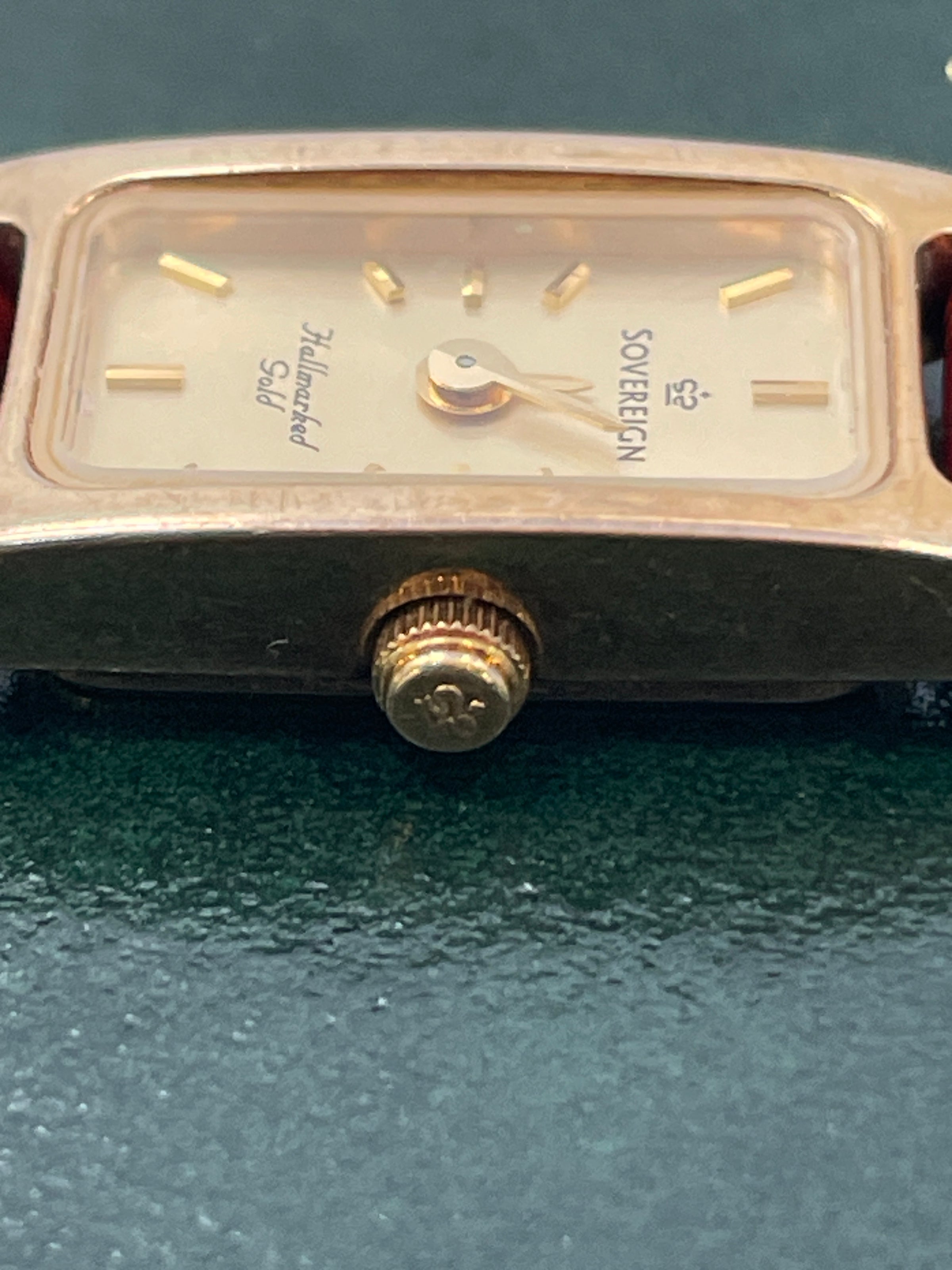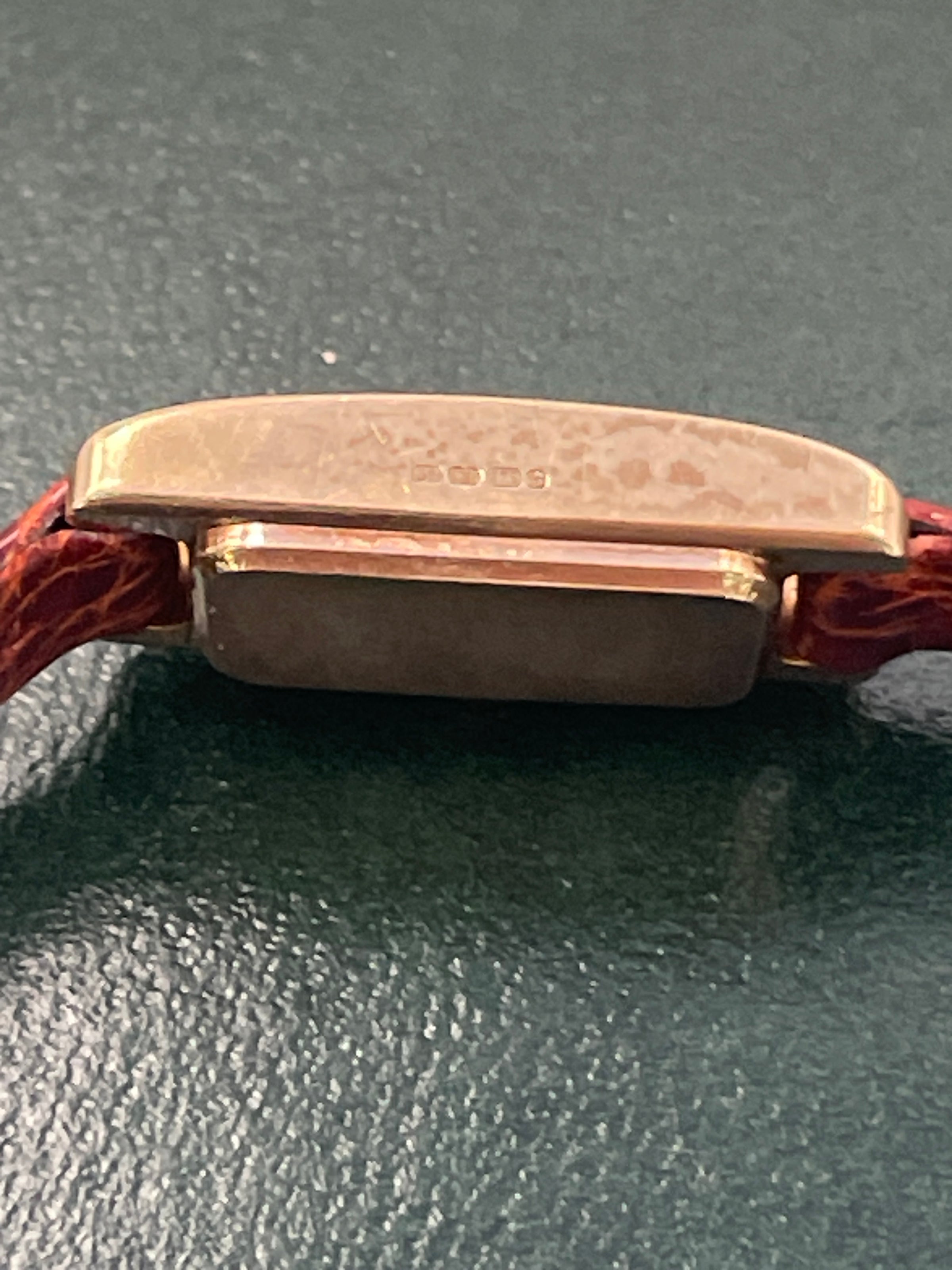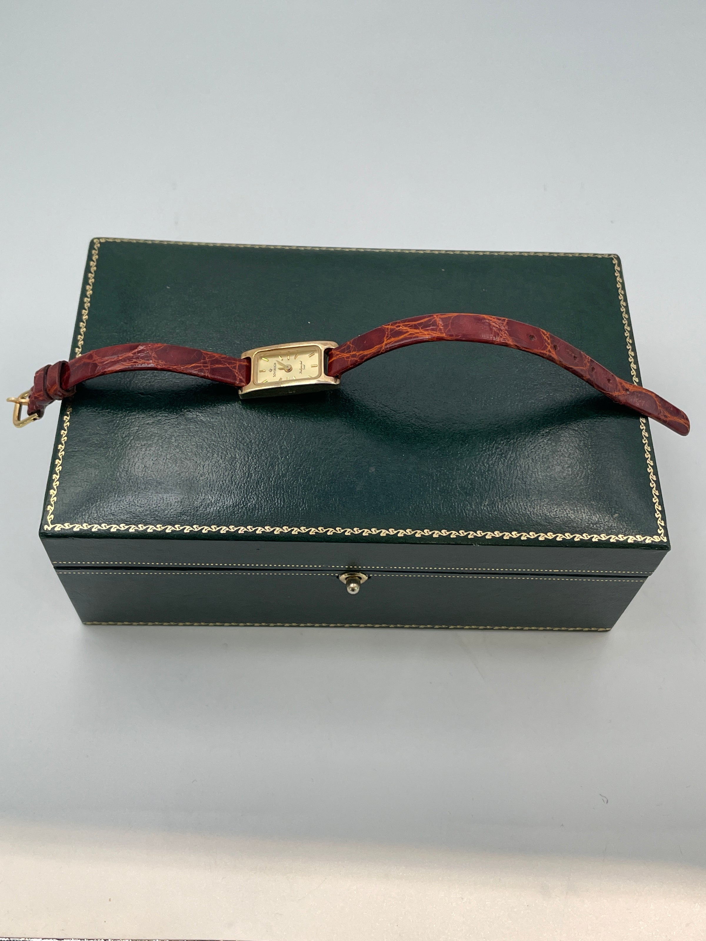 This is a delightful vintage ladies watch that can be worn as an everyday time piece or as a show piece due to it's 9ct yellow gold casing. Featuring a quartz movement, this watch is a reliable companion the wrist. The dial is a lighter shade of gold with simple but easy to read hour markers and there is only an hour and minute hand for timekeeping. Approximate dimensions: Case width: 12.2 mm, Case depth: 5.3 mm, Lug to lug: 24.6mm. This watch is hallmarked on the case and in addition the brown strap is marked REAL CROCODILE.