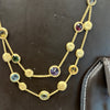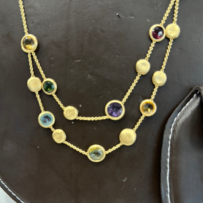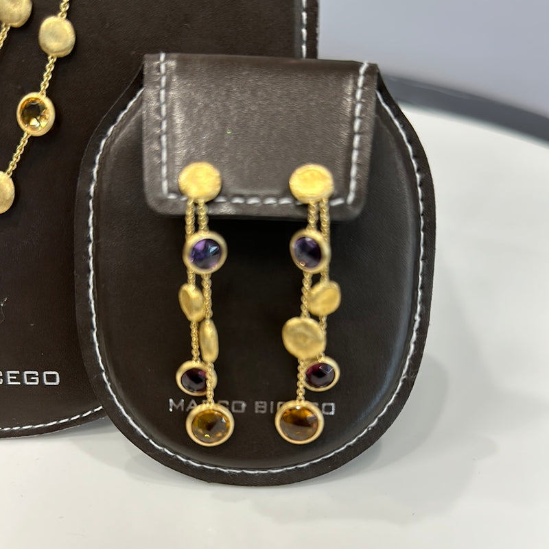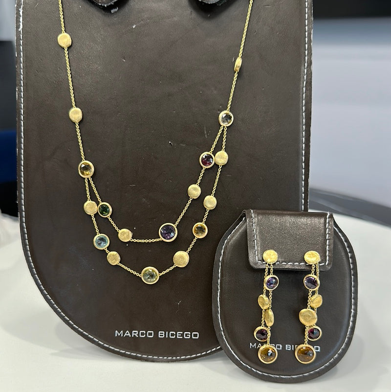 Marco Bicego 18ct yellow gold necklace and earrings, this stunning set is brushed gold with multi coloured semi precious stones in a rubover setting. Amethyst, Tourmaline, Citrine And Topaz