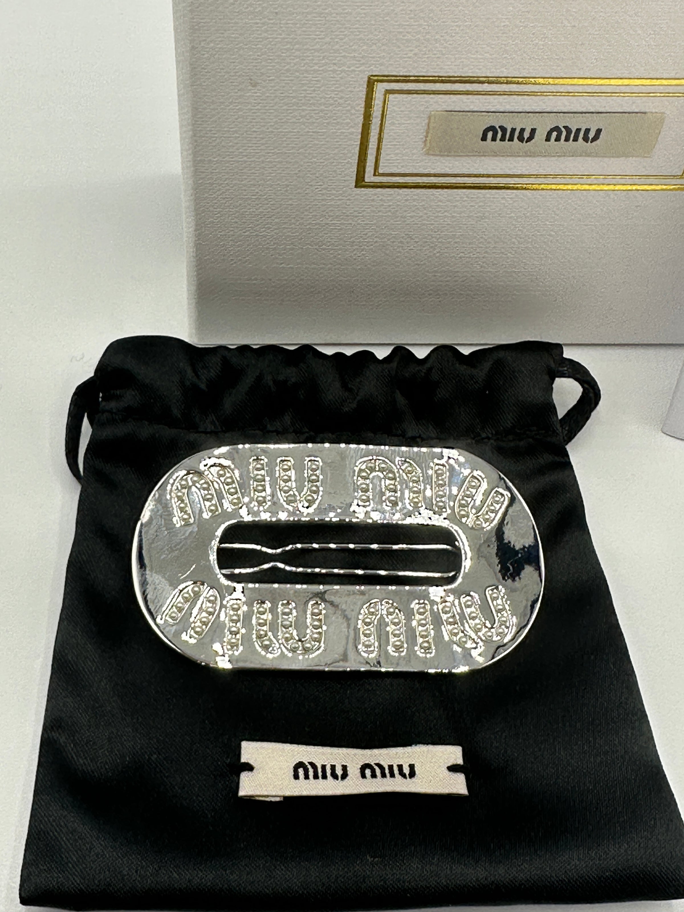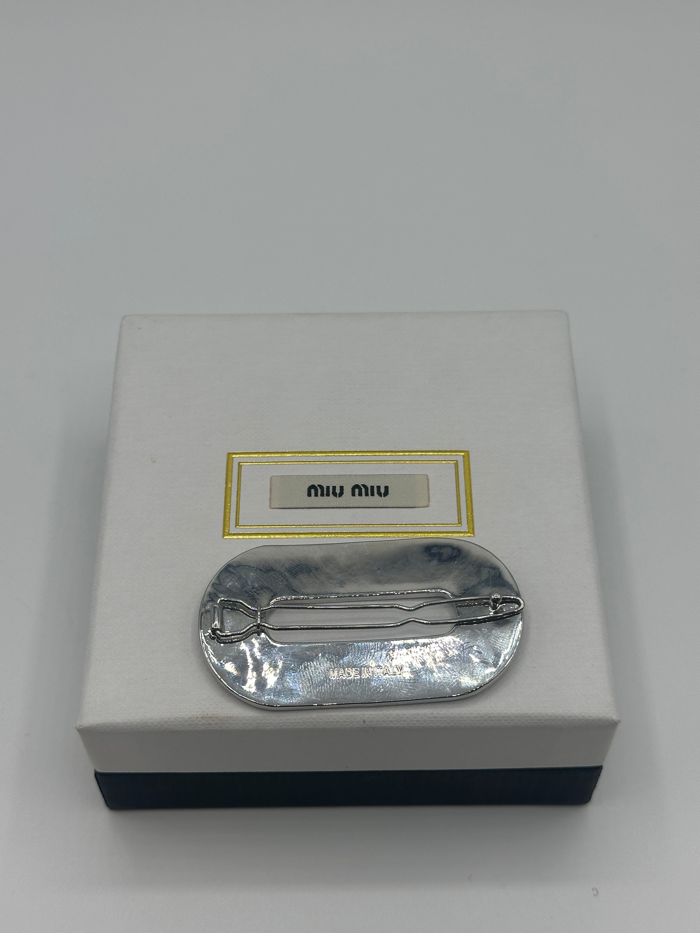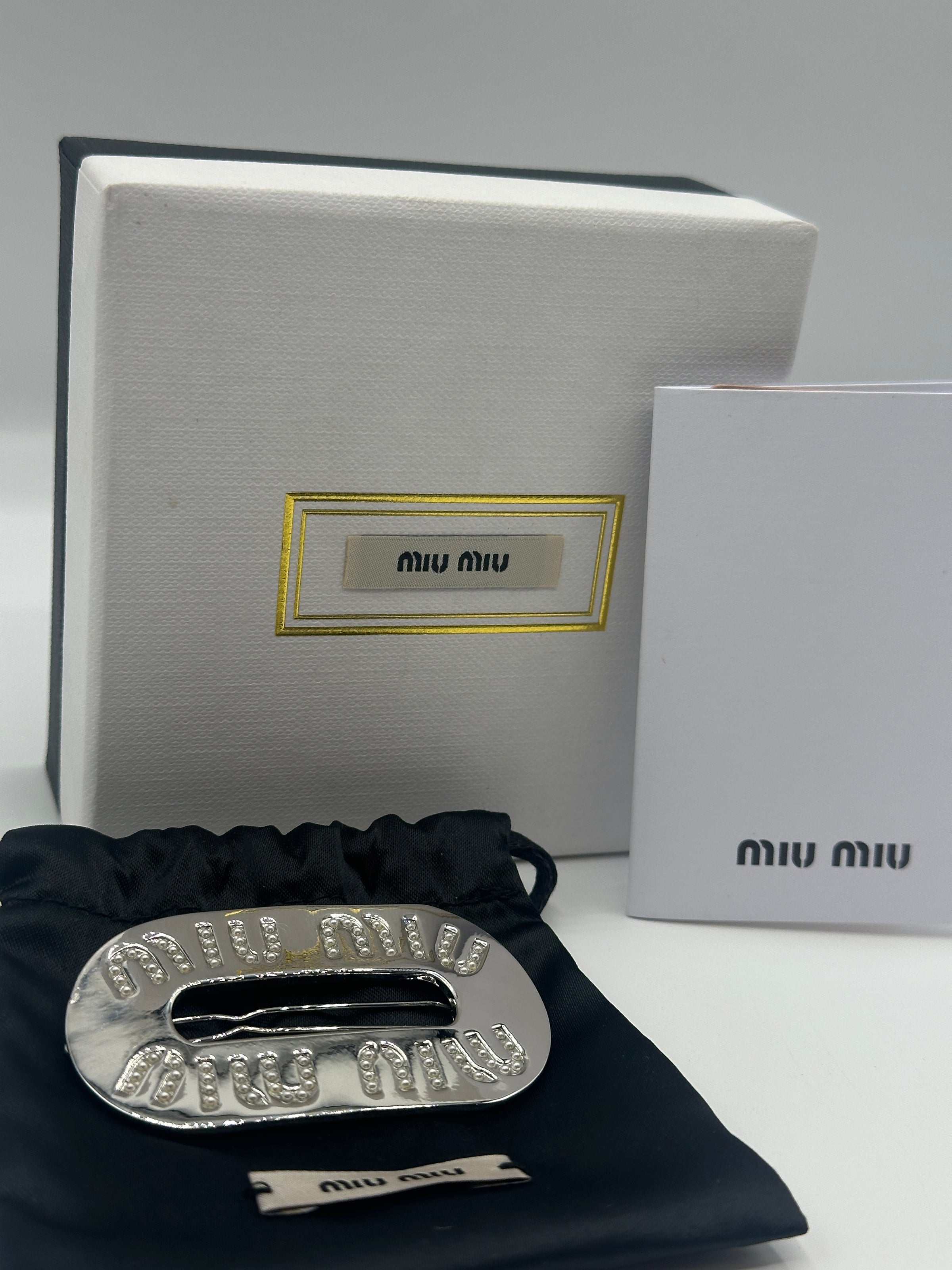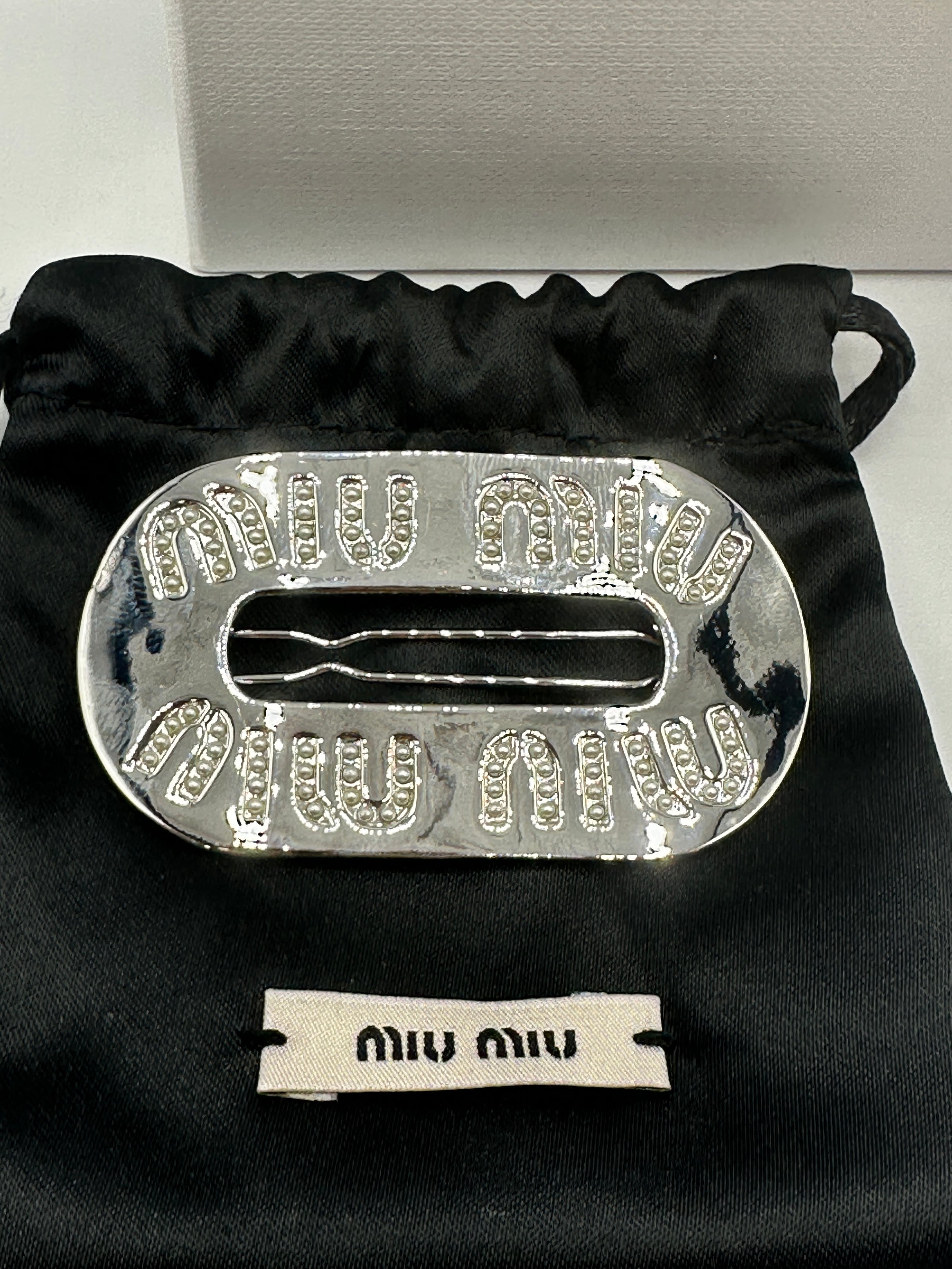 This Miu Miu hair clip is a refined accessory that combines polished metal with delicate faux pearls, offering a sophisticated touch to any hairstyle. The clip features a sleek, curved design adorned with a row of lustrous pearls, exuding timeless elegance. The secure clasp ensures a firm hold, making it both functional and stylish.