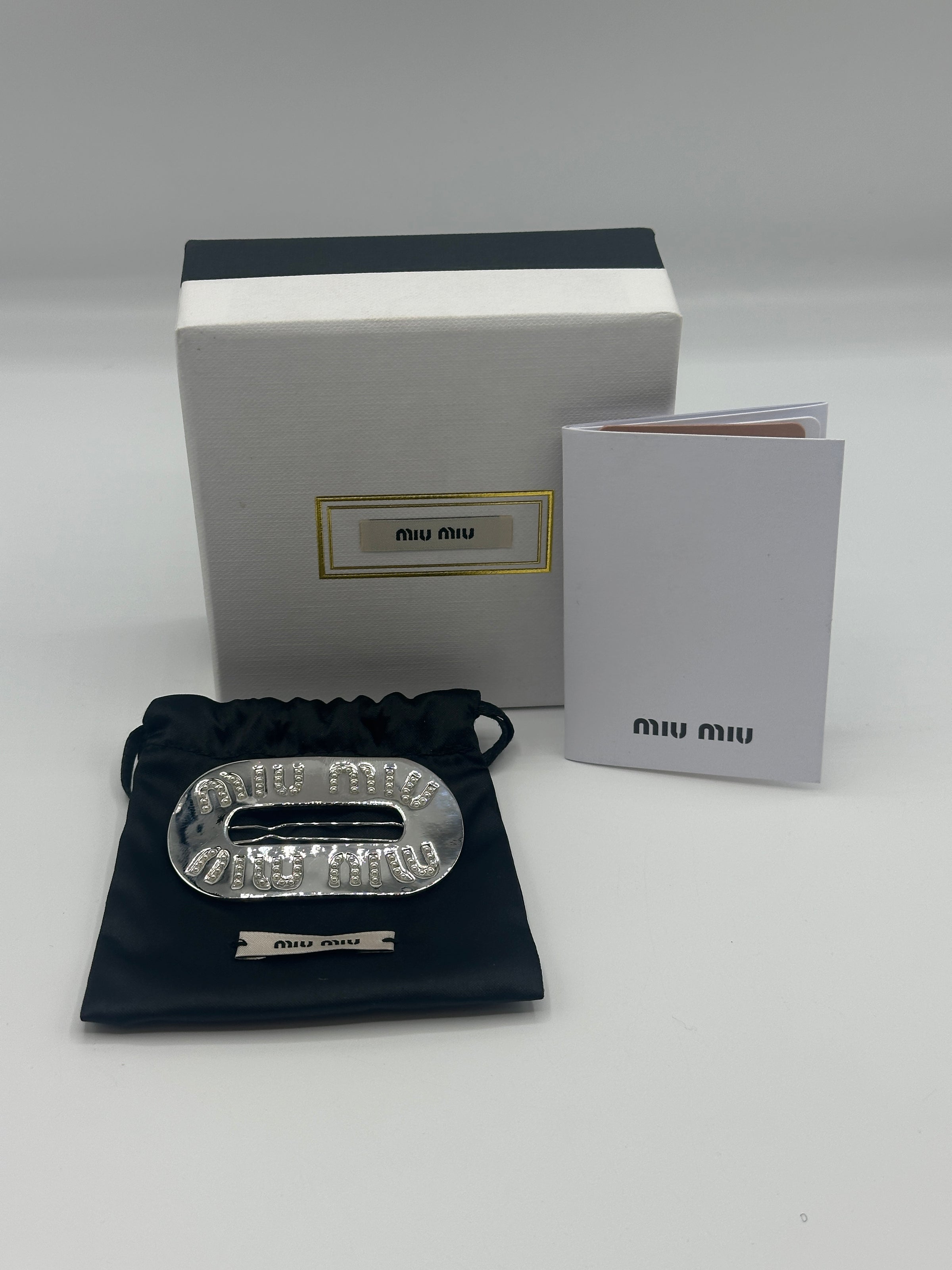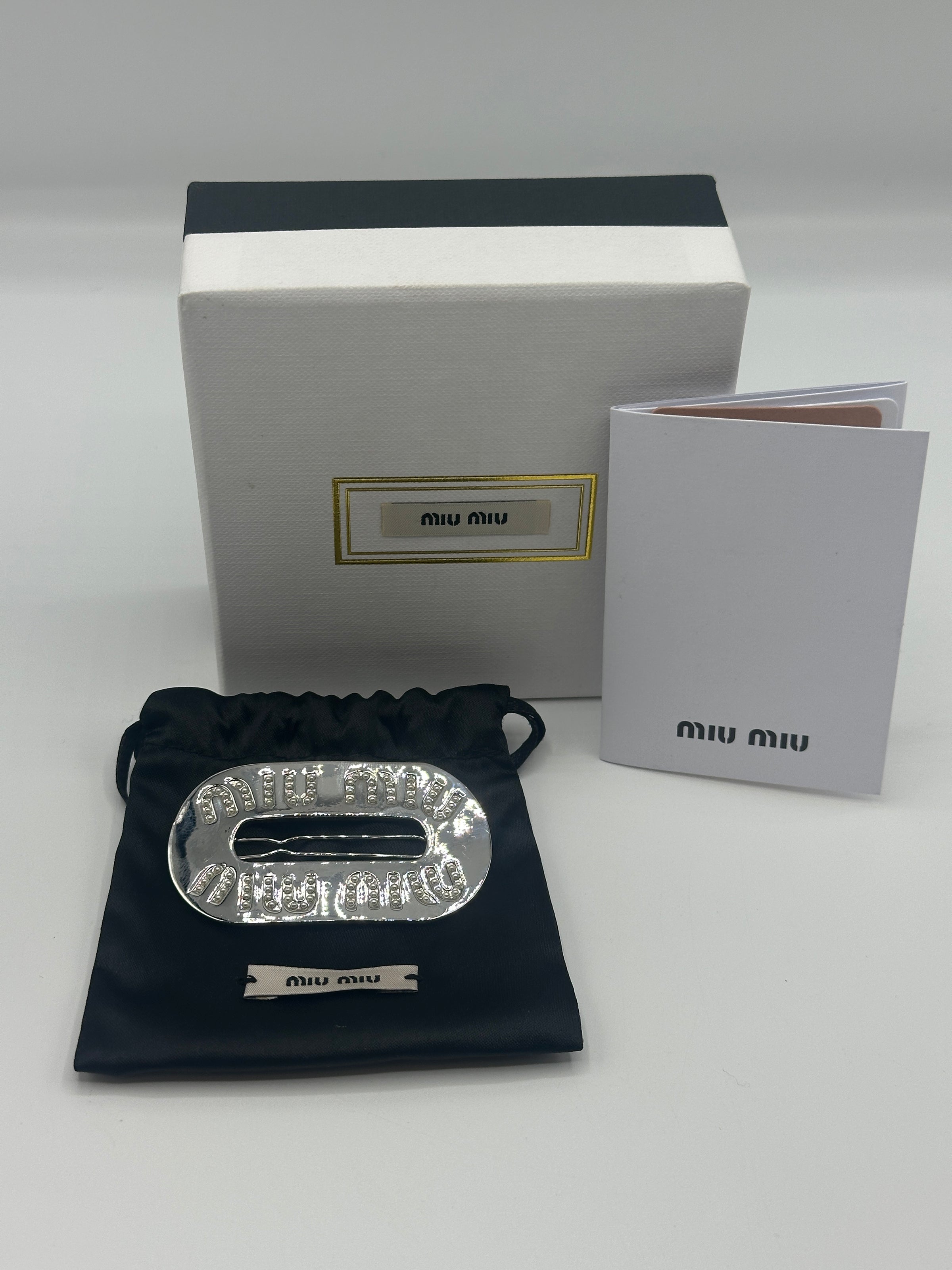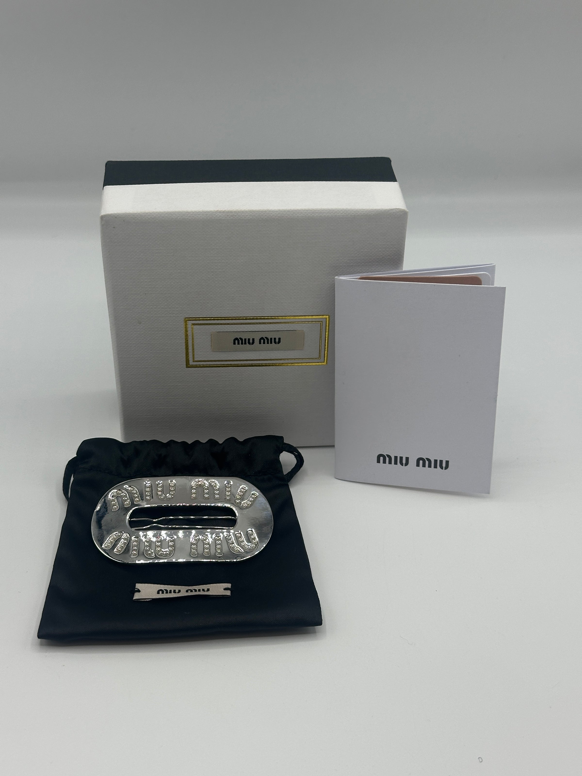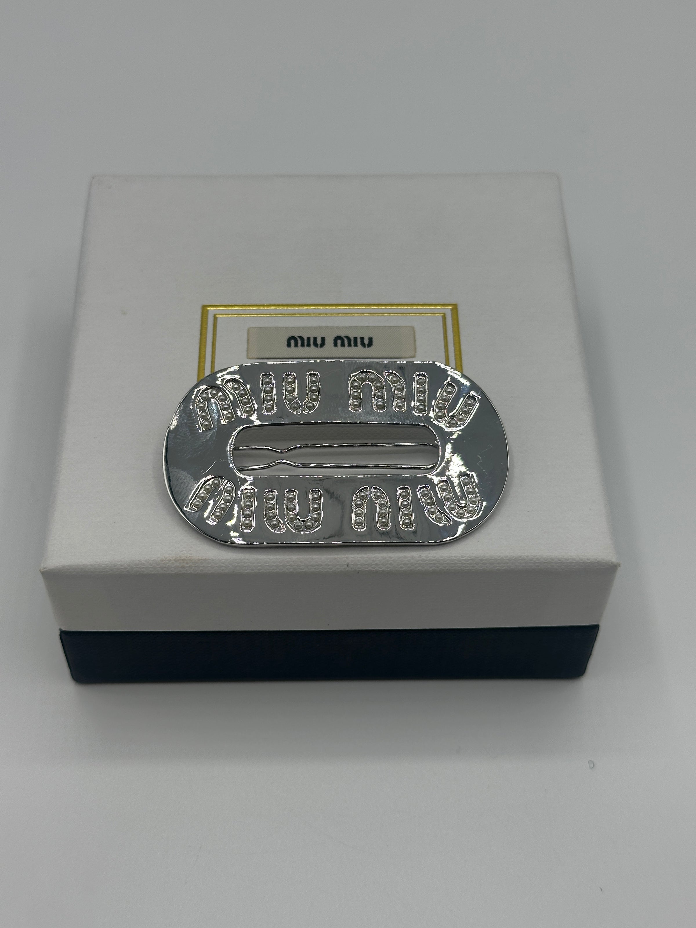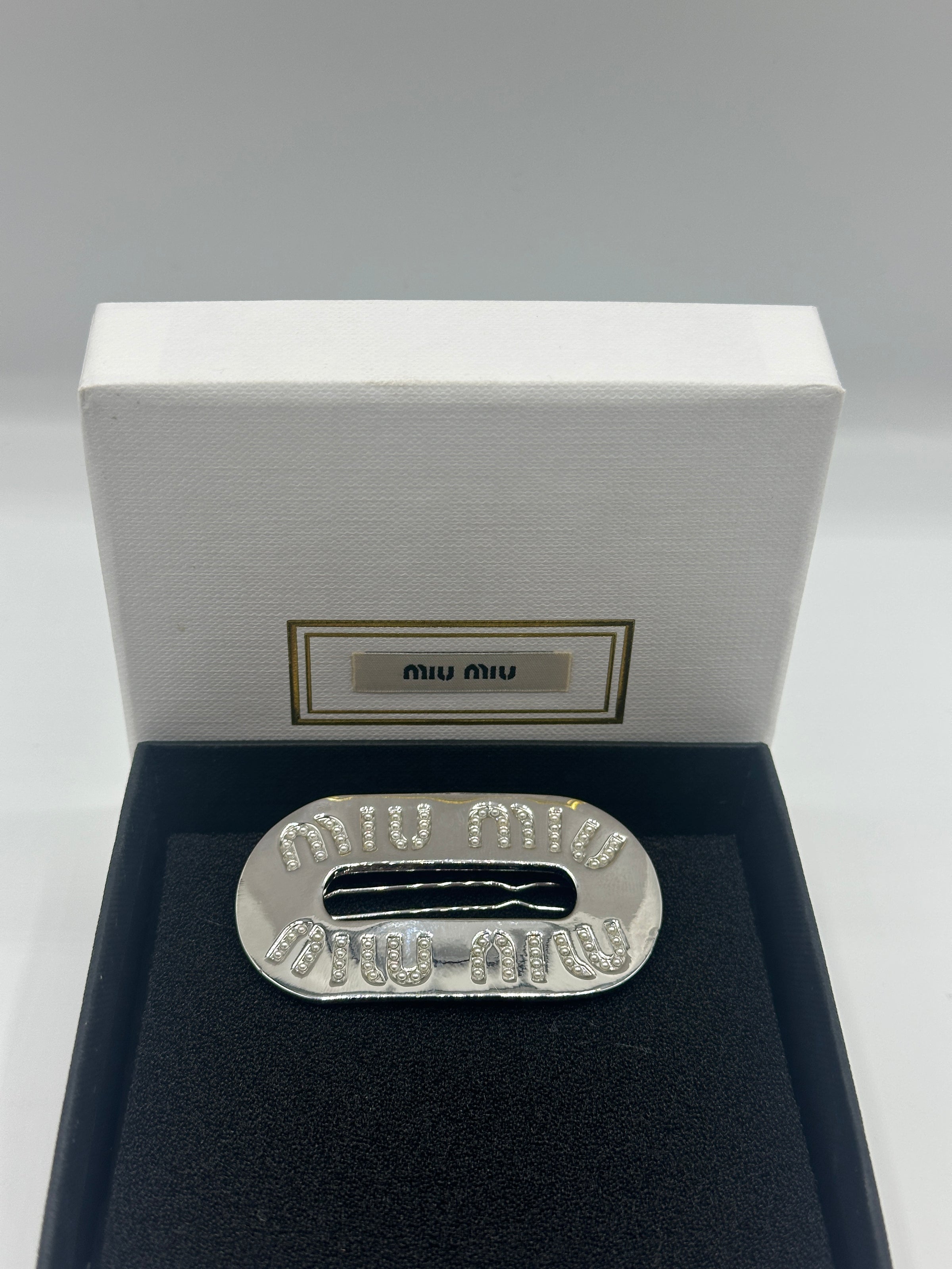 This Miu Miu hair clip is a refined accessory that combines polished metal with delicate faux pearls, offering a sophisticated touch to any hairstyle. The clip features a sleek, curved design adorned with a row of lustrous pearls, exuding timeless elegance. The secure clasp ensures a firm hold, making it both functional and stylish.