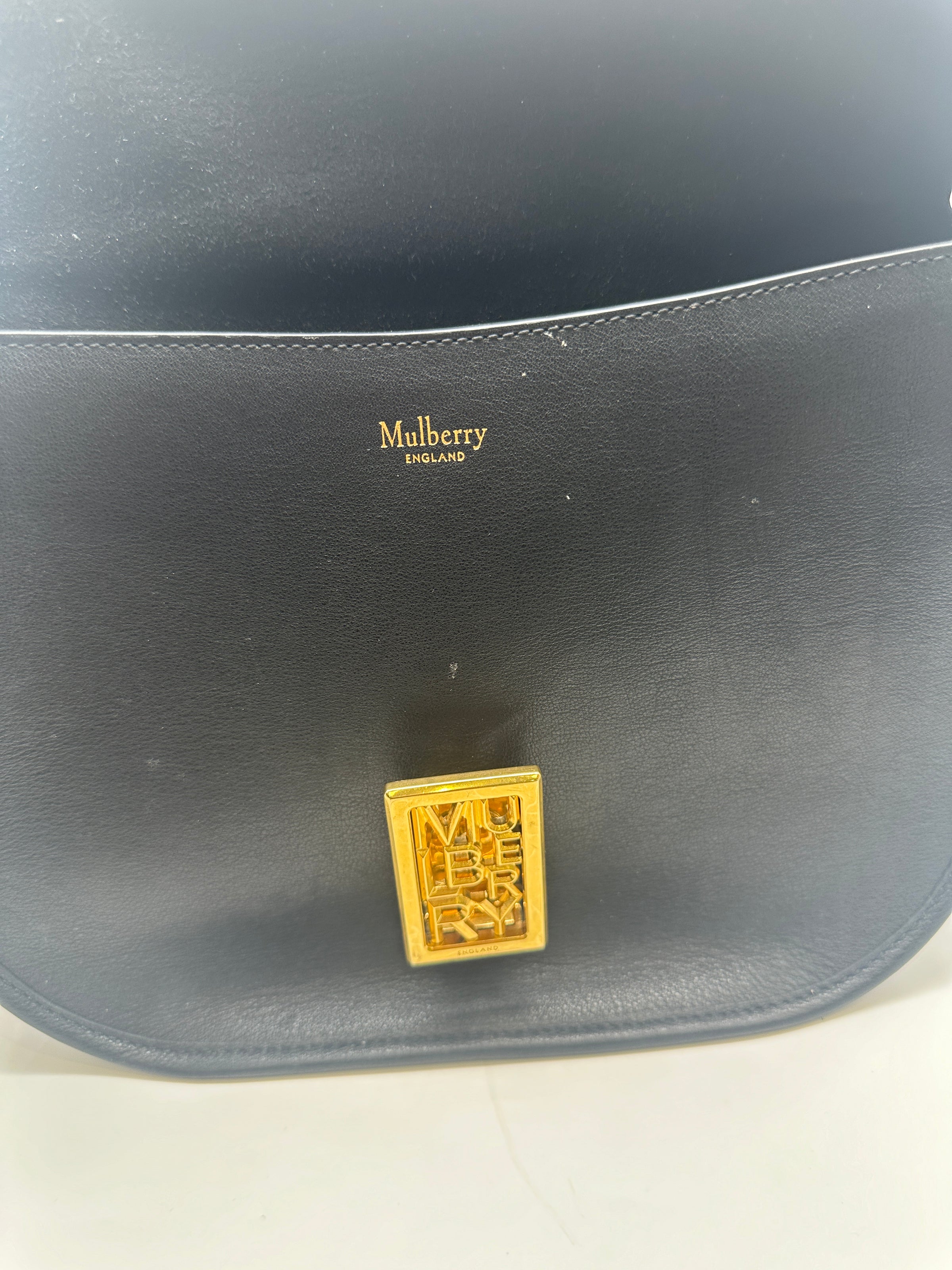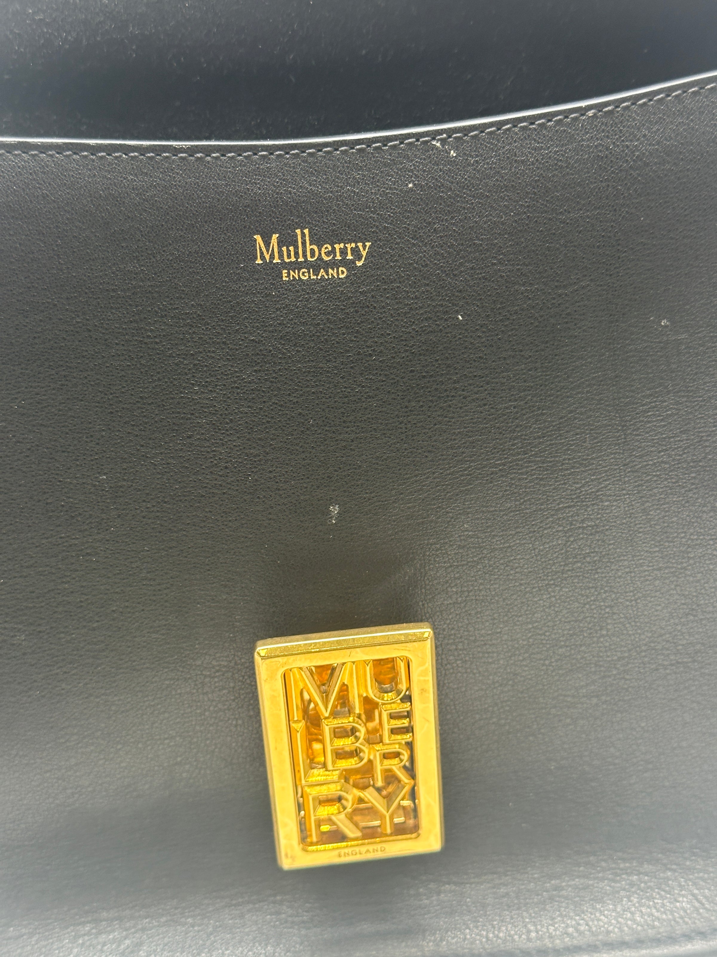 This is a stunning timeless satchel by Mulberry. The large Sadie satchel combines a relaxed, simple design with elegant detailing and the sleek black leather, combined with the gold tone hardware creates an eye catching handbag. The new Typography lock celebrates Mulberry's typographic identity on the brand's 50th anniversary. The long strap is adjustable which means you can wear it crossbody or on the shoulder. Inside is a back slip pocket. Burgundy suede feel interior.
