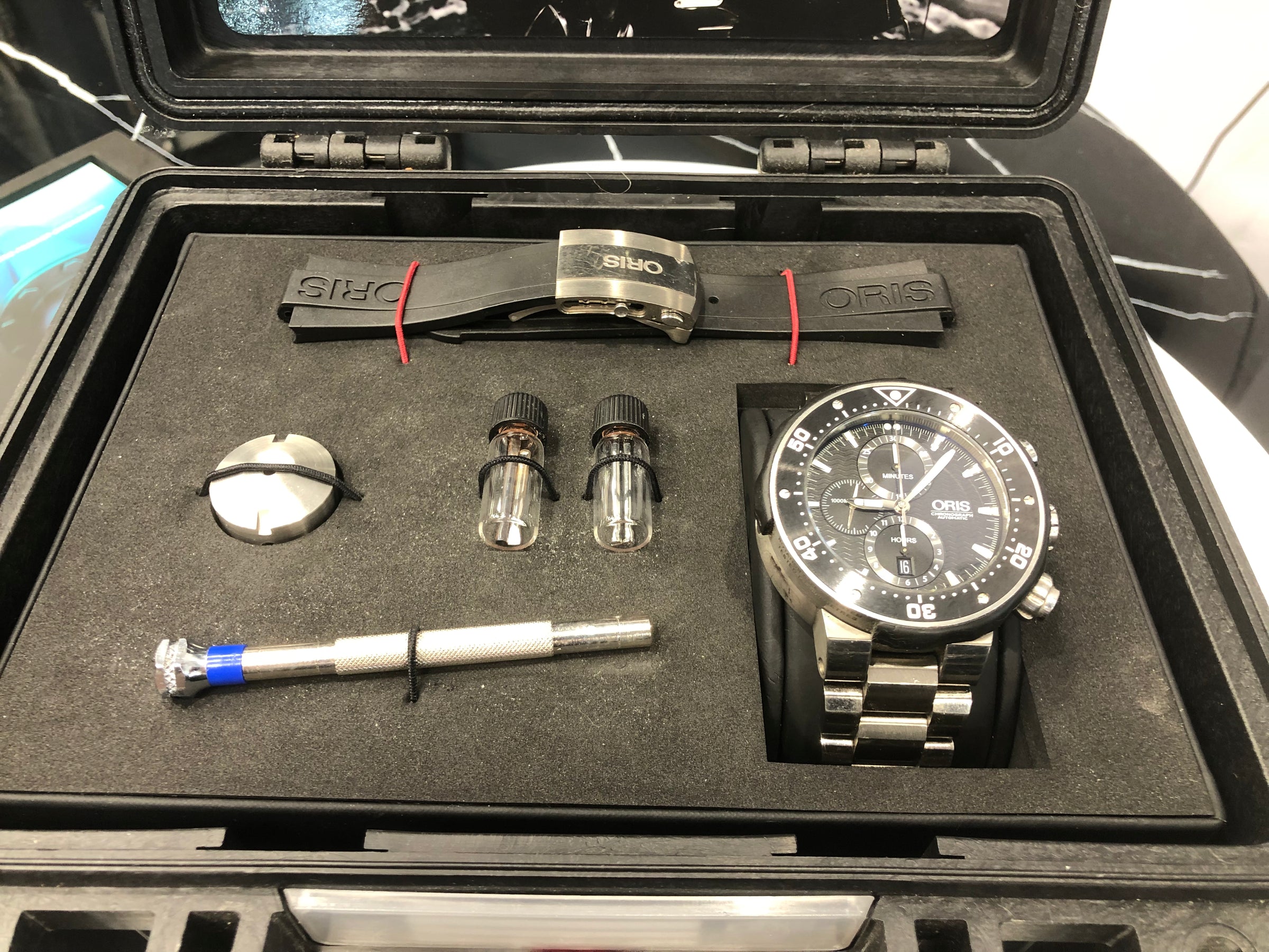 Oris Pro Diver Chronograph. This watch is part titanium and features a black bezel.