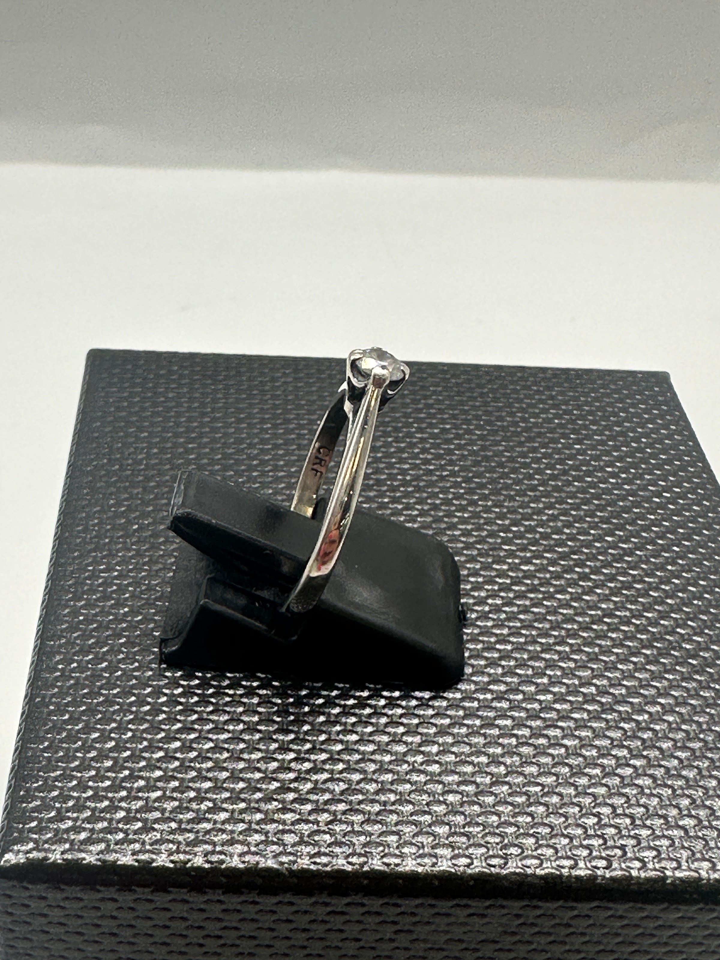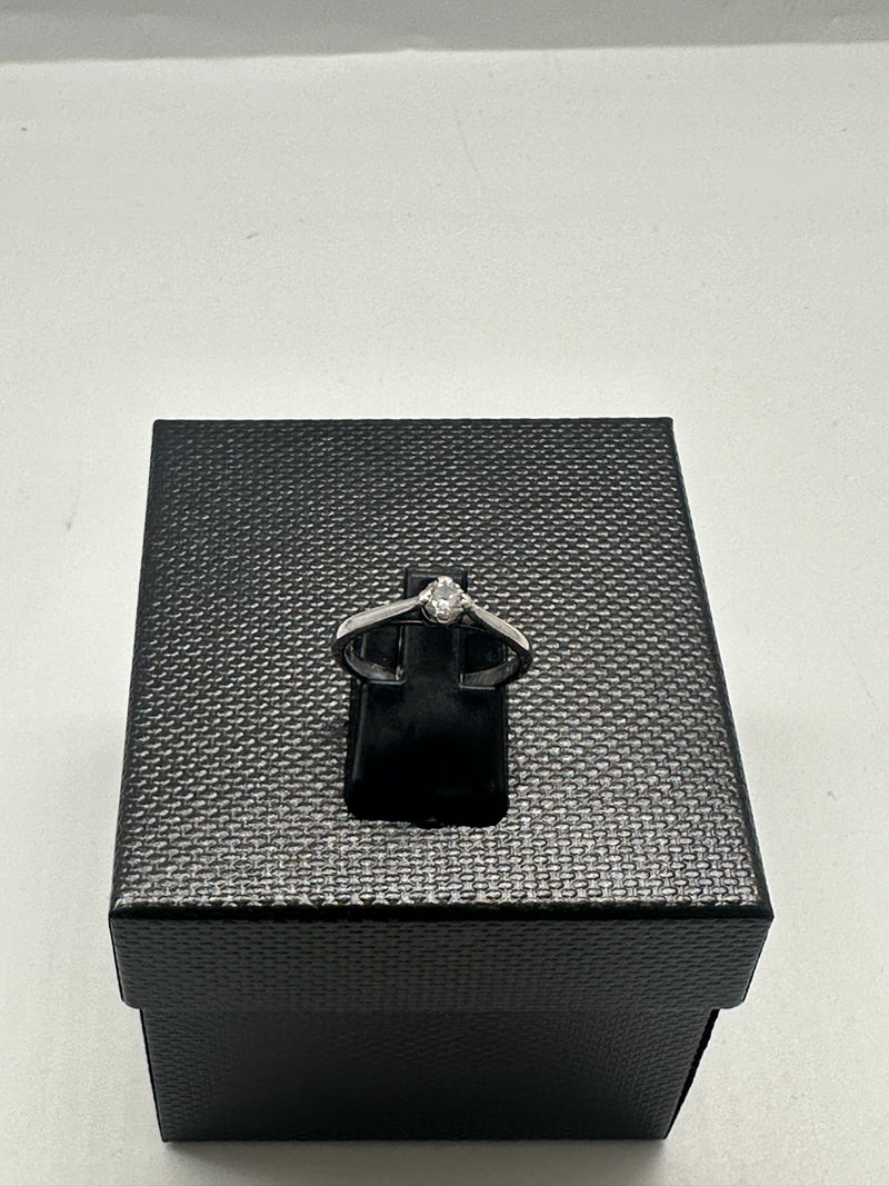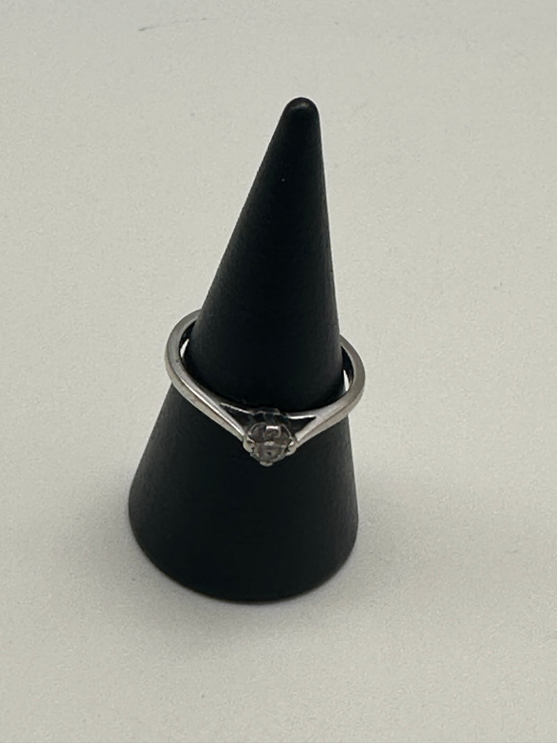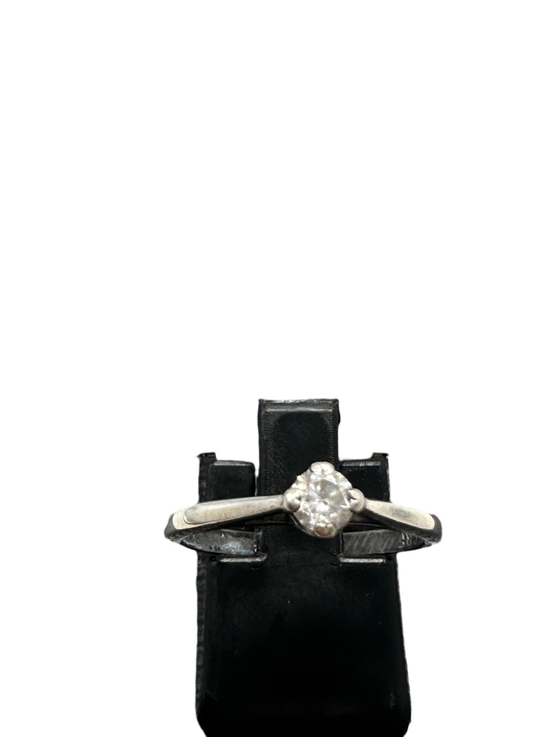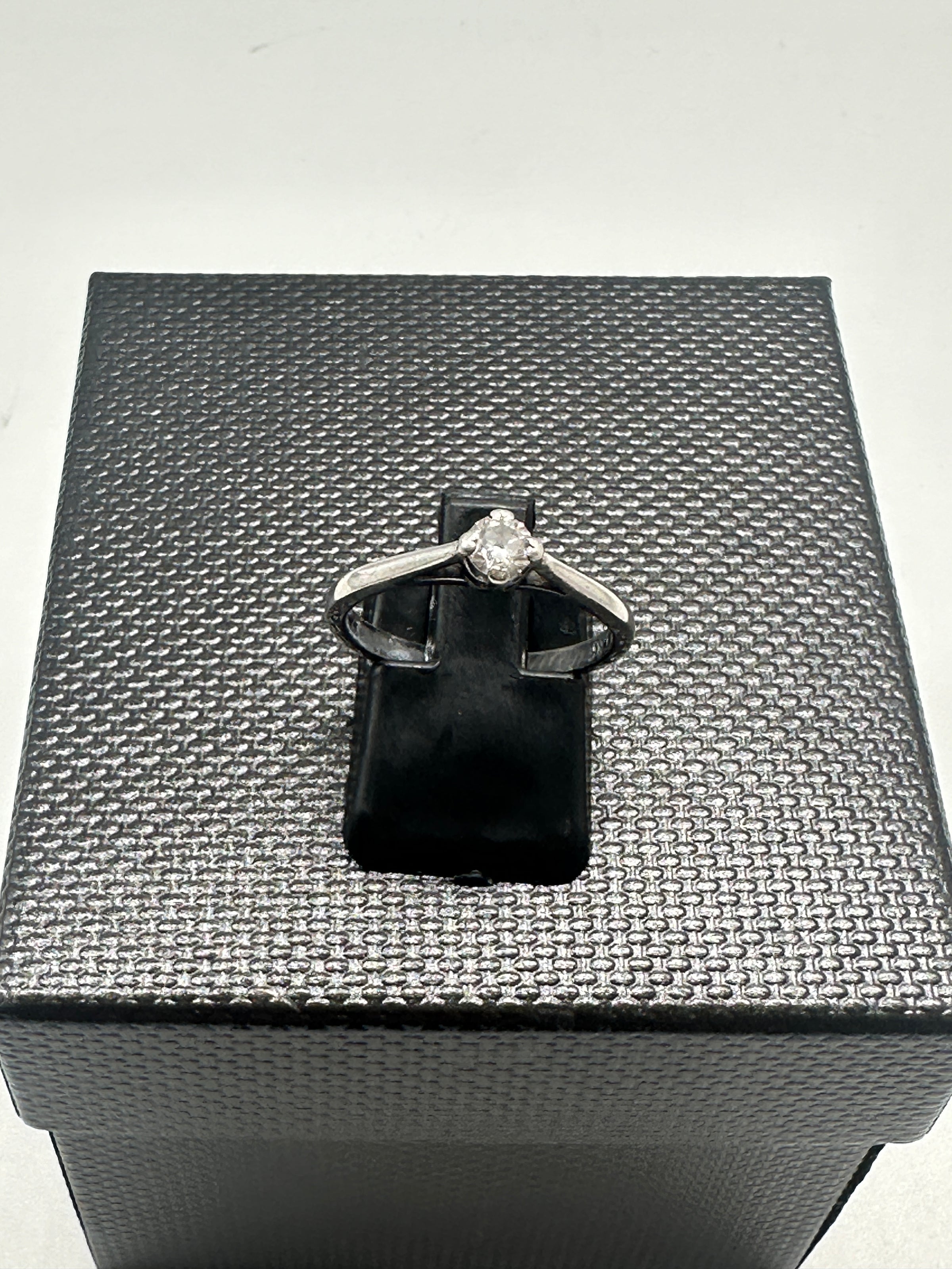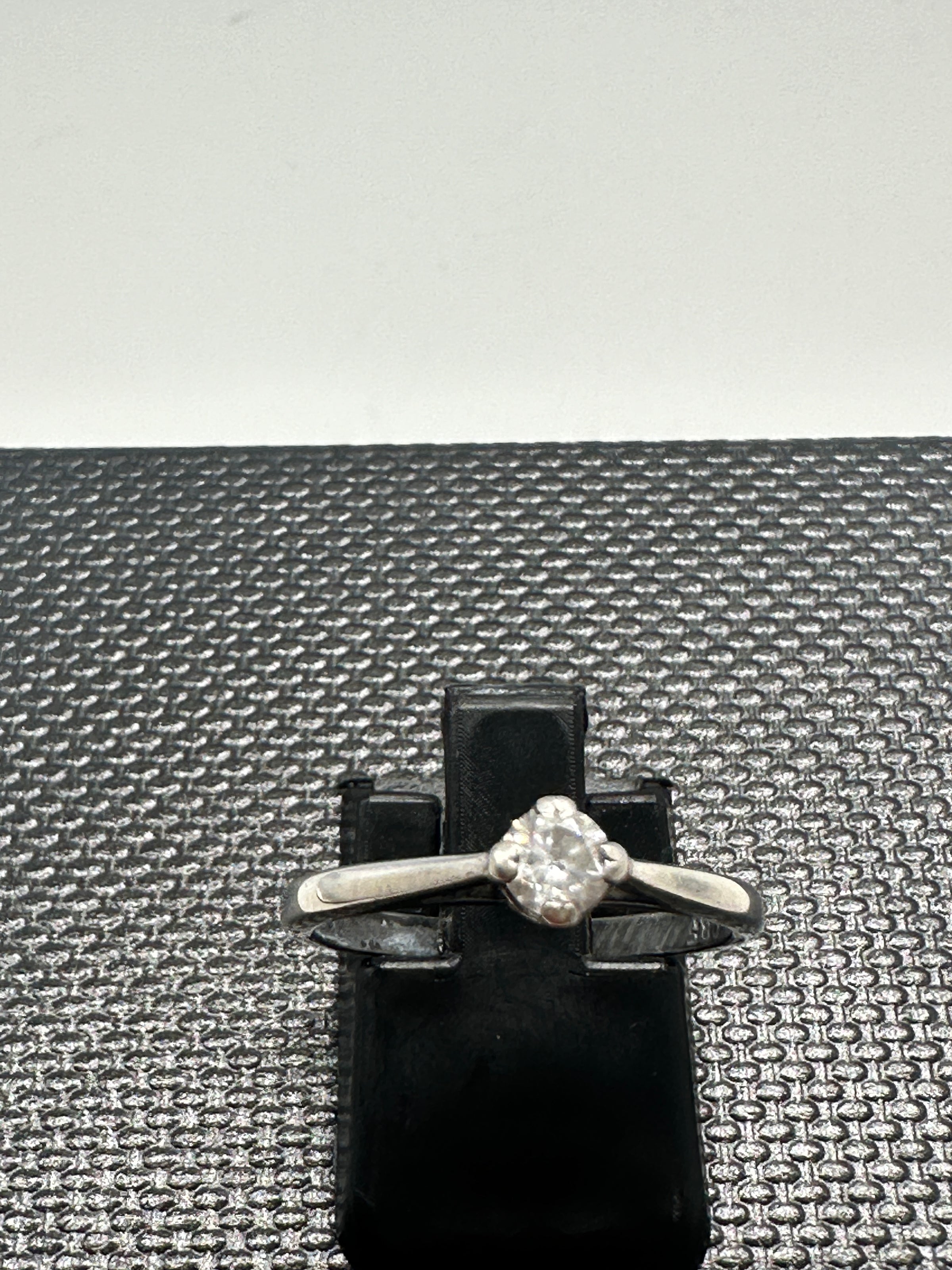This elegant platinum solitaire ring features a brilliant-cut diamond, weighing approximately 0.15 carats, securely held in a classic four-claw setting. The sleek platinum band complements the diamond's sparkle, creating a timeless piece suitable for any occasion. Comes in finger size L.