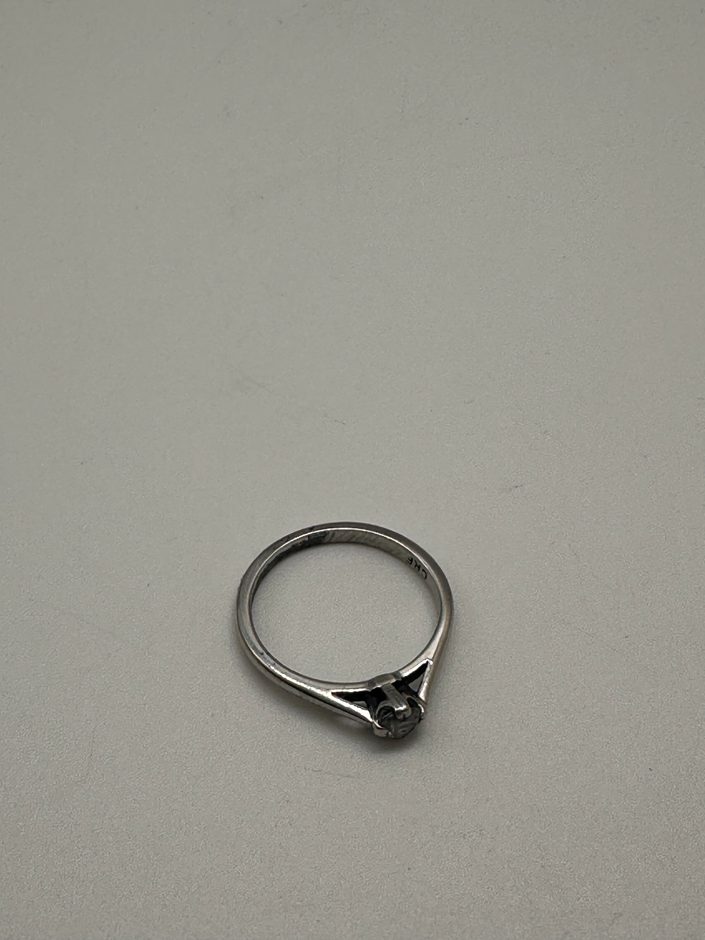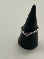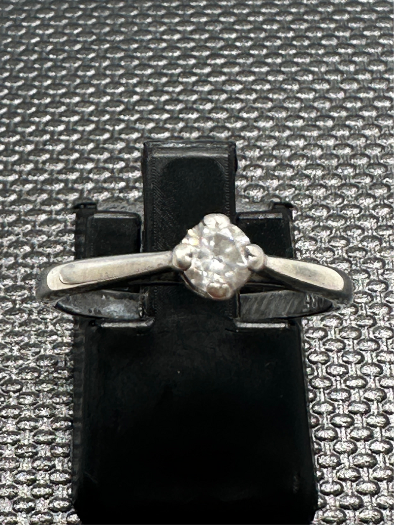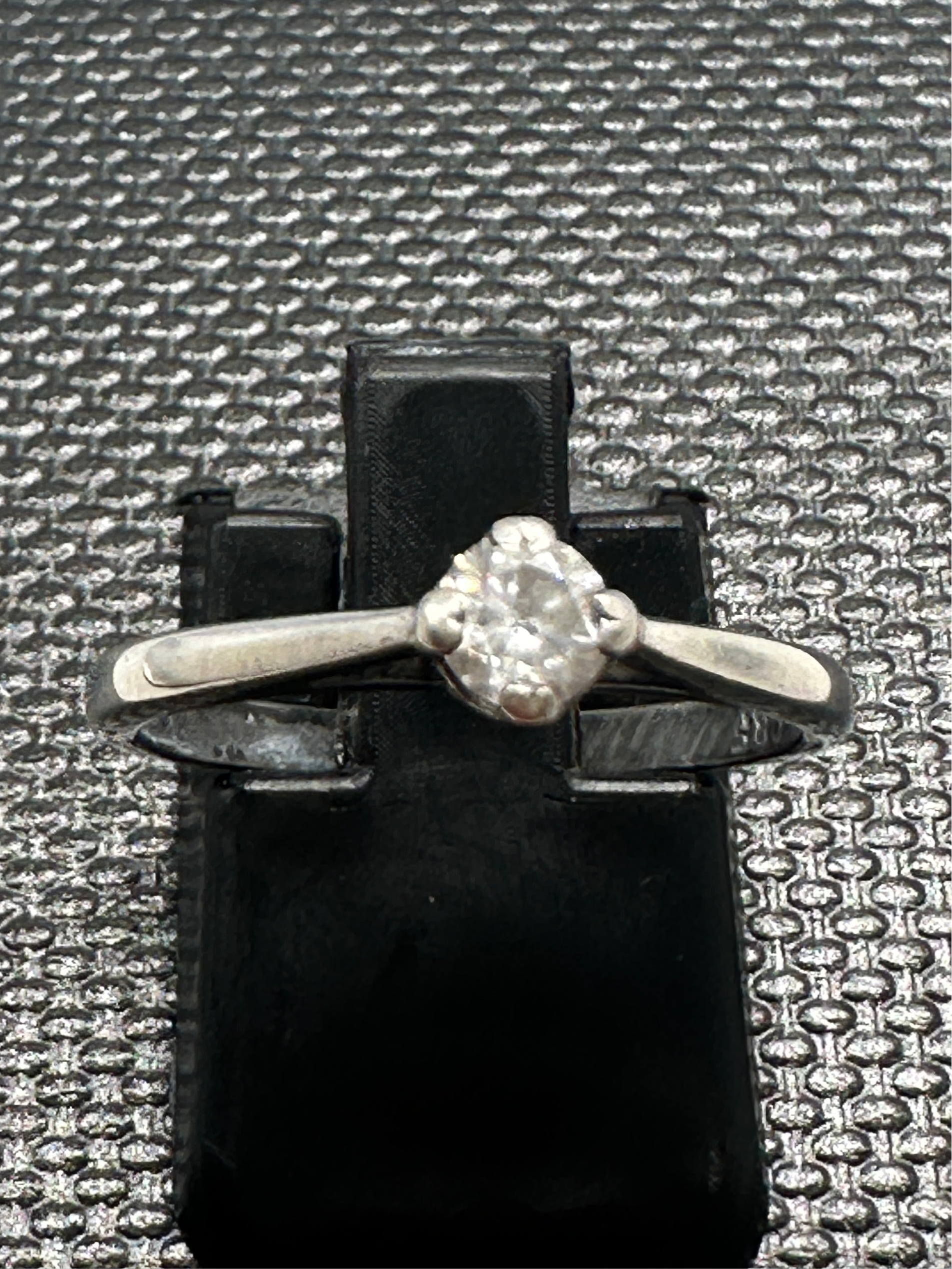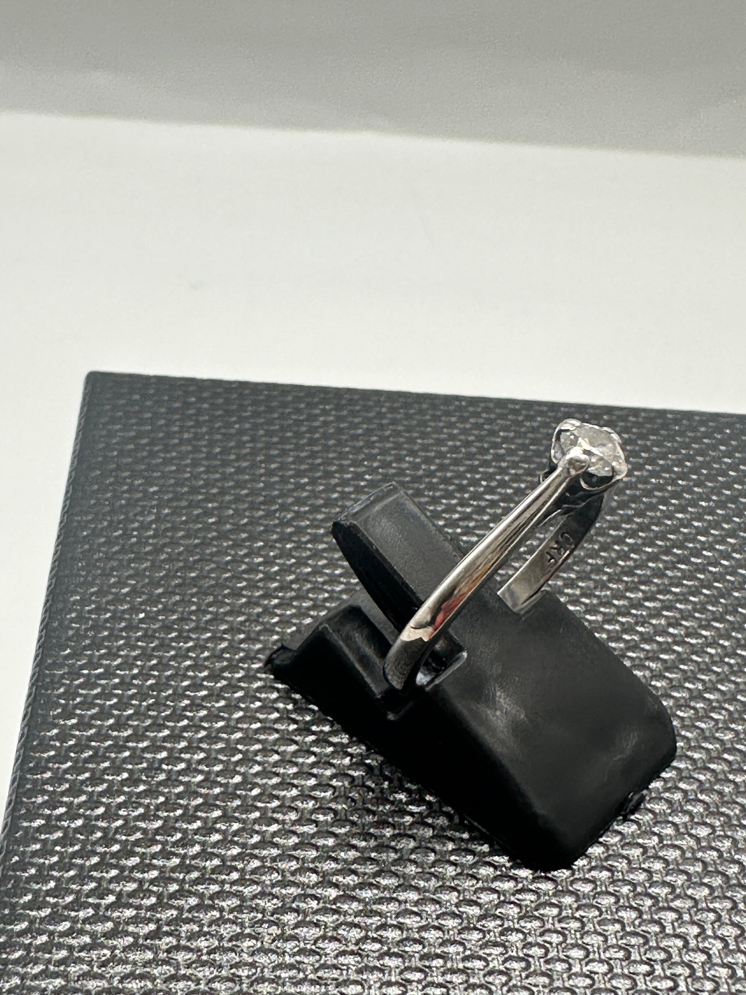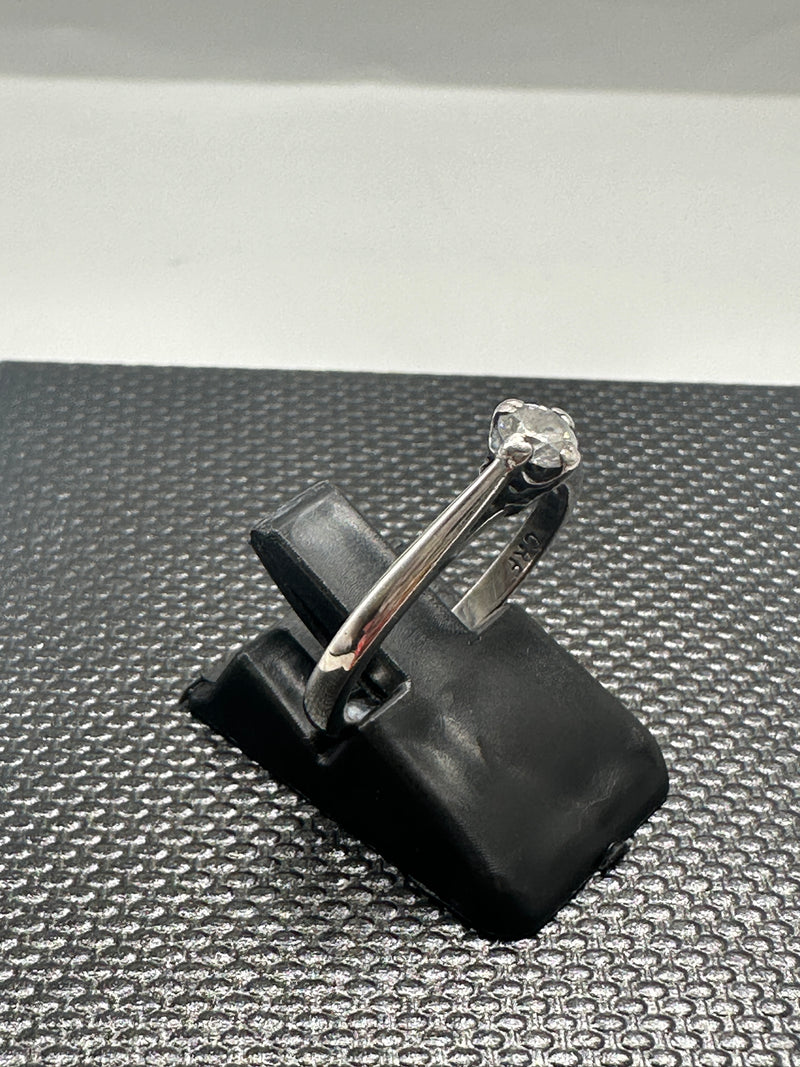 This elegant platinum solitaire ring features a brilliant-cut diamond, weighing approximately 0.15 carats, securely held in a classic four-claw setting. The sleek platinum band complements the diamond's sparkle, creating a timeless piece suitable for any occasion. Comes in finger size L.