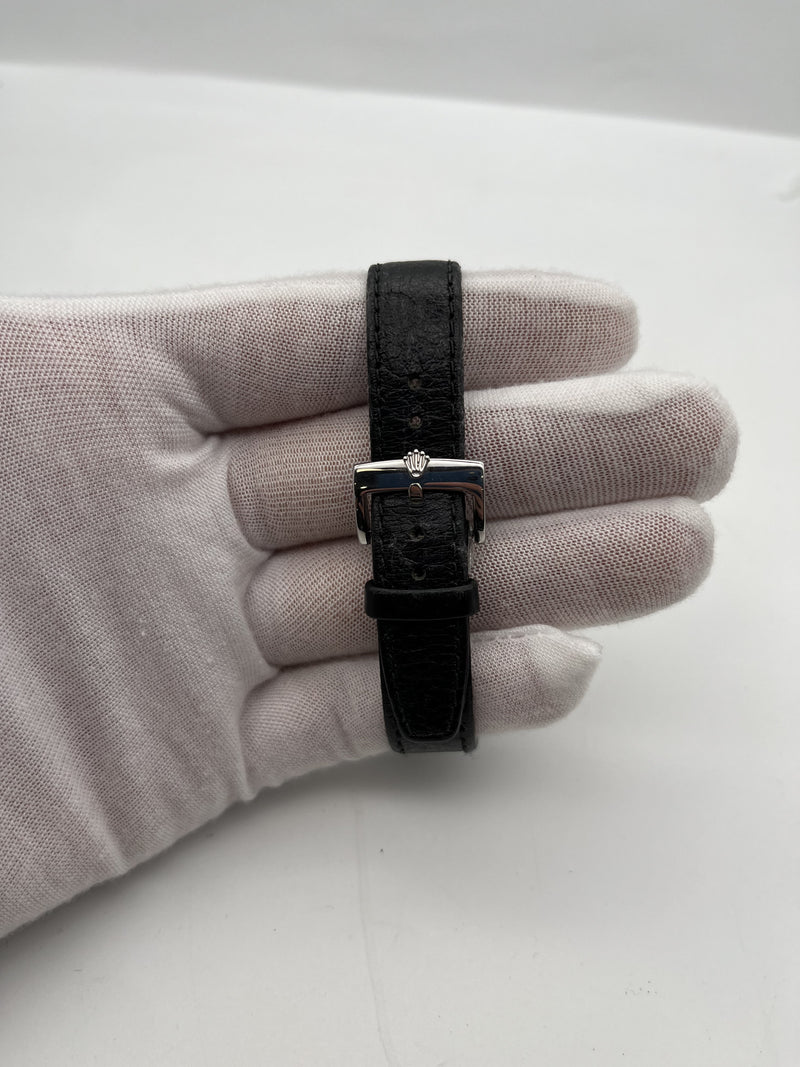 This stunning vintage Rolex oyster features a white gold 32mm octagonal case, antique ivory dial, black numeral hour markers, 60 second sub dial, white gold fluted bezel, large white gold screw down crown, black leather bracelet and its original Rolex buckle. This watch dates back to the 1940s and is in outstanding condition, both mechanically and aesthetically. This watch does not come with its original box and papers but has been certified as completely authentic.