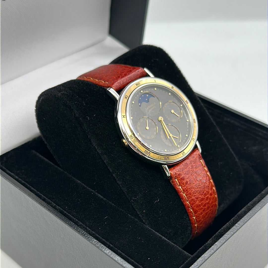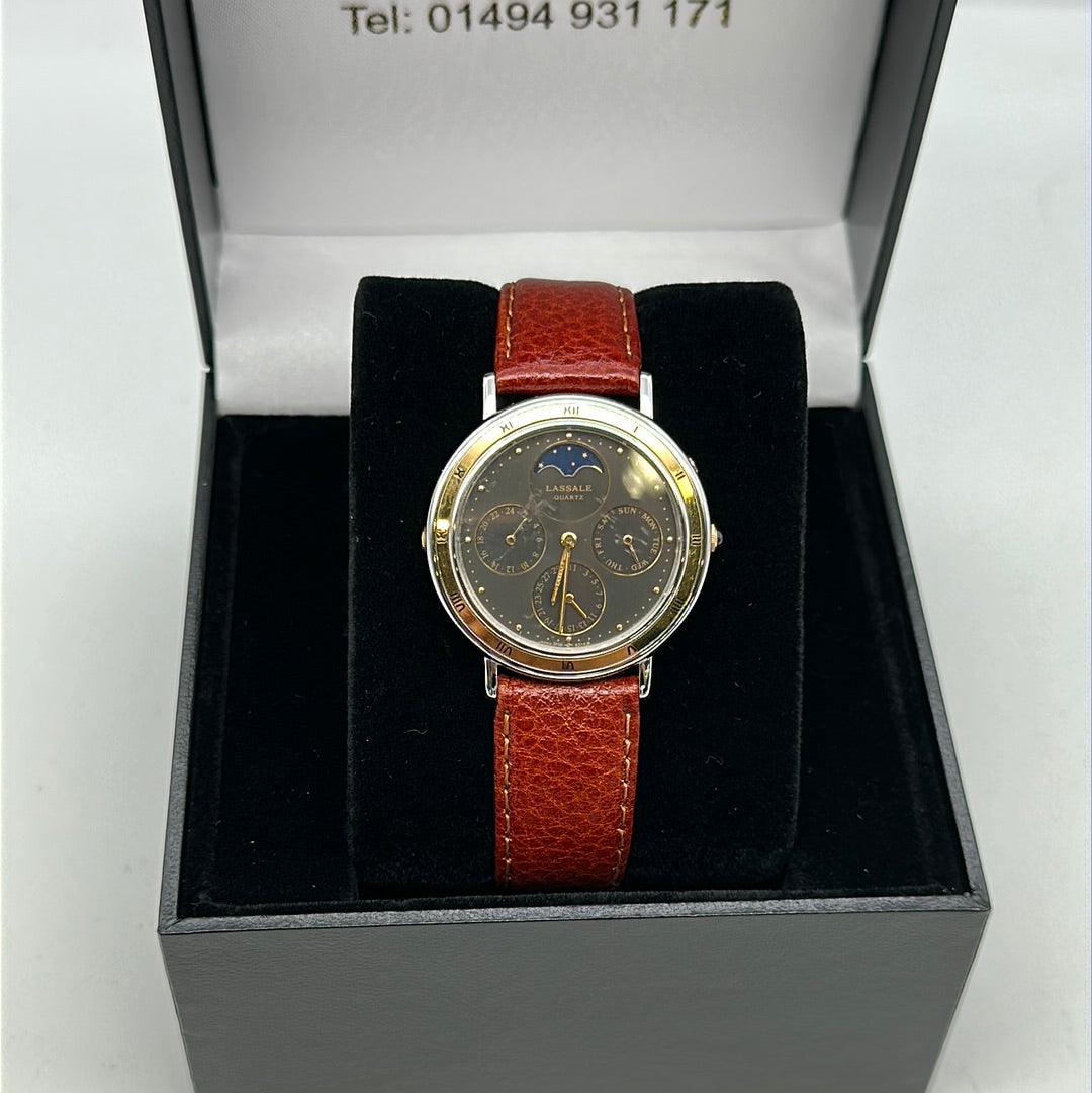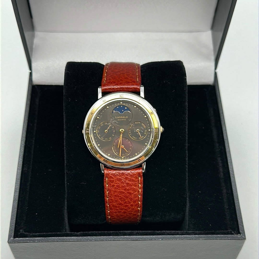 Seiko Lassale moonphase Watch in near unworn condition. This vintage LASSALE lunar calendar moonphase Quartz Watch in very Excellent cosmetic condition. Case is steel with a gold plate bezel, black dial. Hands are gold and original crystal is very clean. Case is 33mm wide excluding crown.